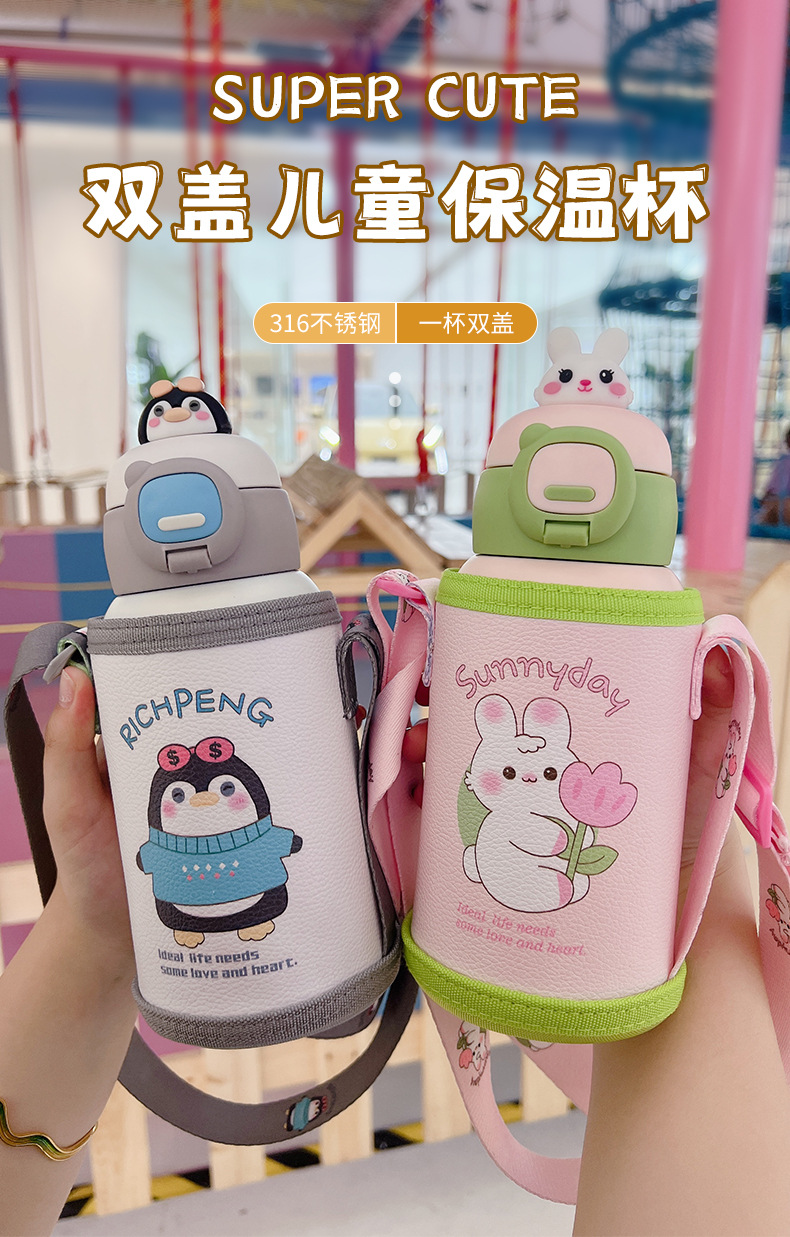 双盖公仔高颜值儿童保温杯316不锈钢杯可爱水杯学生水壶吸管杯子