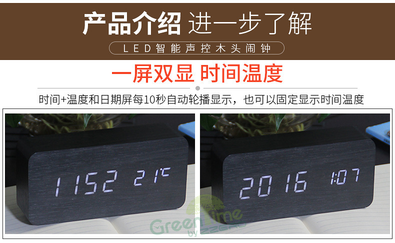功能介绍:◆时间、温度同屏显示 ◆声控功能 ◆日期功能