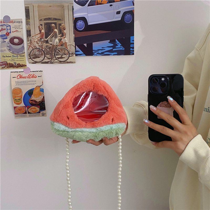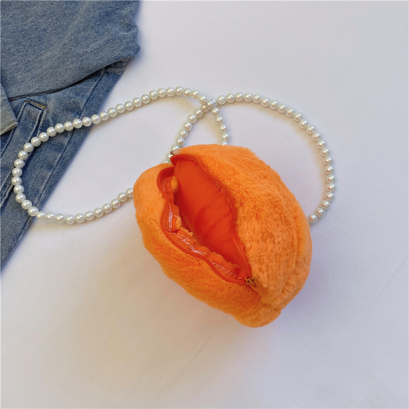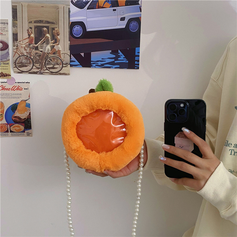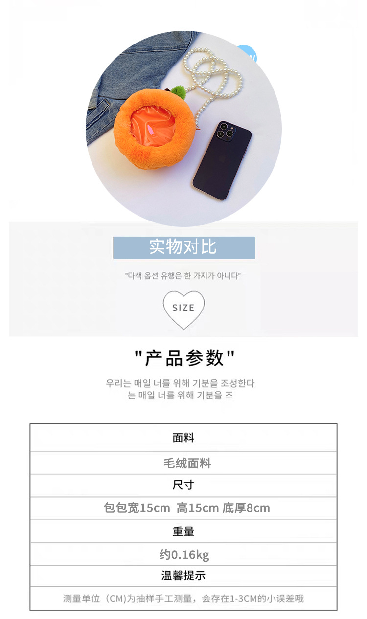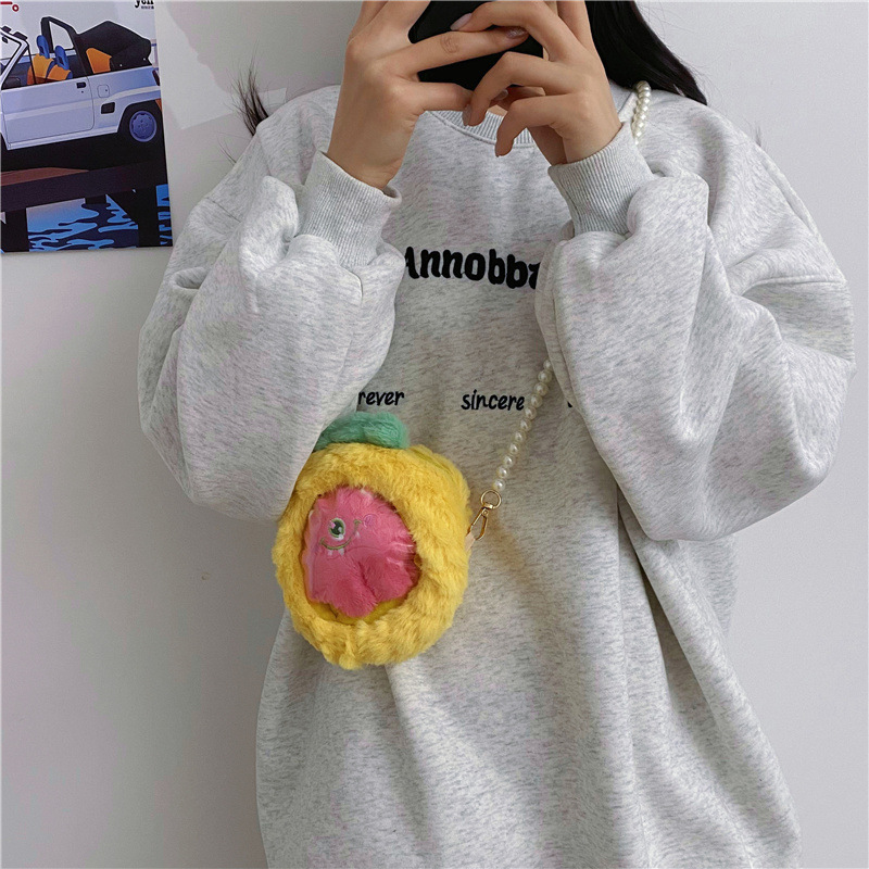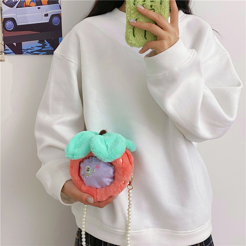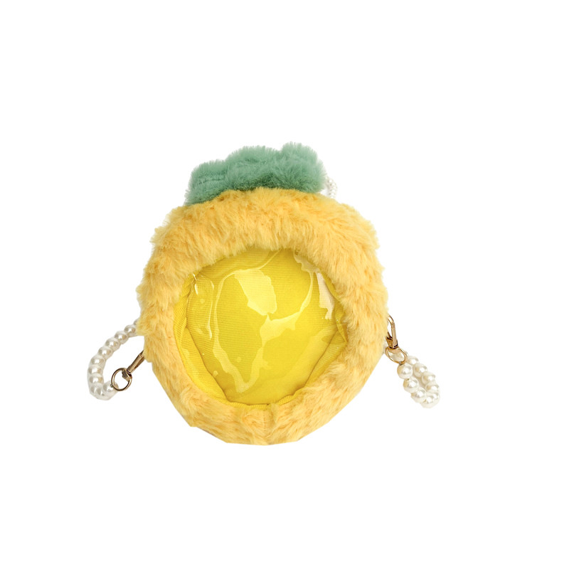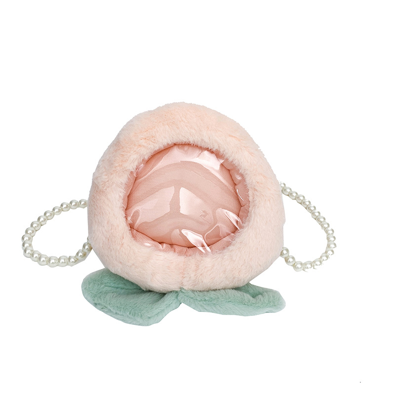 儿童水果透明小痛包可爱卡通小桃子毛绒零钱包少女珍珠链条斜跨包 English | 投诉