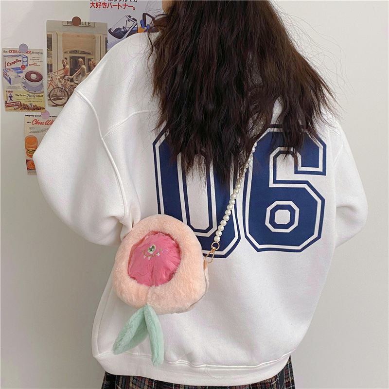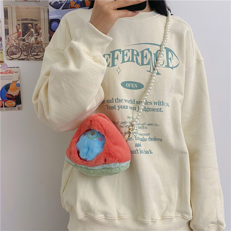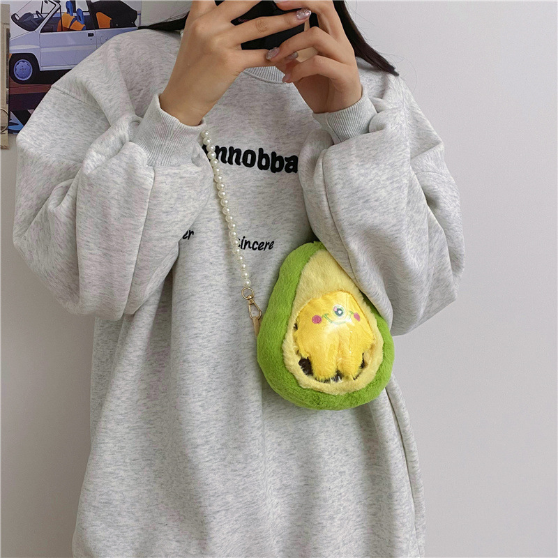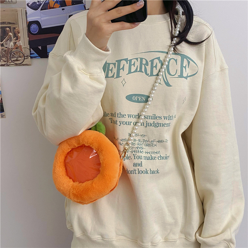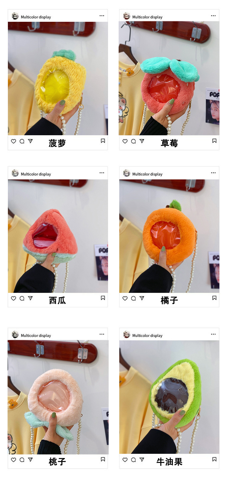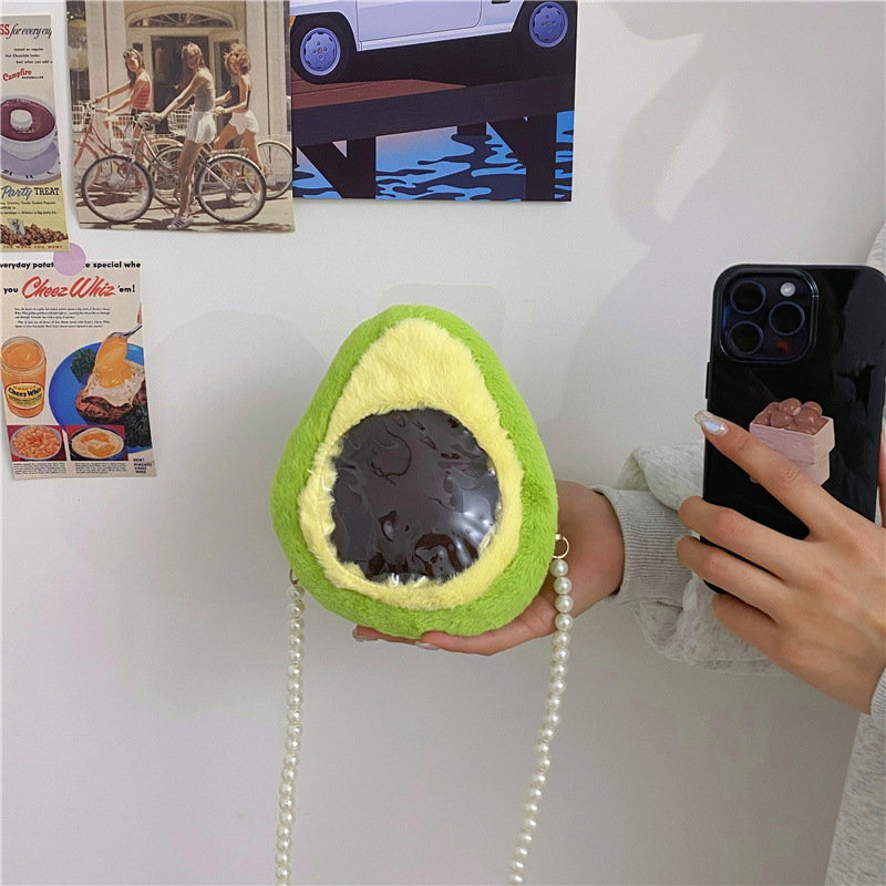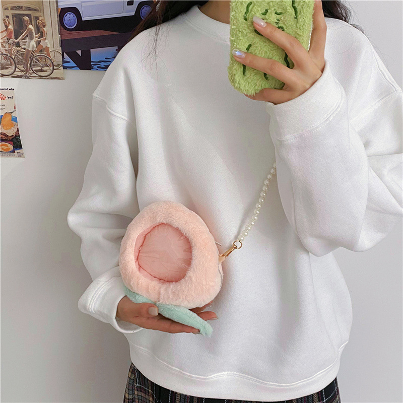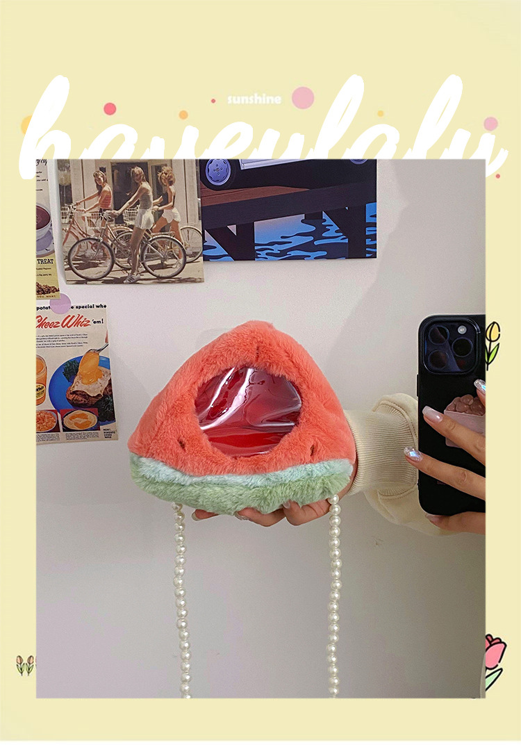 儿童水果透明小痛包可爱卡通小桃子毛绒零钱包少女珍珠链条斜跨包 English | 投诉