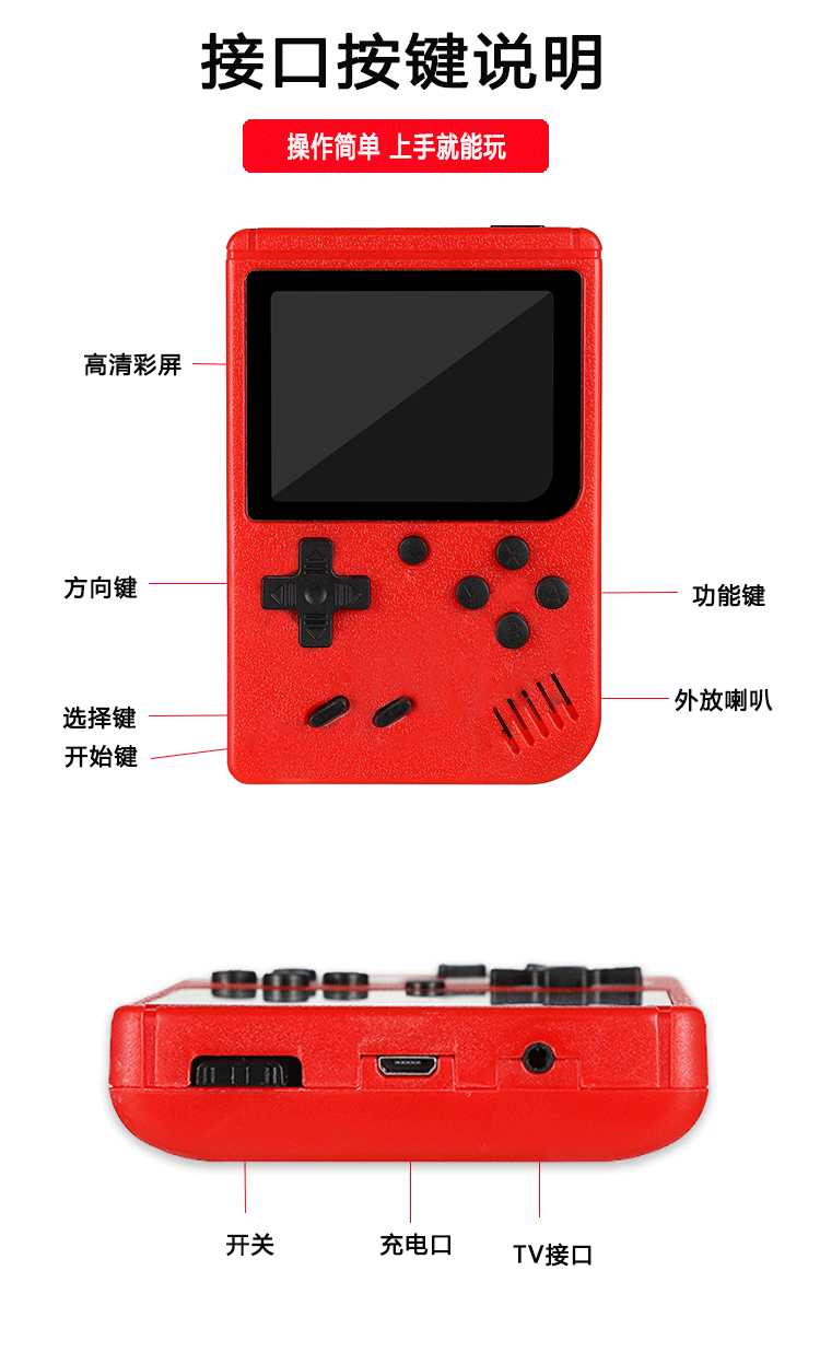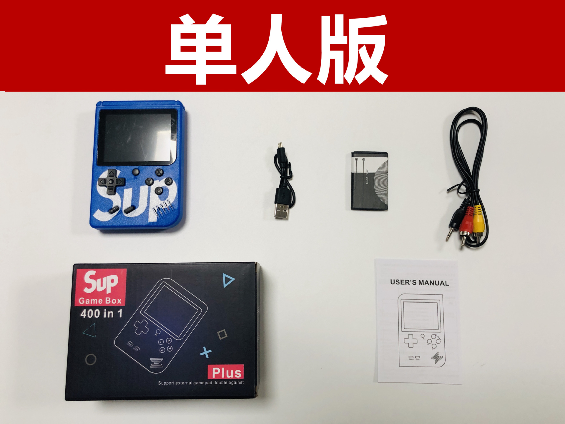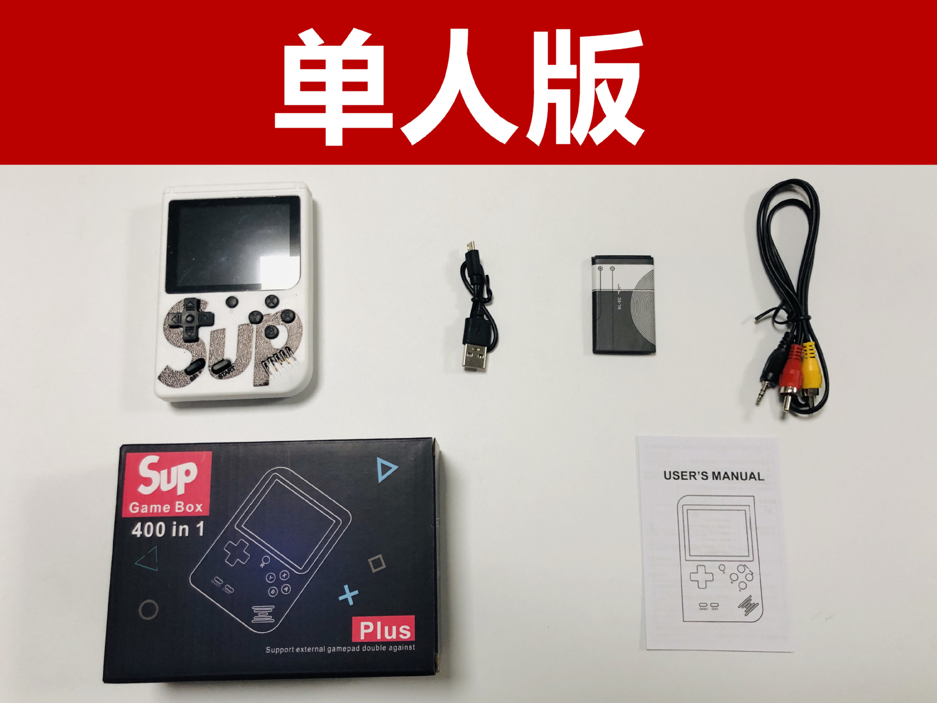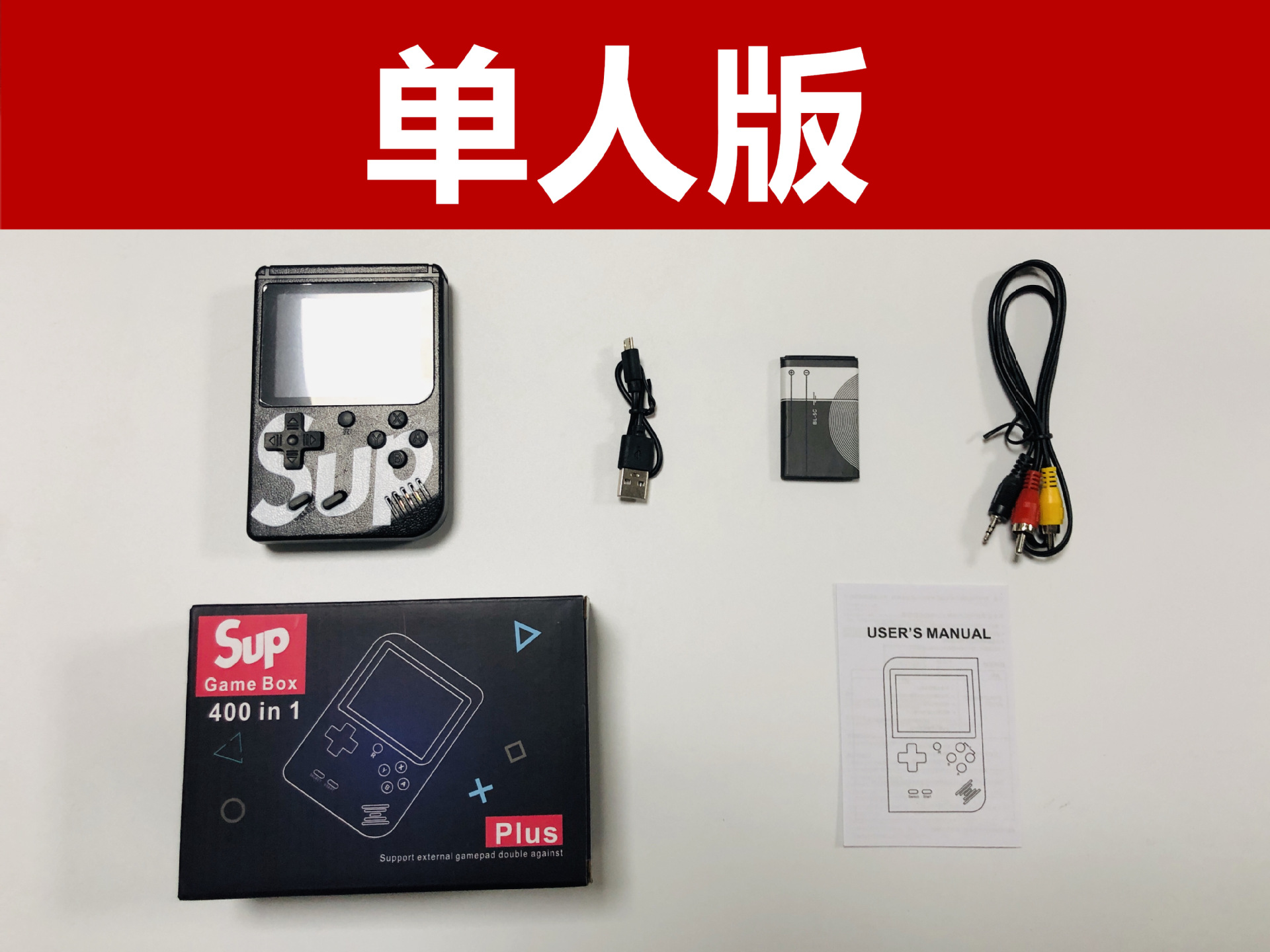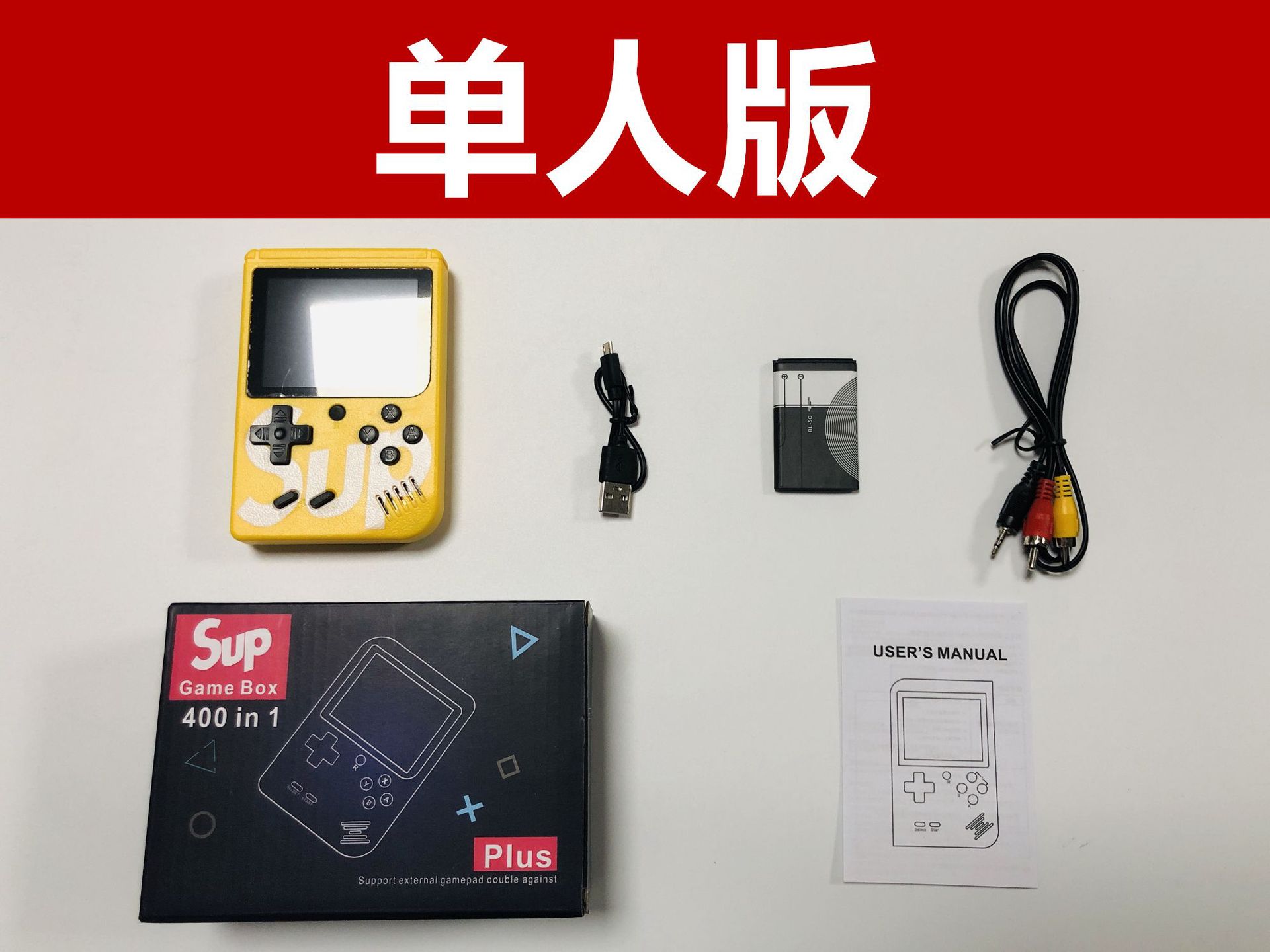 双打包装清单:主机,电池,AV线,充电线,说明书,手柄,包装