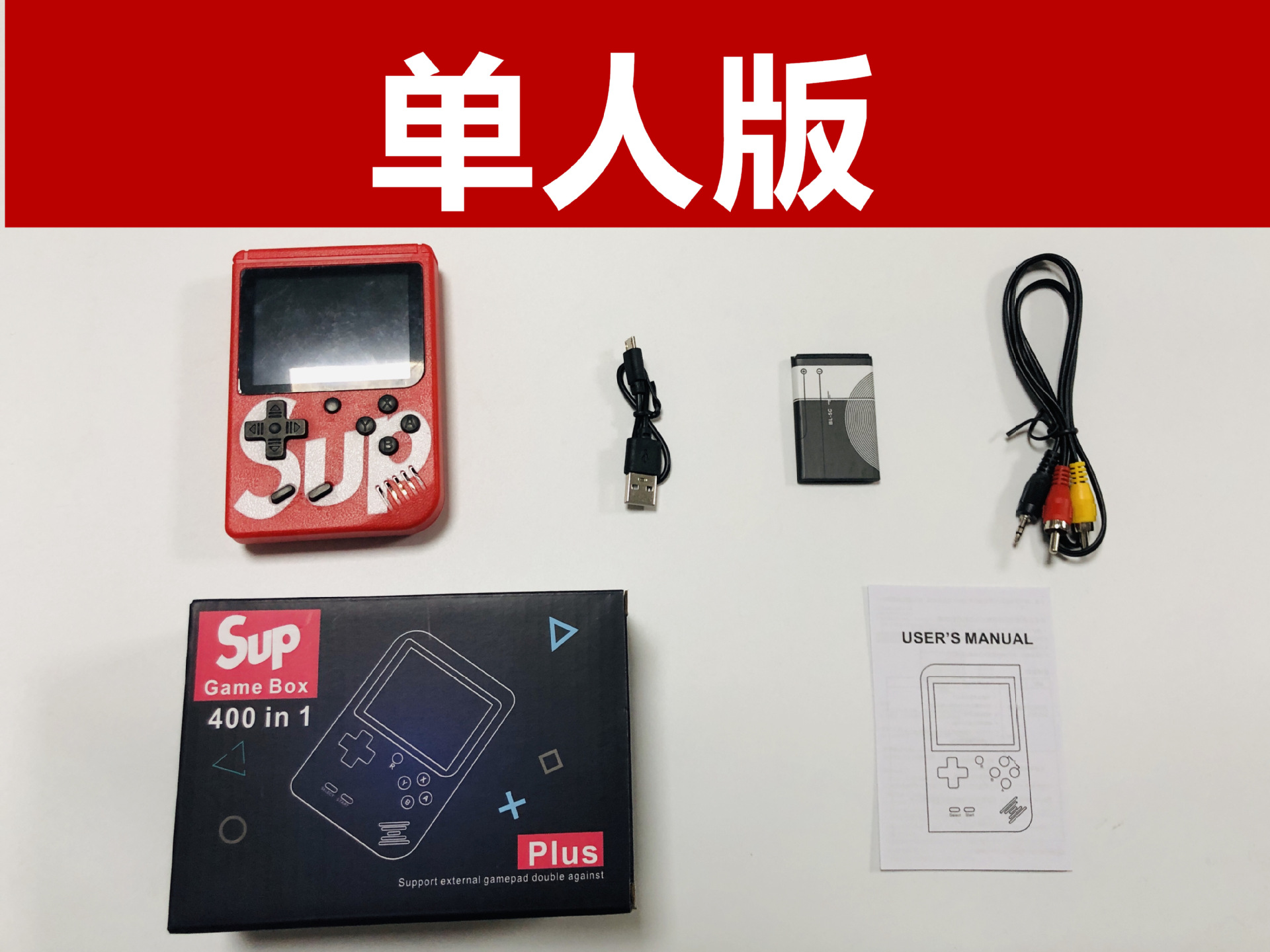 单打包装清单:主机,电池,AV线,充电线,说明书,包装