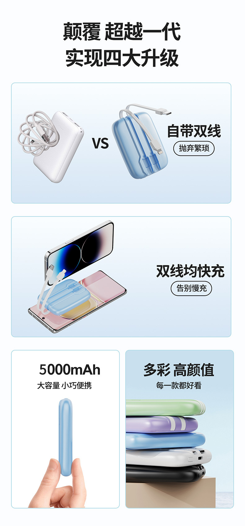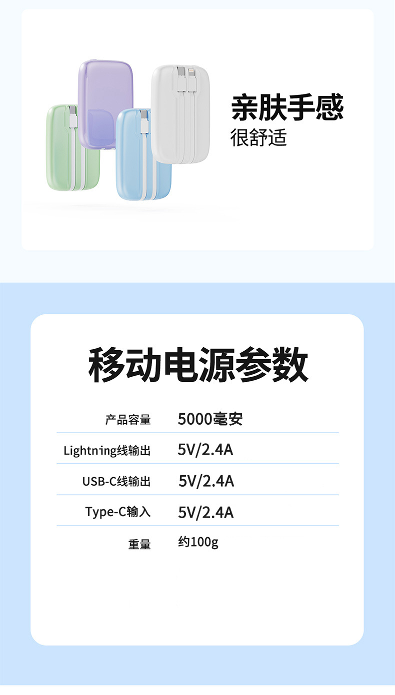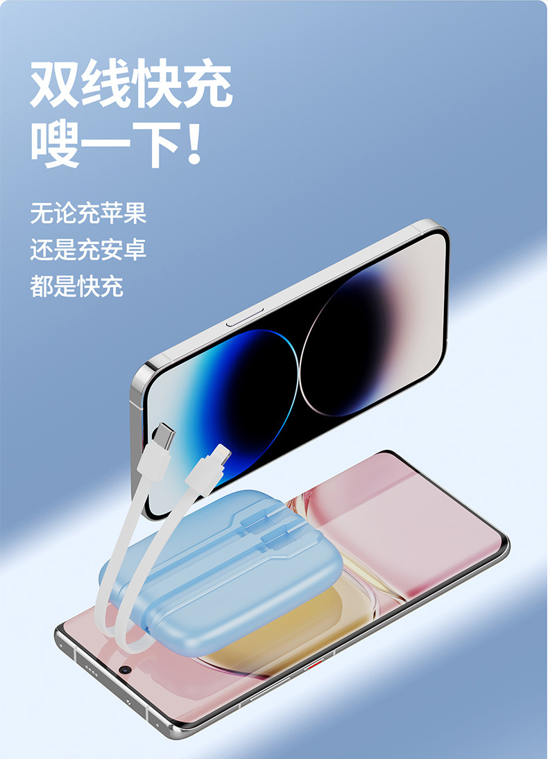 此款充电宝自带苹果线和TYPE-C线,出门只需要一个,详情请咨询客服