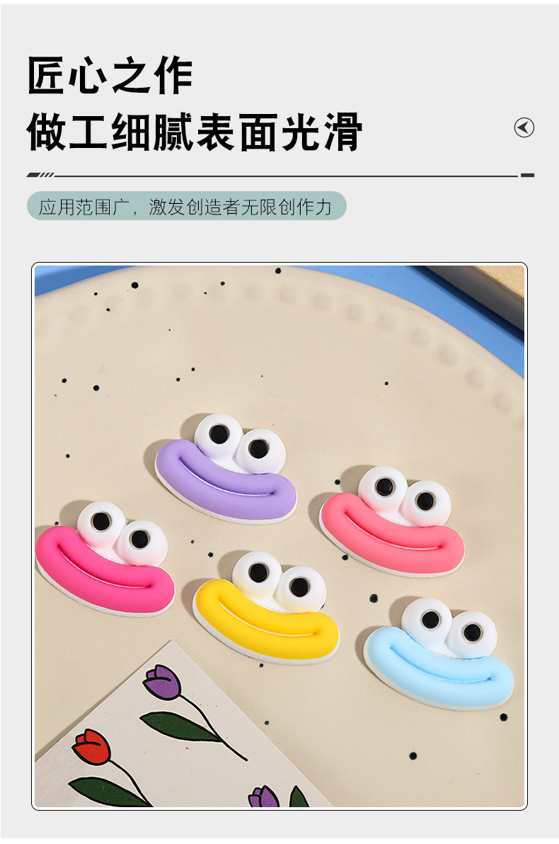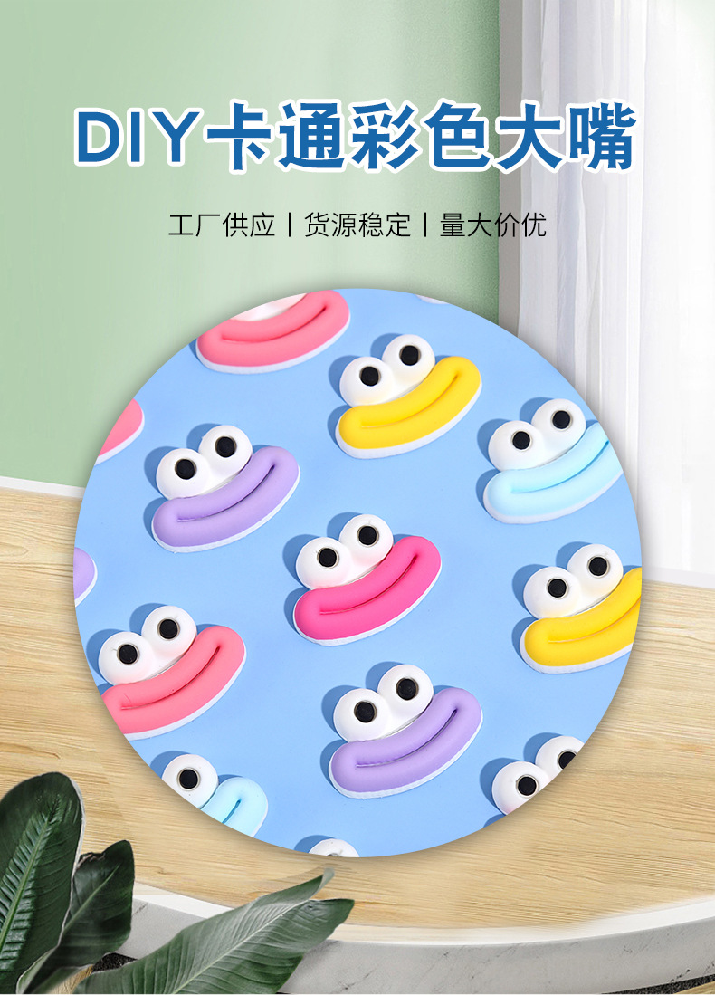 种类: diy饰品配件 材质: 塑料/树脂 处理工艺: 滴油 货号: 卡通彩色大嘴 产地: 义乌 品牌: 炫靓 颜色: 粉色,黄色,紫色,蓝色,玫红 主要下游平台: wish,快手,SHEIN,速卖通,天猫 有可授权的自有品牌: 否 是否跨境出口专供货源: 否