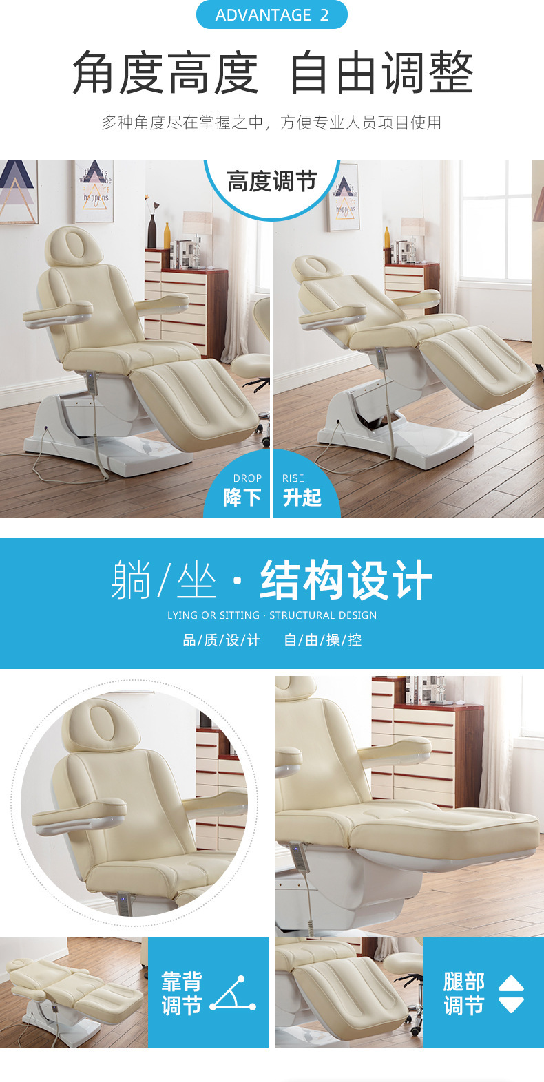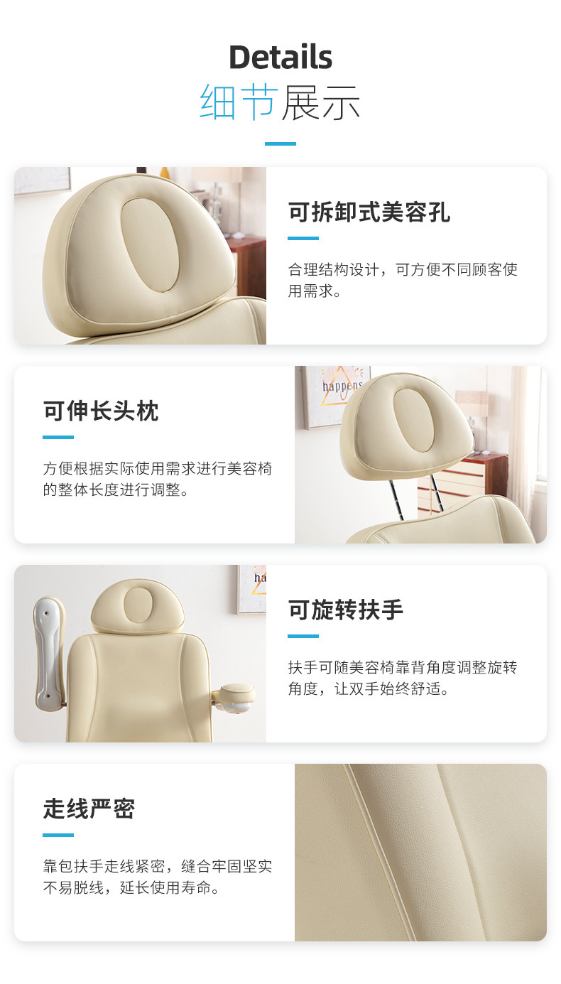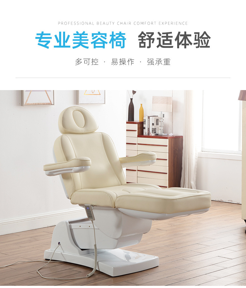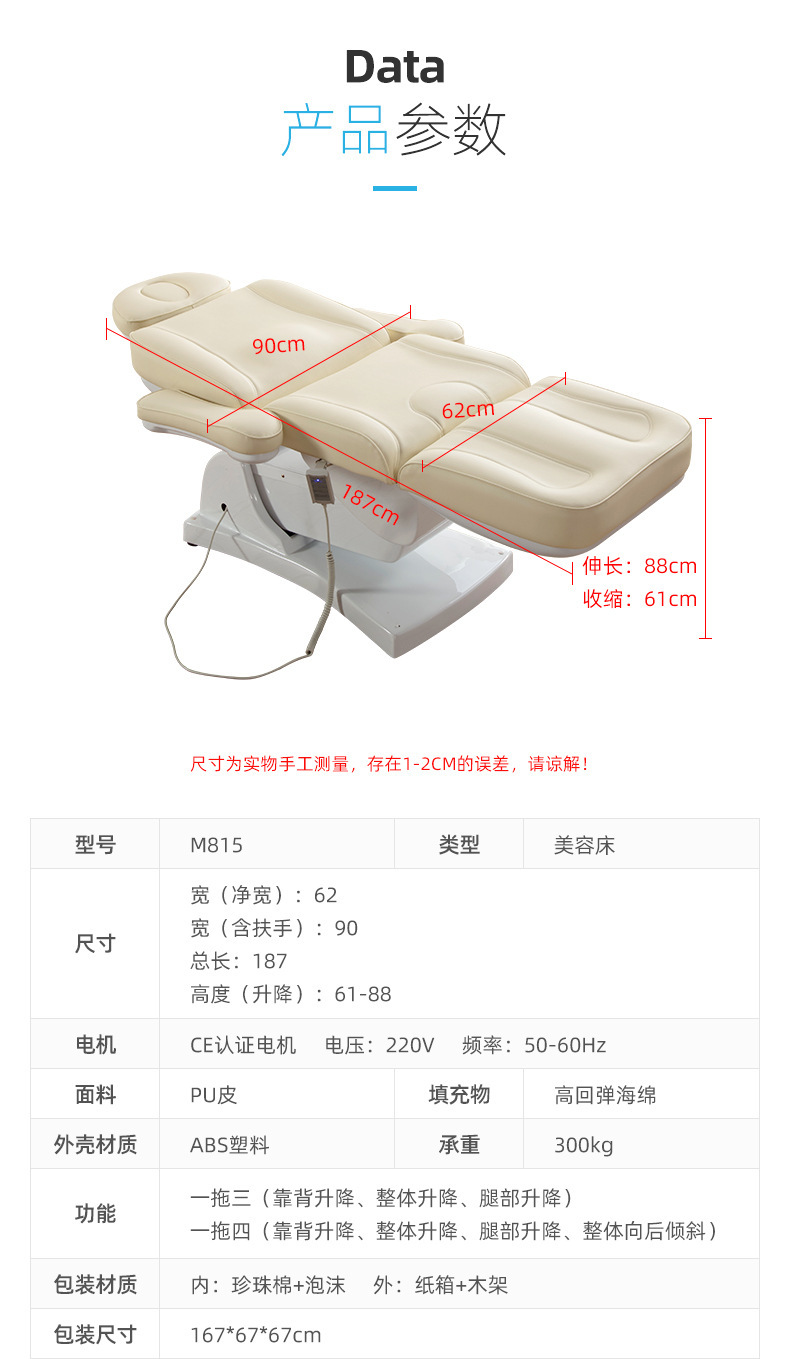 四个电机分别控制靠背,腿部,整体升降,床面整体后仰,座位倾斜。220V欧式两圆插。中性英 文纸箱加夹板条包装。