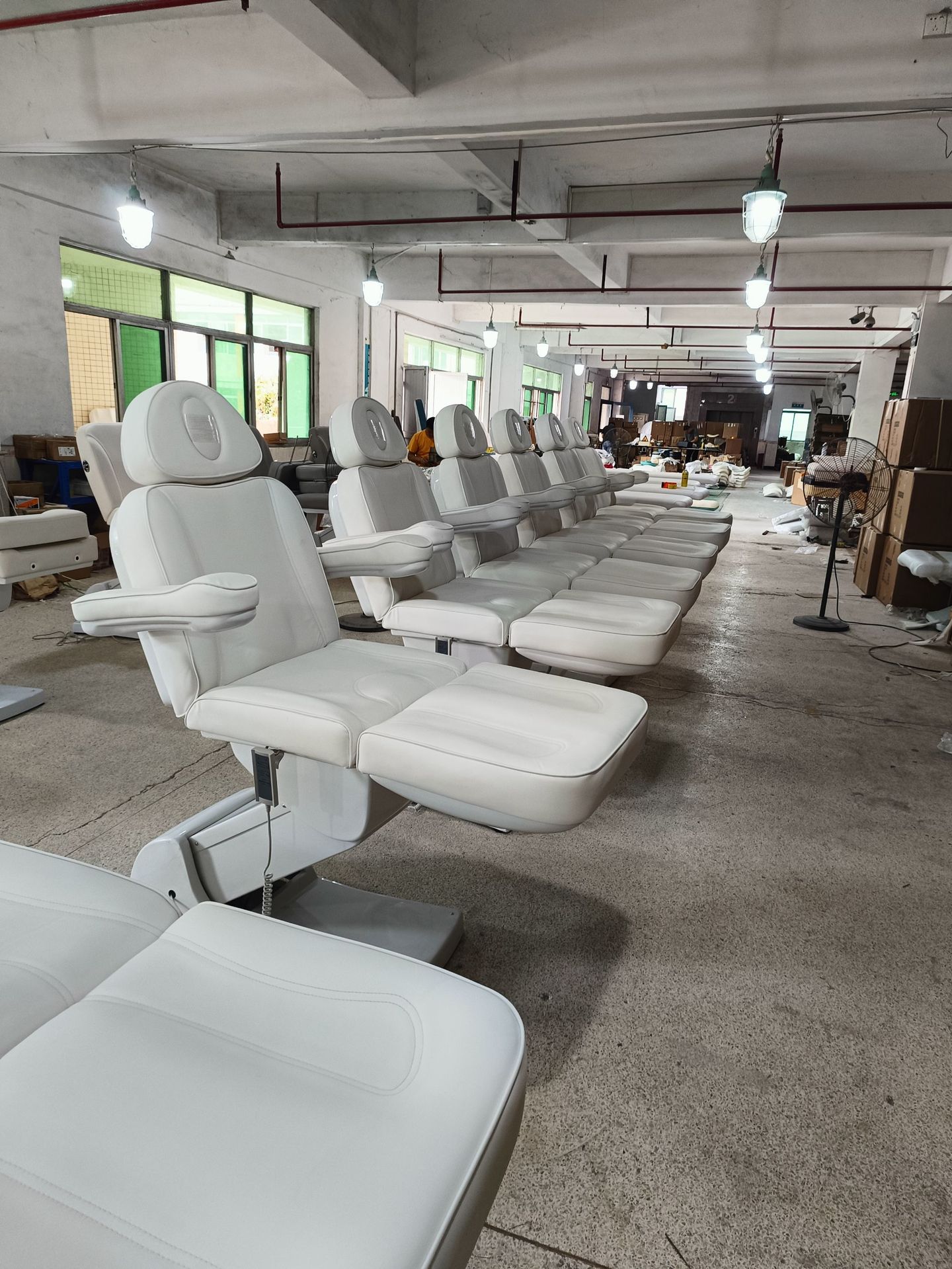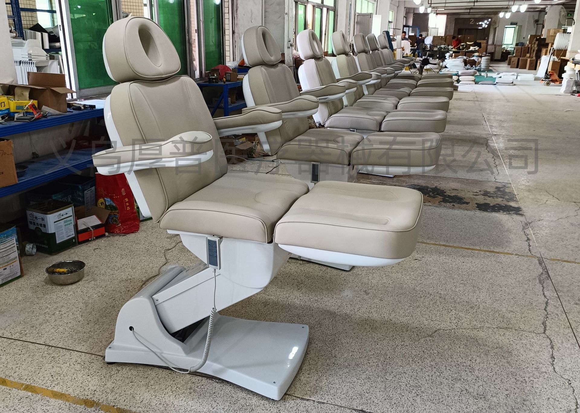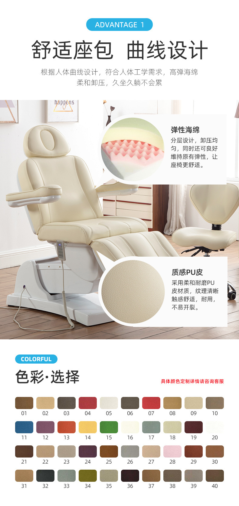 四个电机分别控制靠背,腿部,整体升降,床面整体后仰,座位倾斜。220V欧式两圆插。中性英 文纸箱加夹板条包装。