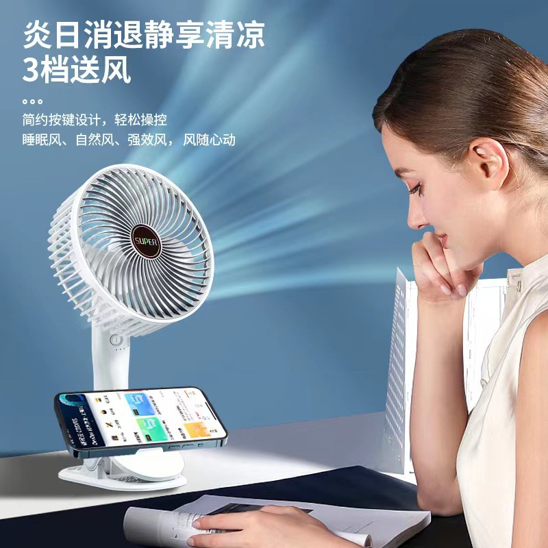 功能:定制电机 静音耐用 可立可夹可挂 夹子可自由拆卸 三档风力调节 上下左右360度调节