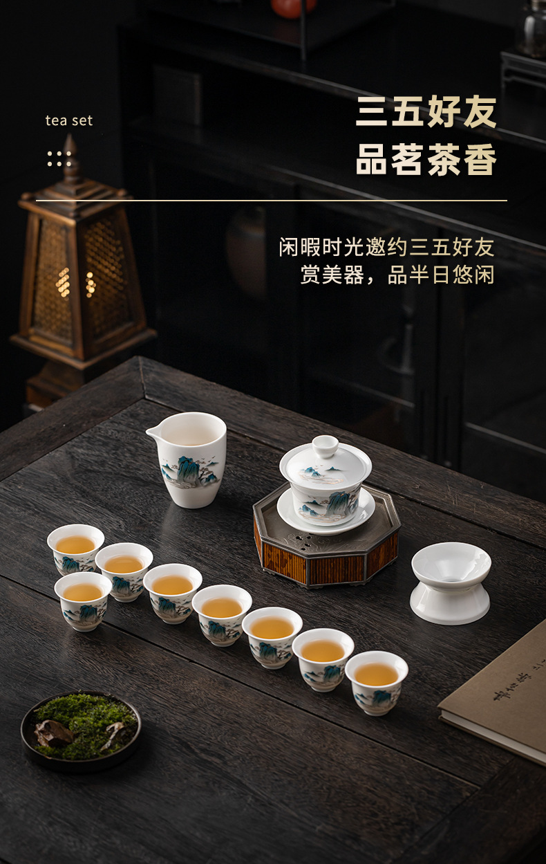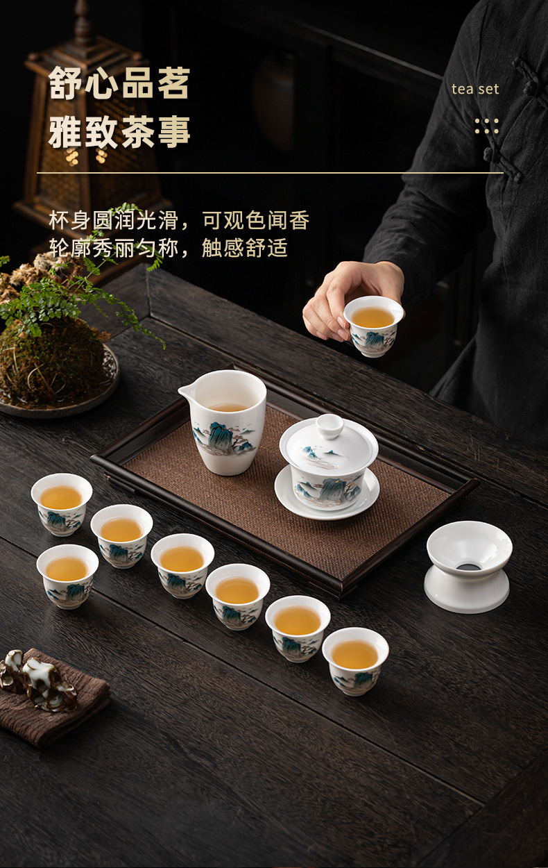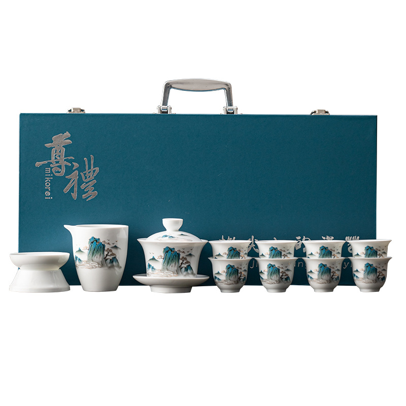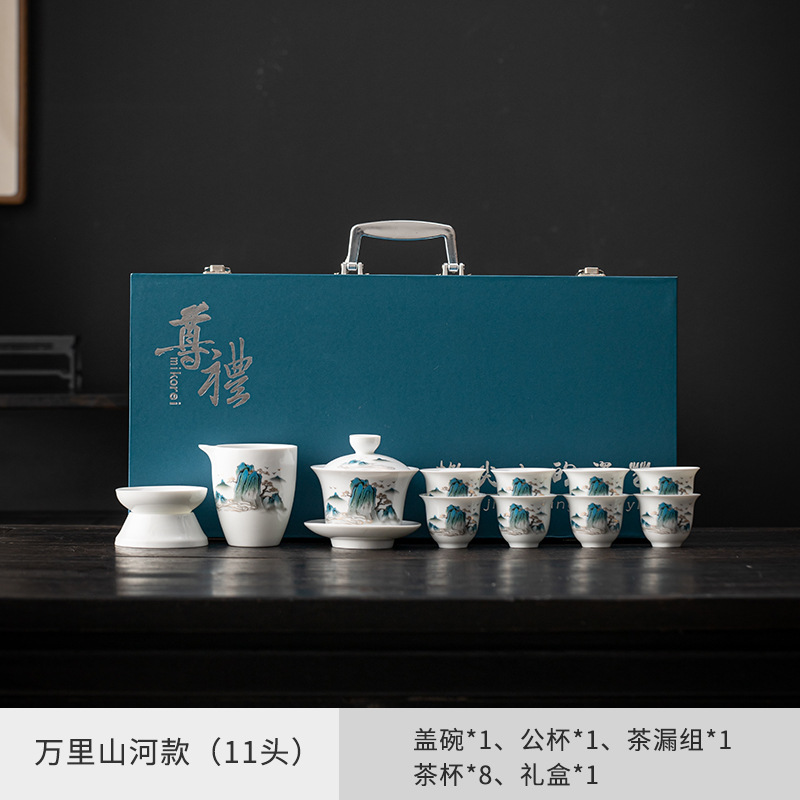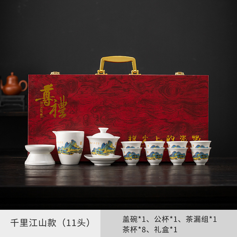 茶具套装礼盒千里江山整套茶具商务伴手礼公司年会羊脂玉瓷茶具