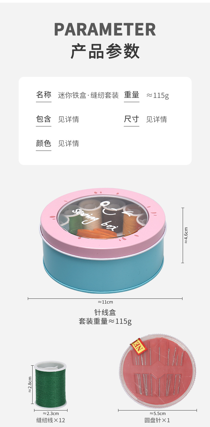 产品类别: 针线包 是否进口: 否 品牌: 中马 货号: jp655 产地: 浙江 箱装数量: 自定义 是否专利货源: 否 毛重: 95g 颜色: 迷你铁盒套装(定制款) 主要下游平台: ebay,亚马逊,wish,速卖通,独立 重量: 0.1 kg/个