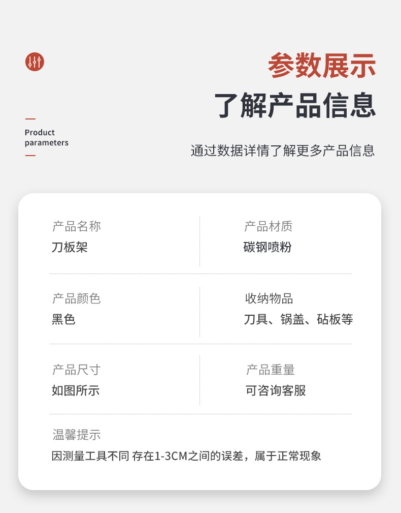品牌: 鸿顶五金 货号: 刀板架 是否进口: 否 材质: 碳钢 产地: 江门 产品上市时间: 2024 价格段: 30-40元 是否有专利: 无 层数(规格): 款式一,款式二 主要下游平台: ebay,亚马逊,wish,速卖通,独立 重量: 1.0 kg/个