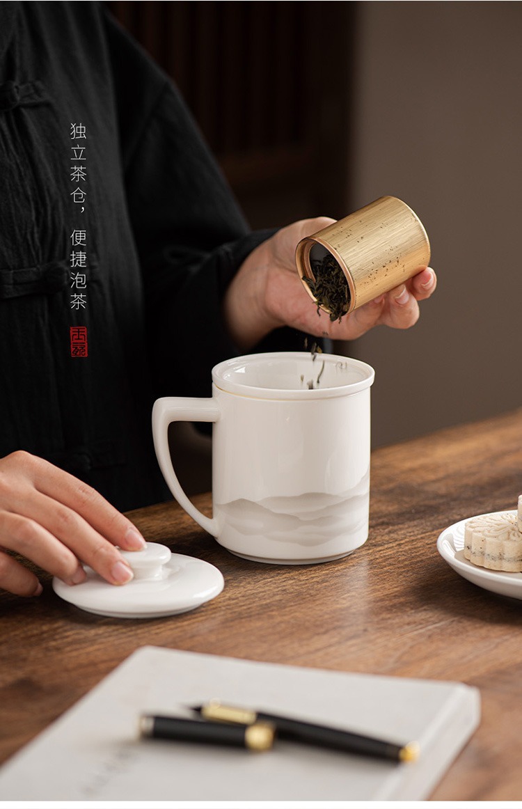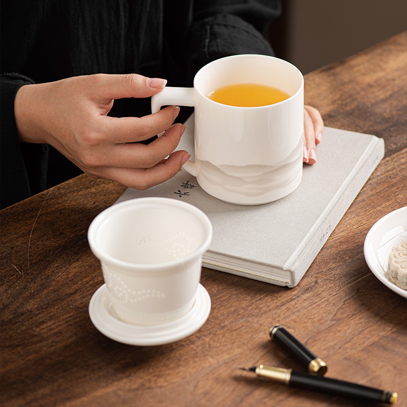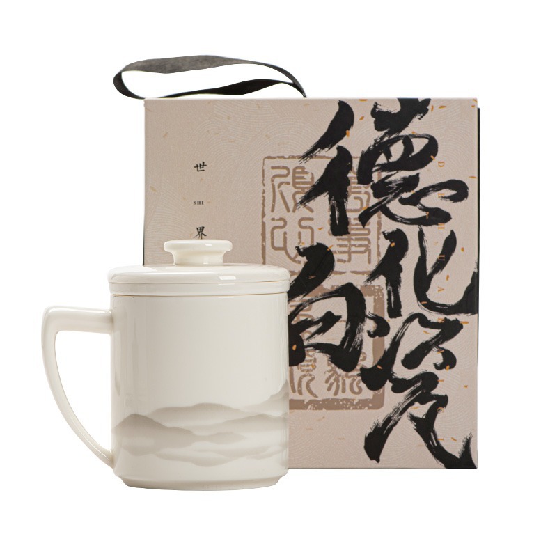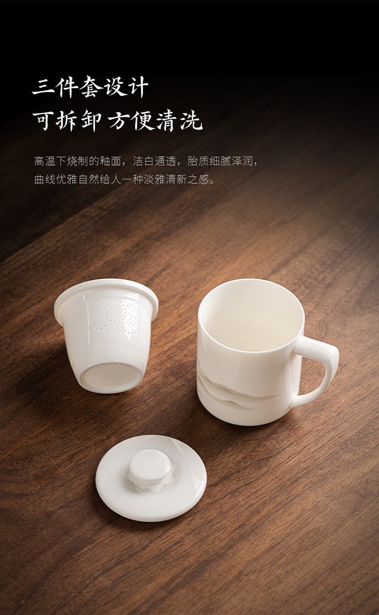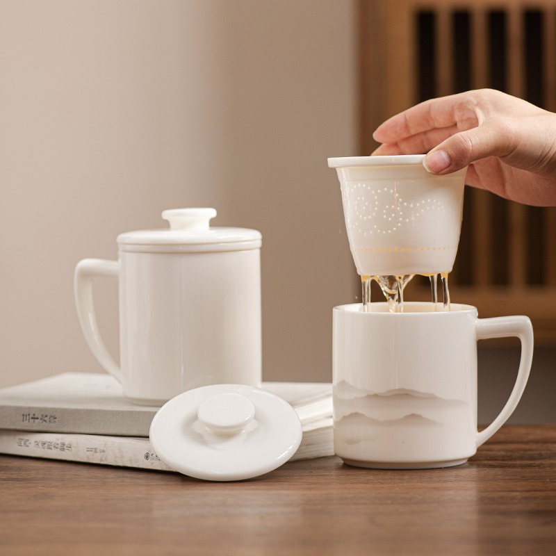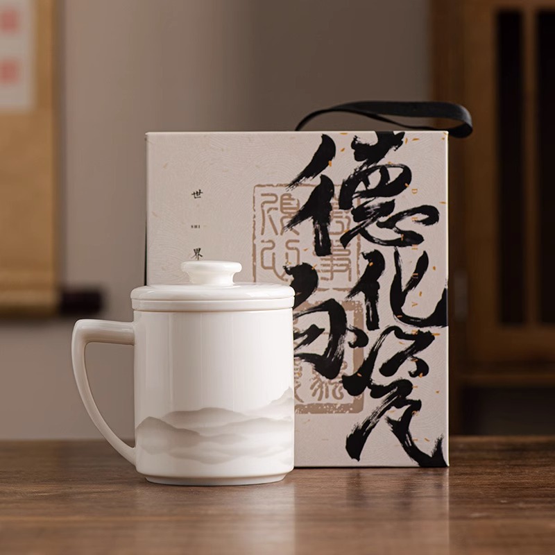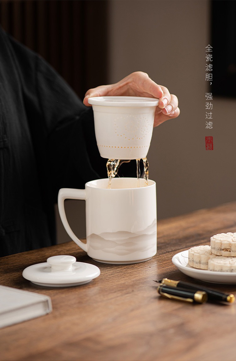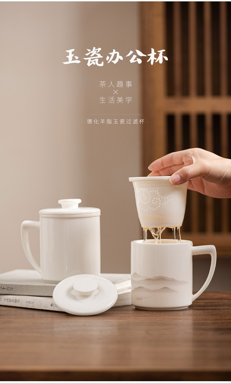 德化羊脂玉茶杯个人专用办公杯陶瓷礼盒茶水分离马克杯过滤定logo