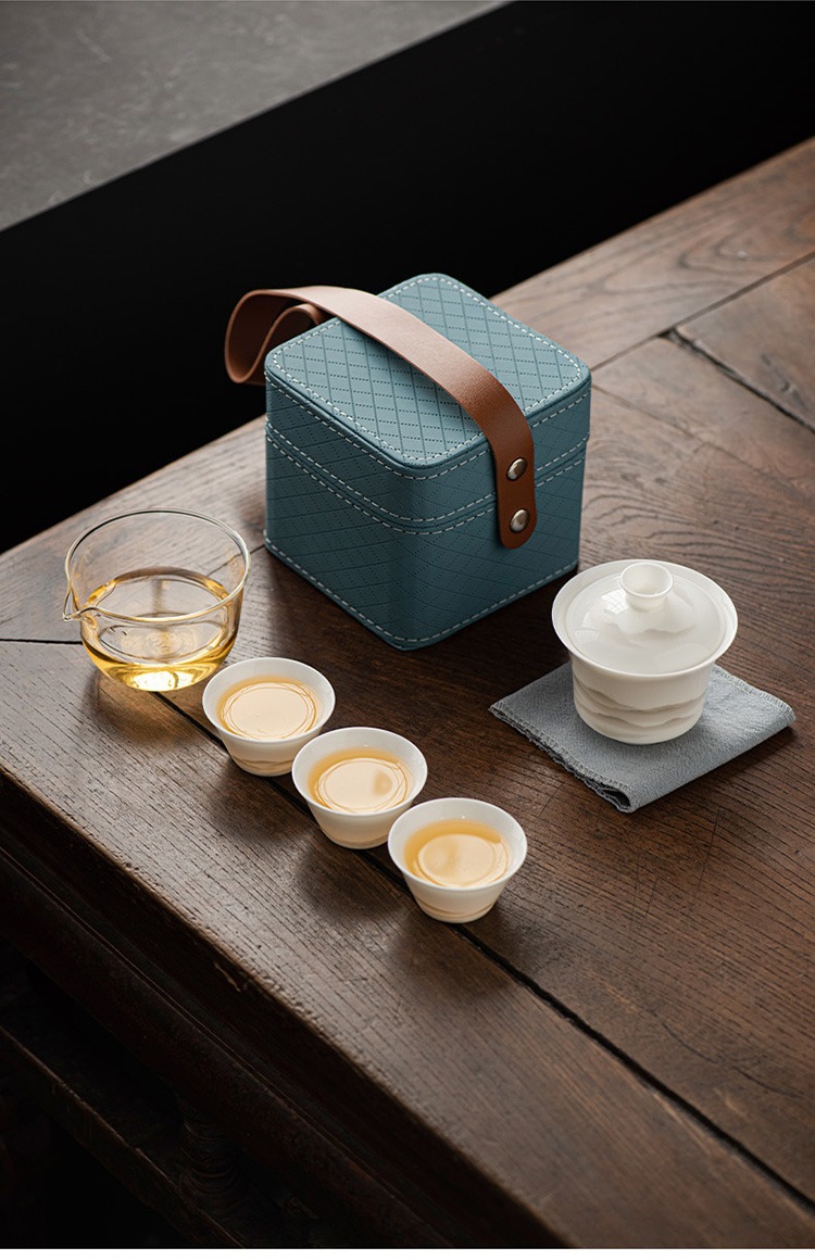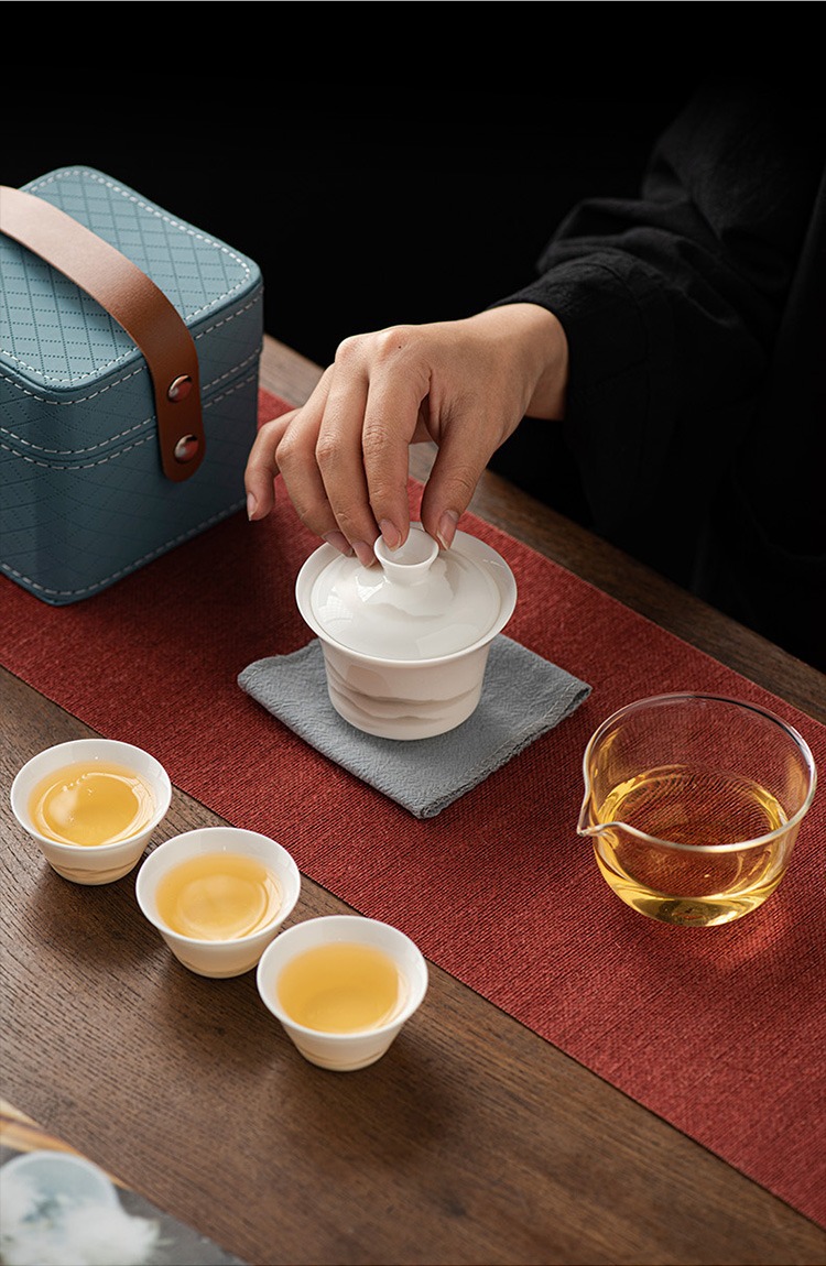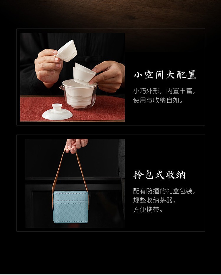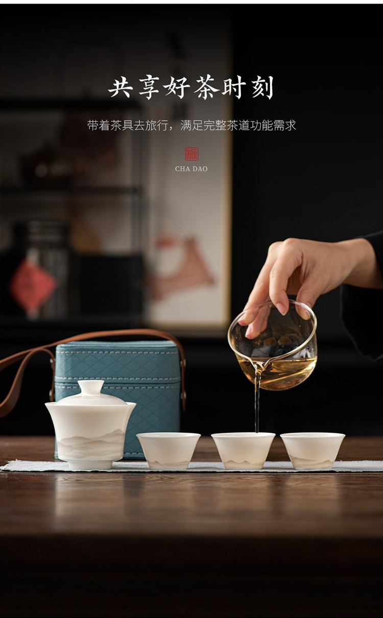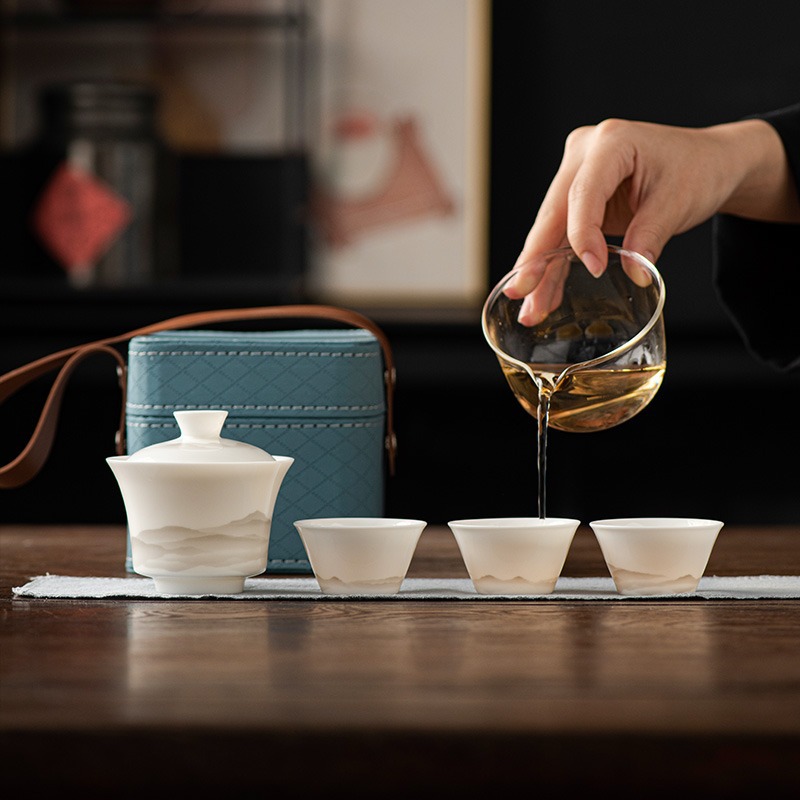 水墨山水白瓷快客杯一壶三杯旅行茶具皮盒便携户外盖碗泡茶具套装
