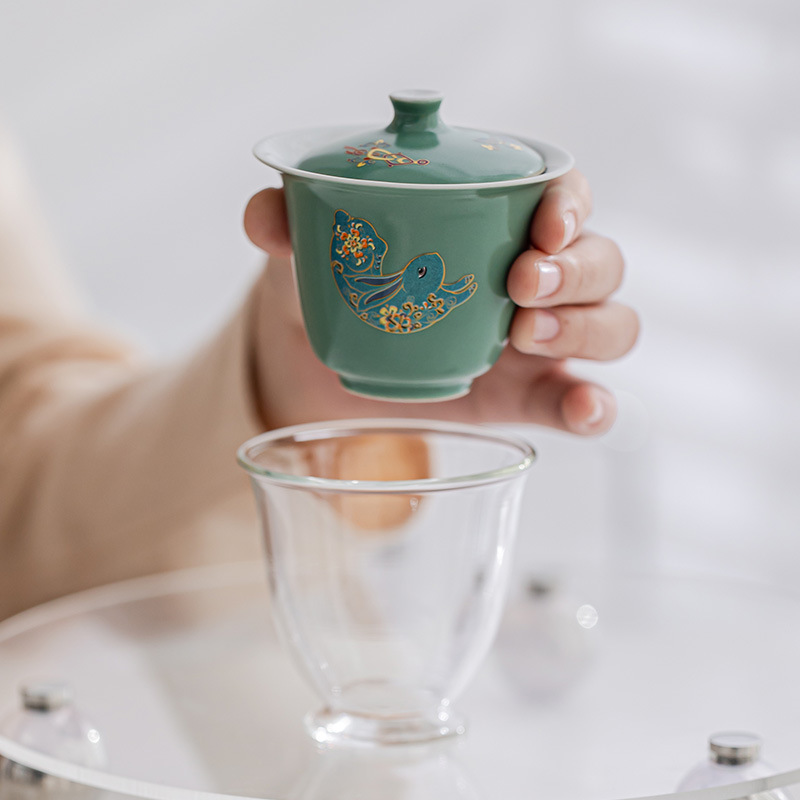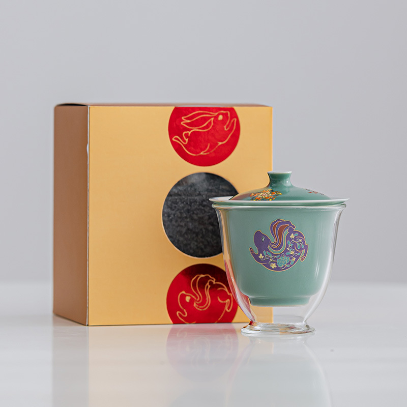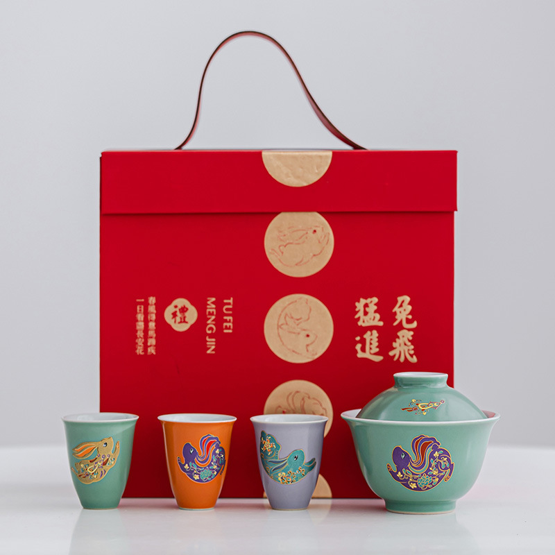 越窑青瓷陶瓷兔年功夫茶具套装盖碗茶壶伴手礼茶杯泡茶组合礼盒装