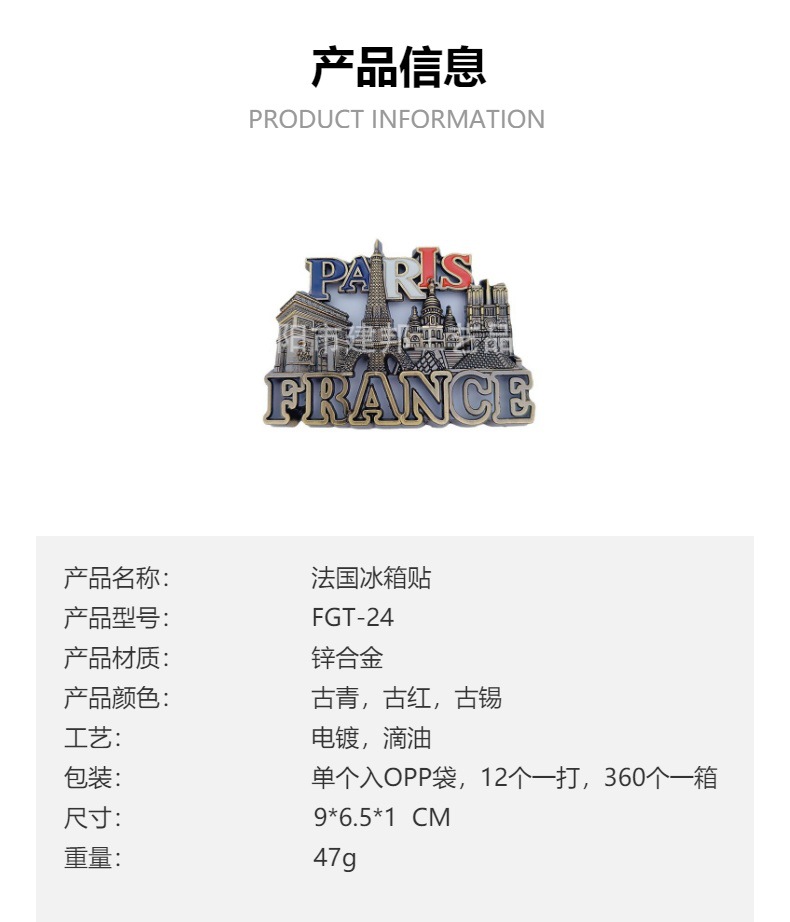 金属旅游纪念品法国巴黎埃菲尔铁塔凯旋门白教堂复古锌合金冰箱贴 投诉