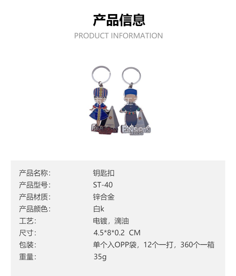 材质: 合金 货号: ST-40 是否进口: 否 合金种类: 锌合金 工艺: 电镀 加工定制: 是 品牌: 建邦 产品编号: ST-40 类别: 钥匙扣 摆挂形式: 挂饰 重量: 0.5 kg/个