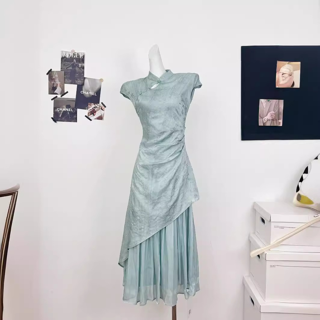 新中式轻国风改良蓝色连衣裙女2024夏新款气质修身包臀温柔风长裙