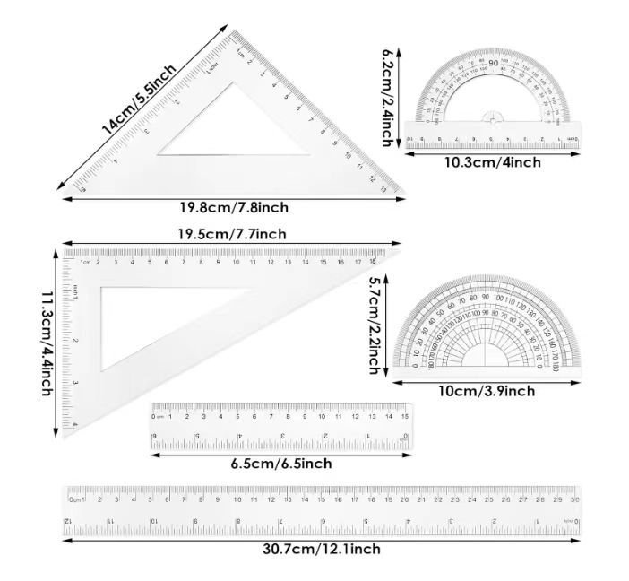 六件套 直角三角18CM+等腰三角13CM实心半圆+空心半圆30+15直尺