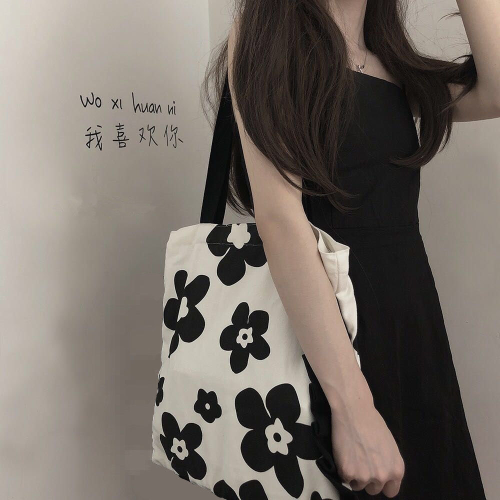 夏韩版ins帆布包黑白泫雅花朵女学生时尚百搭单肩包大容量购物袋 English | 投诉