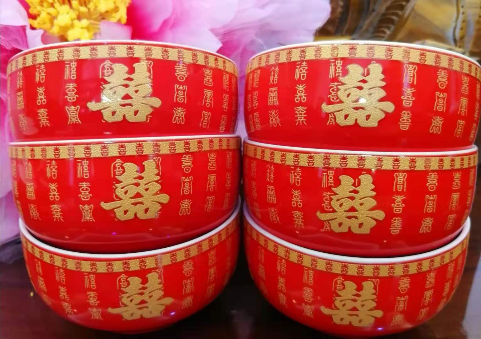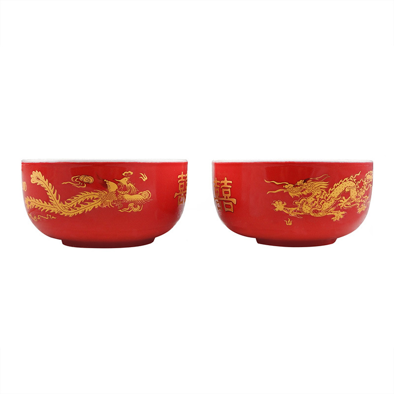 厂家供应结婚用喜庆红碗陶瓷龙凤双喜红碗中国红单碗喜碗婚庆用品