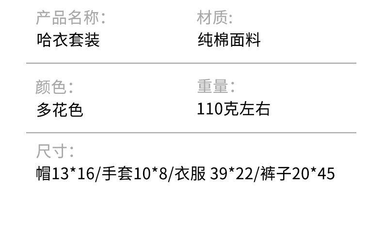 安全等级: A类 面料名称: 棉 适用性别: 中性/男女均可 货源类别: 现货 颜色: 男宝宝款,女宝宝款,其他款式随机发货 适合年龄段: 新生儿(0~1岁,80cm及其以下) 上市年份季节: 2024年春季 平车针距12~14针/3cm: 是 风格: 休闲 适合身高: 新生儿 重量: 0.3 kg/套