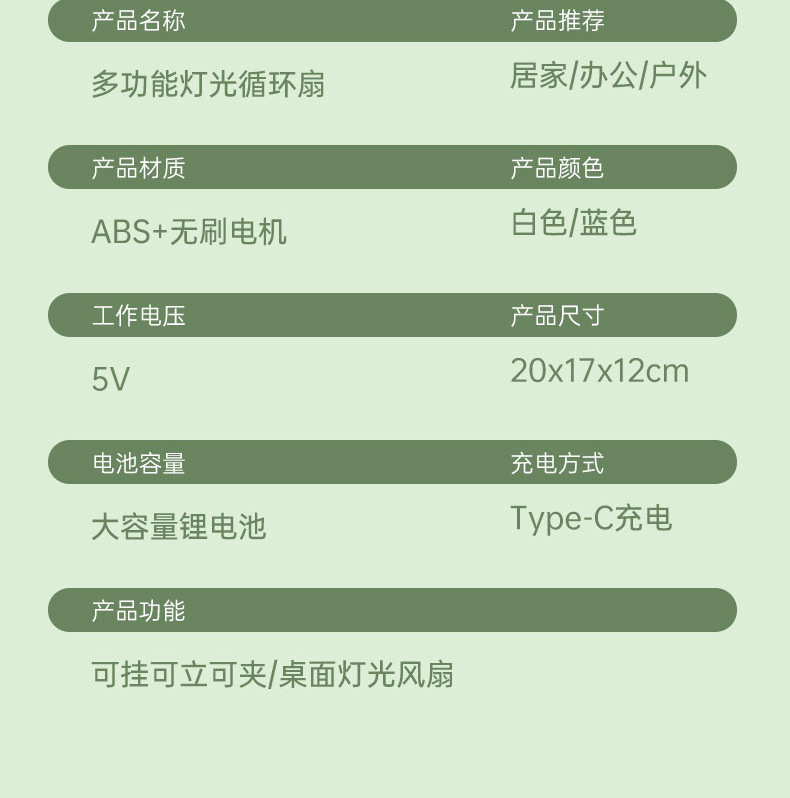 电源方式: 锂电池 噪音: 36dB(含)以下 品牌: 锂电池 风速档位: 3档 是否支持充电: 支持 颜色: 蓝色,白色,蓝色(灯光升级款),白色(灯 扇叶直径: 标配,高配 货号: d89 主要下游平台: ebay,亚马逊,wish,速卖通,独立 主要销售地区: 日韩,非洲,韩国,日本,欧洲,南美,东南 重量: 0.5 kg/个