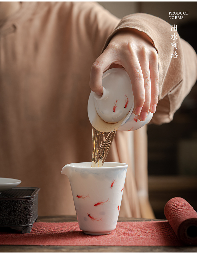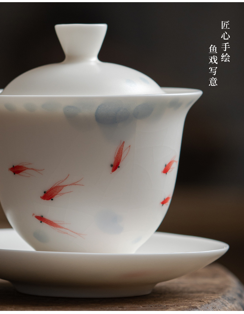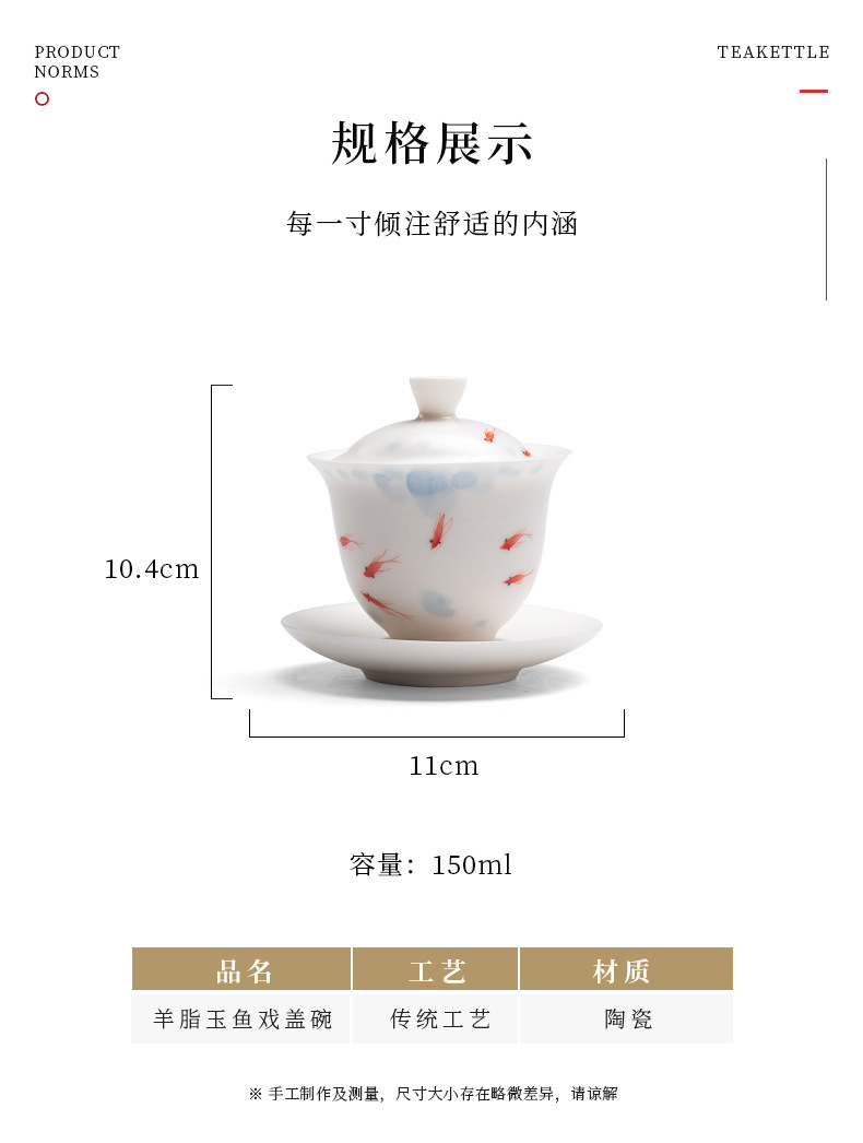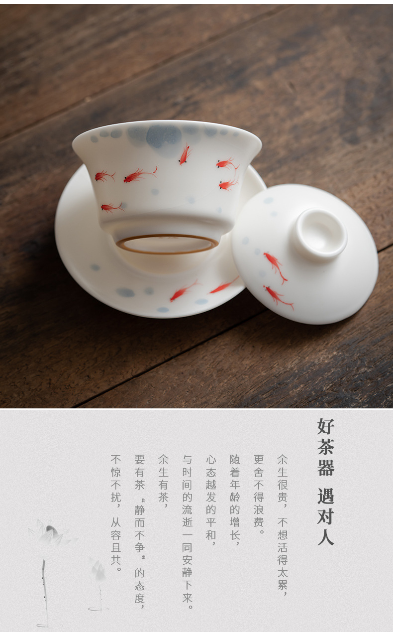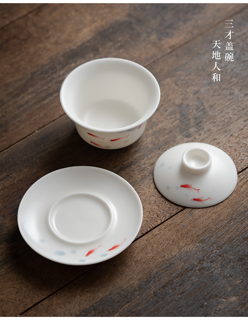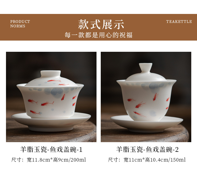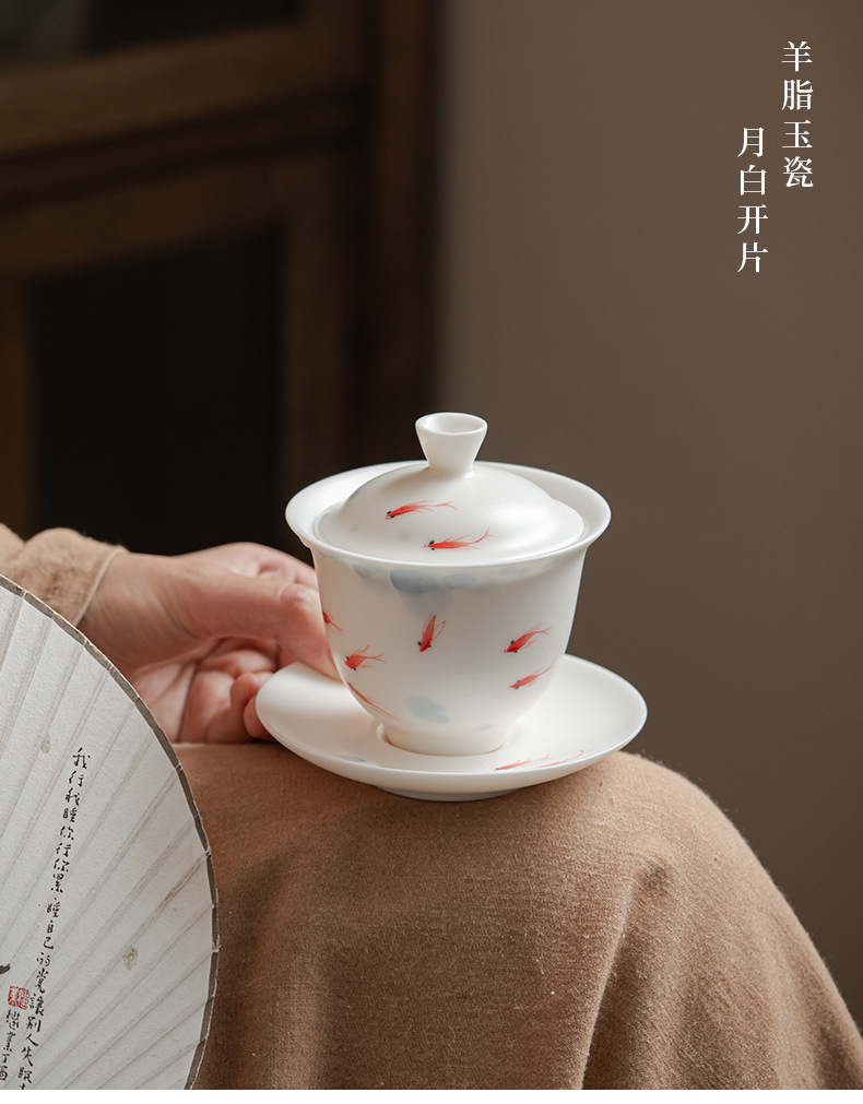 羊脂玉白瓷手绘可悬停三才盖碗茶杯单个大容量陶瓷茶碗高级三件套 English | 投诉