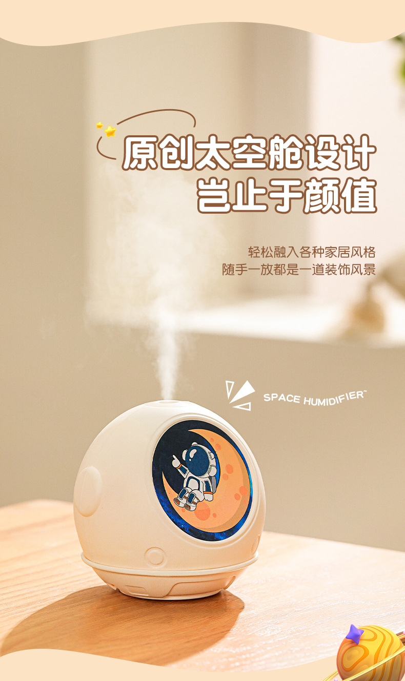跨境新款迷你加湿器便携式家用桌面卡通太空宇航员加湿器氛围灯 English | 投诉