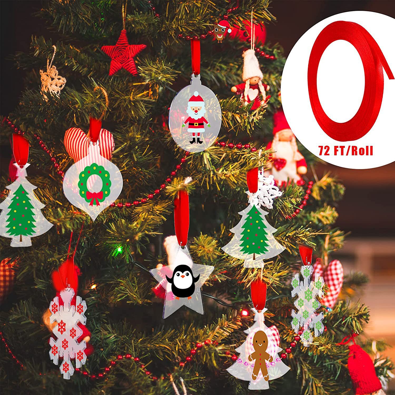 产品配件:24个圆形圣诞挂件(每款4个,共6款),22米红色丝带产品尺寸:亚克力厚度是2mm,尺寸见下图详情产品包装:盒装产品重量:160克