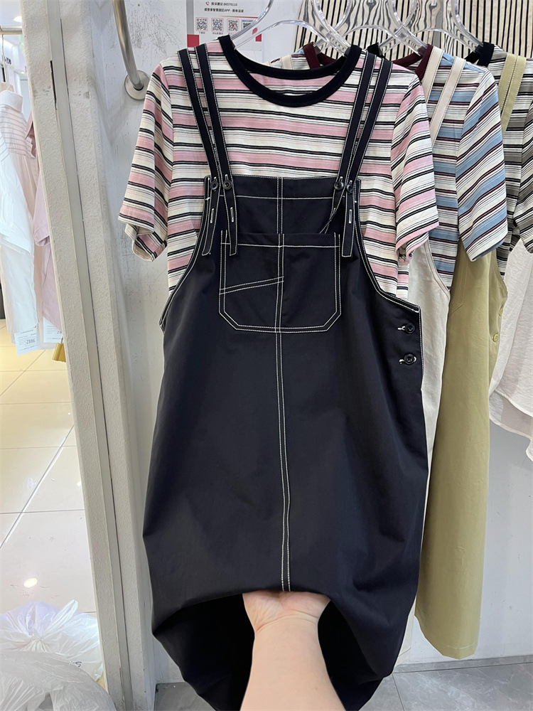 2024夏季新款条纹百搭圆领短袖上衣T 恤纯色口袋吊带裙时尚套装女