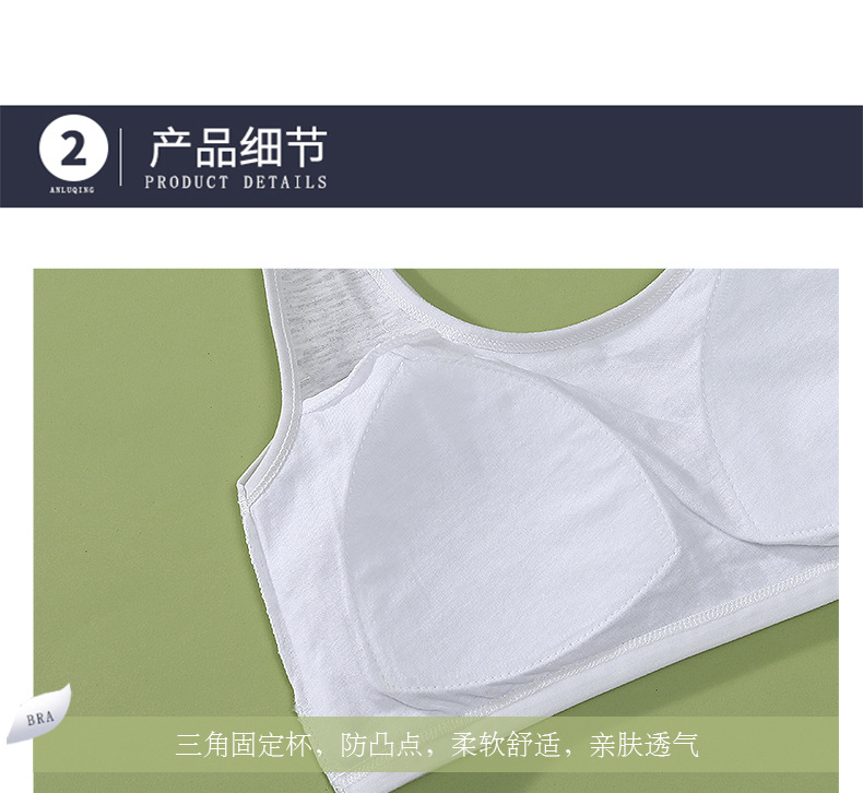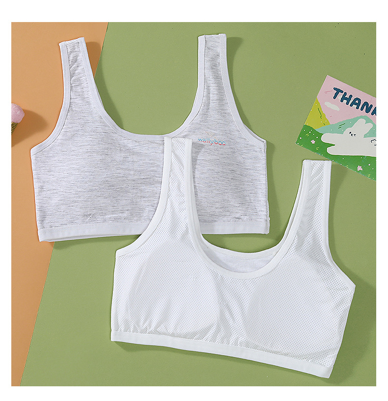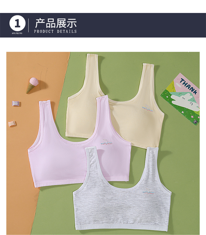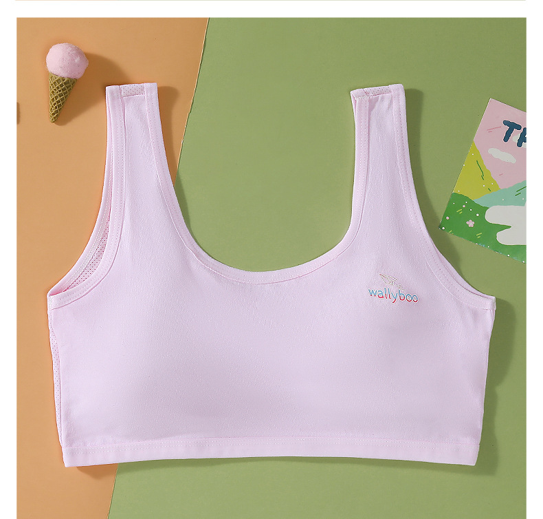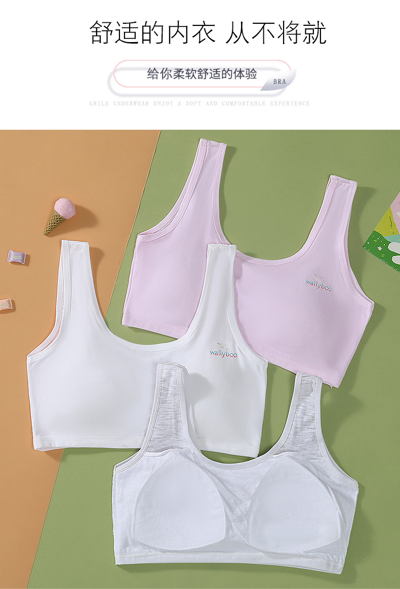 适用人群: 二阶段(约12~15岁) 面料名称: RC棉 款式: 背心式 主面料成分: 棉 里料成分: 棉 里料成分含量: 50%(含)-70%(不含) 罩杯型: 全罩杯 模杯类型: 薄模杯 模杯面料: 海绵 是否有钢圈: 无钢圈 重量: 0.5 kg/件