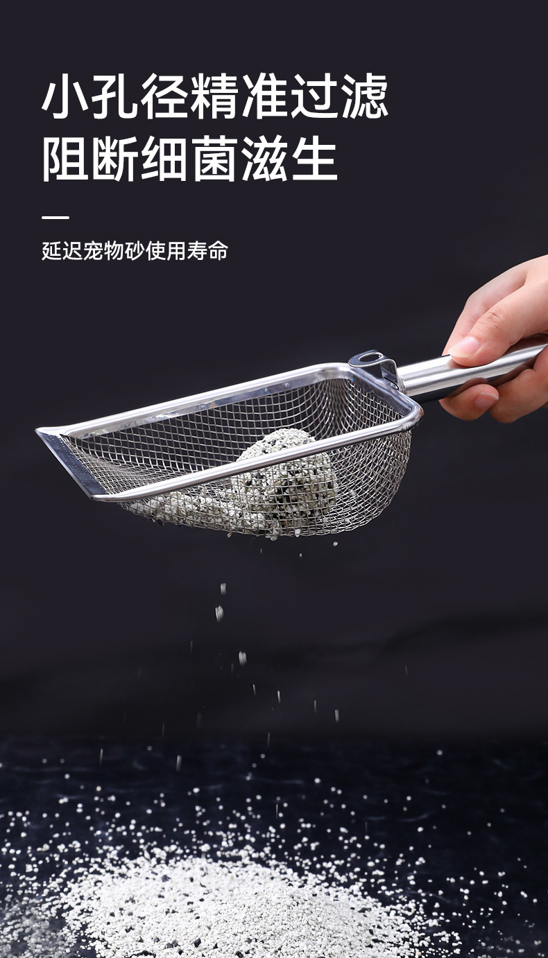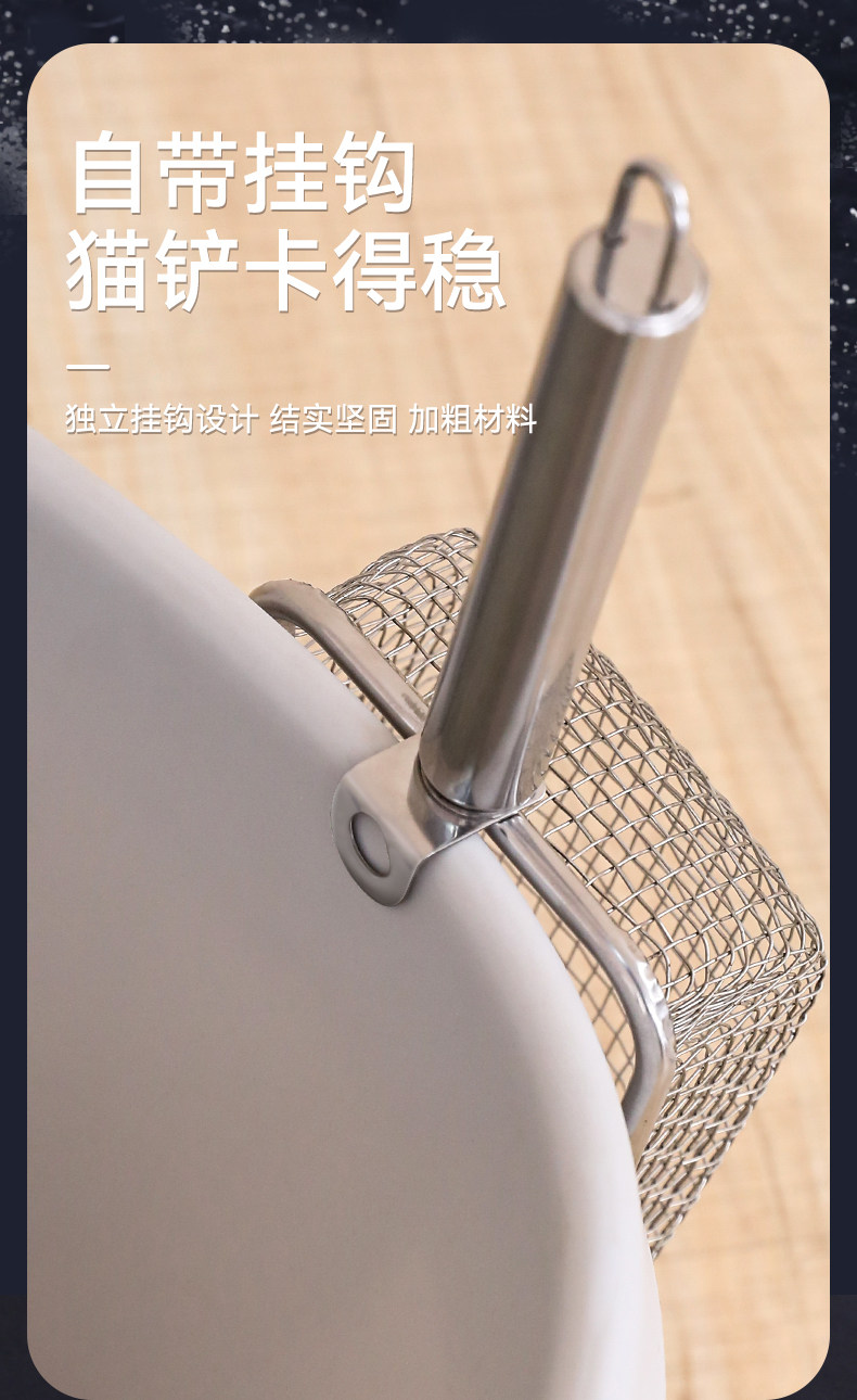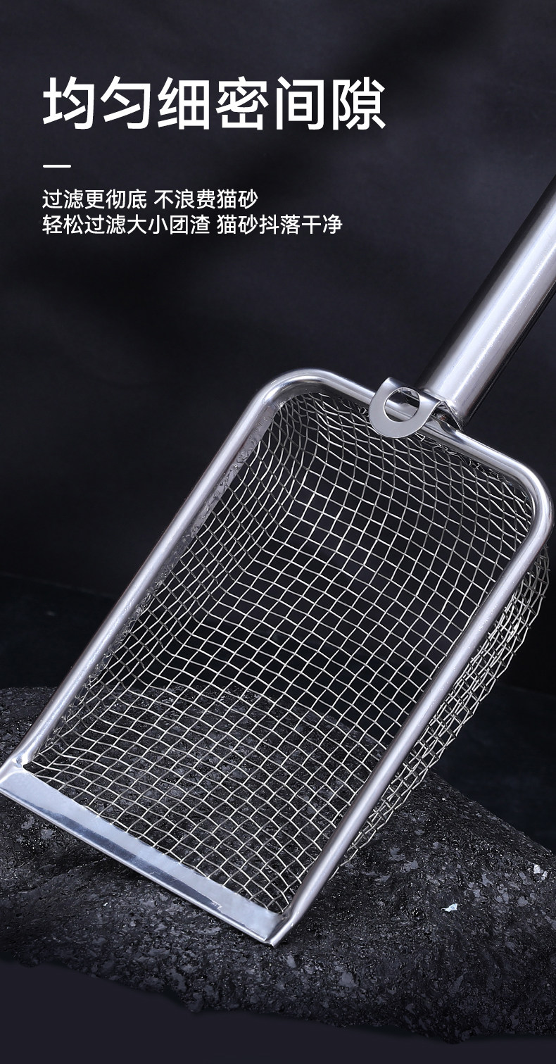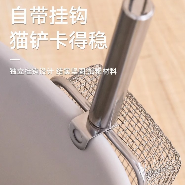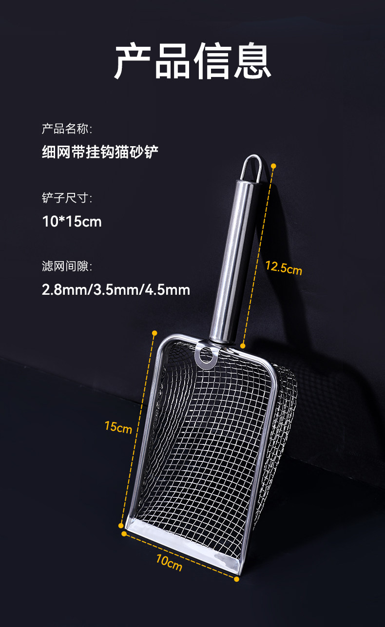 【品名】:细网猫砂铲不锈钢柄(2.8/3.5/4.5)带钩/hoopet细网木柄圆孔挂扣猫砂铲(2.8/3.5/4.5)