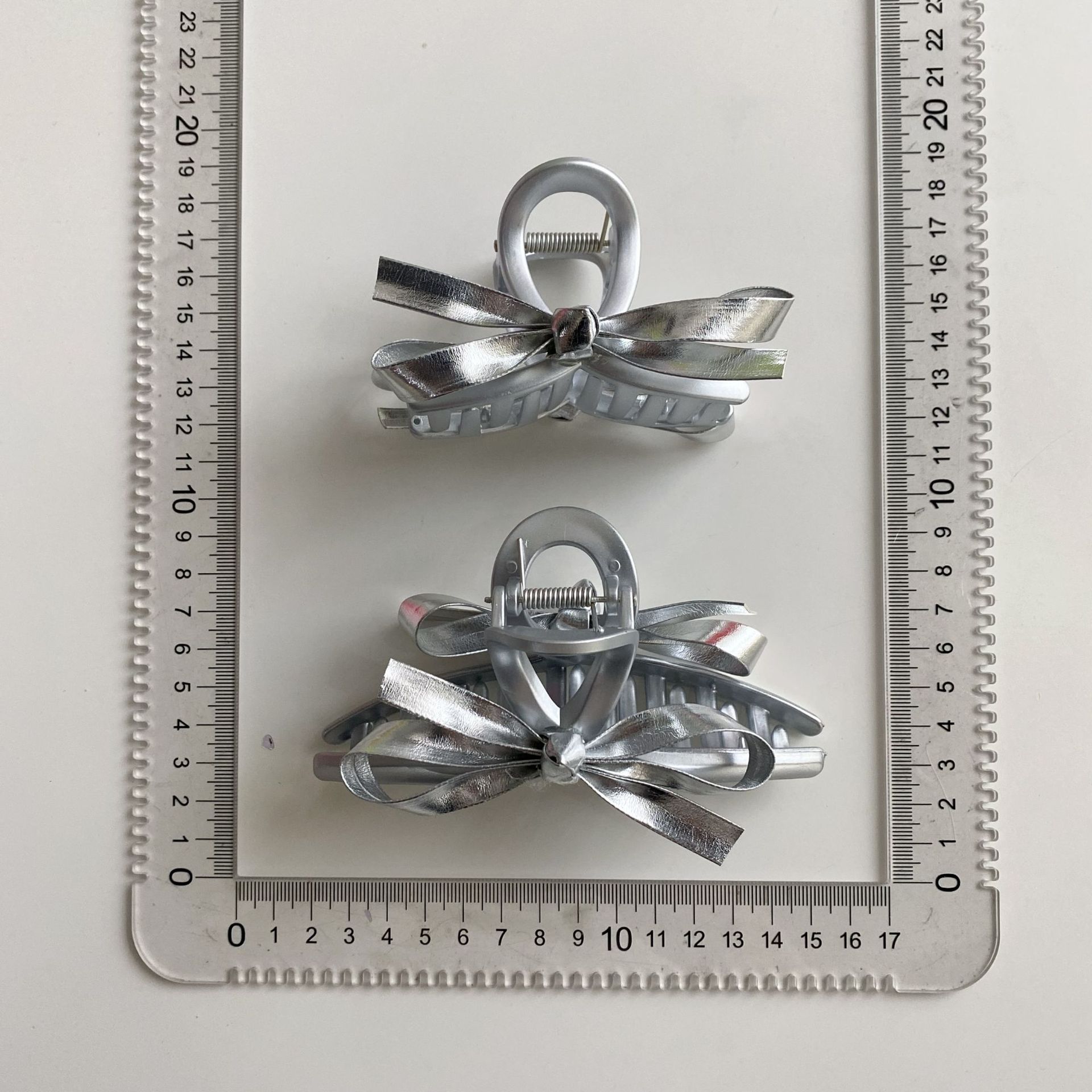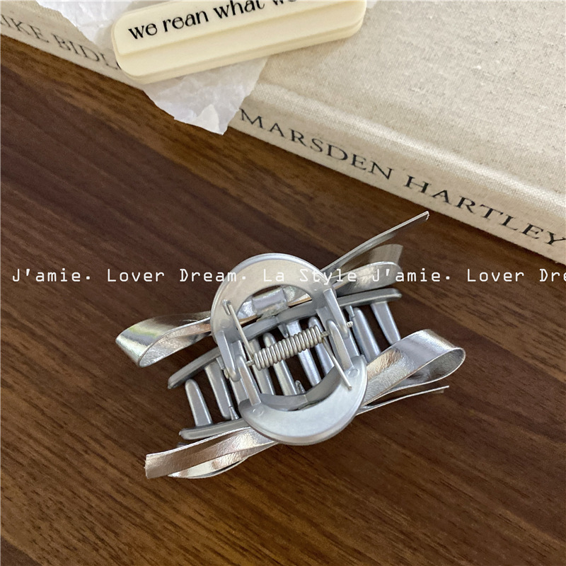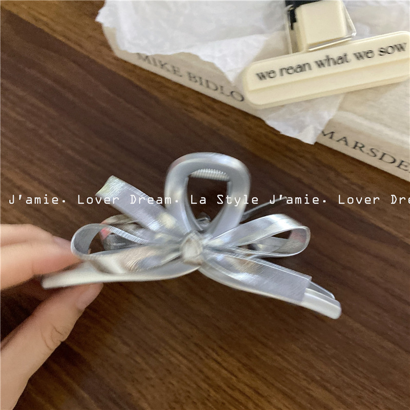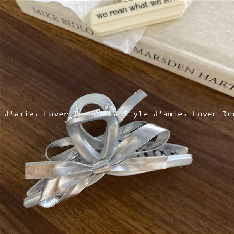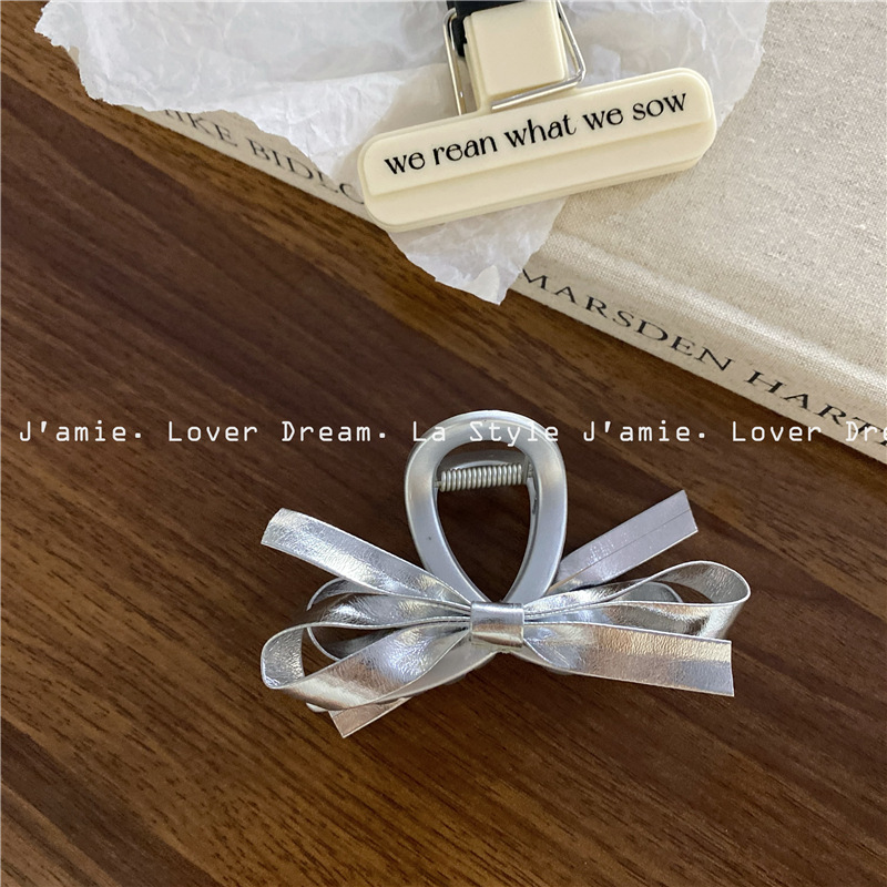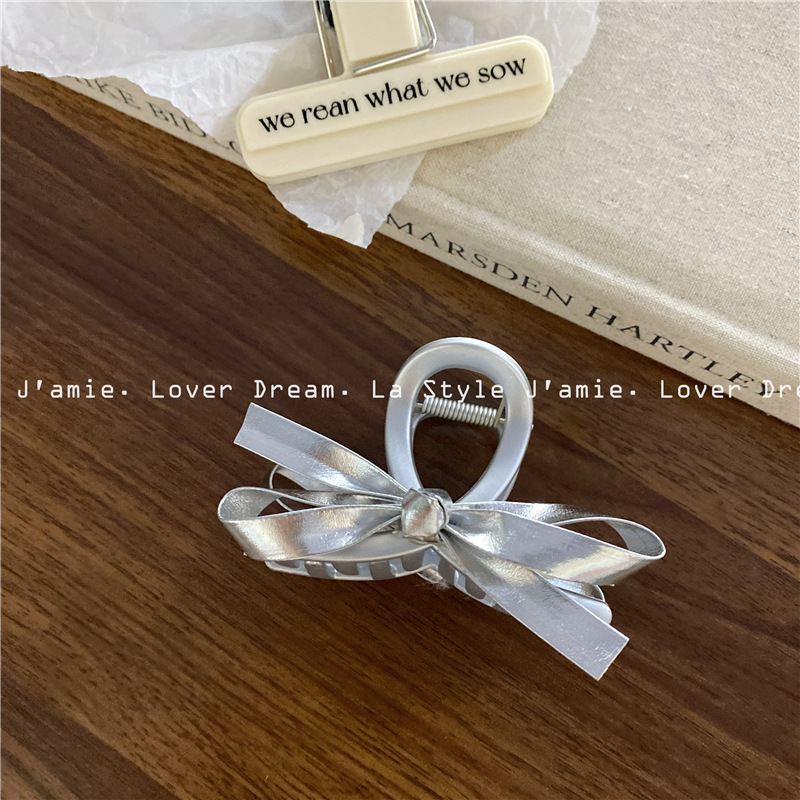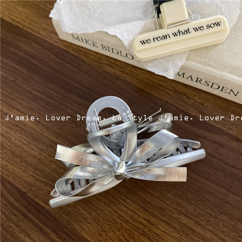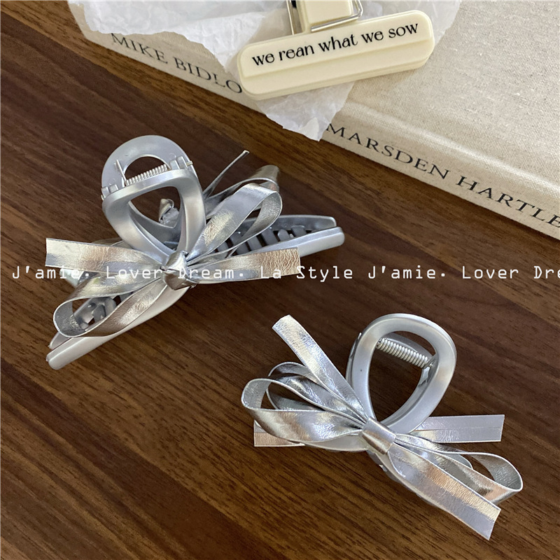 新款银色仿皮蝴蝶结质感磨砂银发夹 时尚抓夹鲨鱼夹发饰女