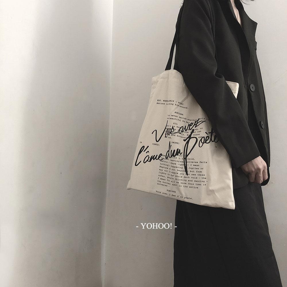 小众复古手写电影台词ins韩风chic百搭大号拉链单肩帆布包购物袋