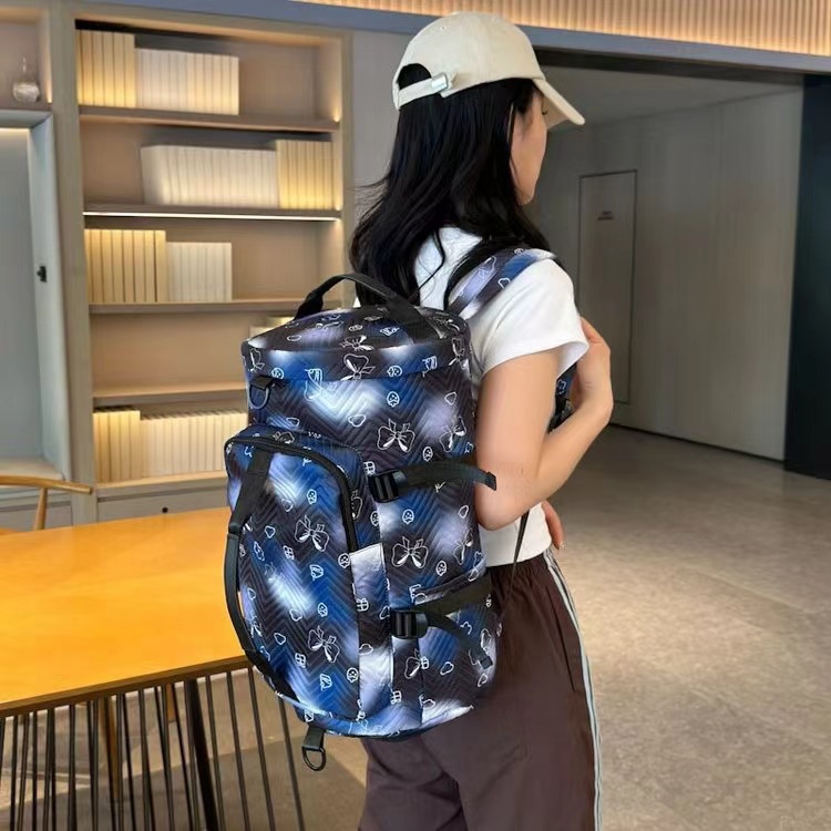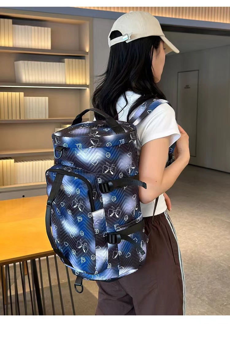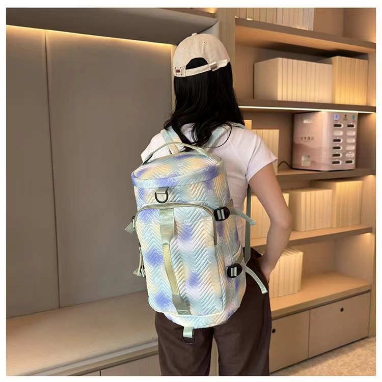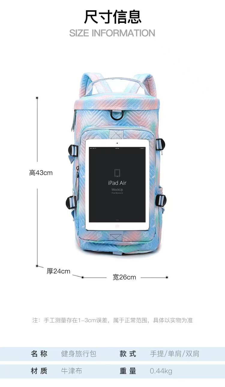 货号: Y66 容量: 36-55L 材质: 牛津布 功能: 防水,耐磨,减负,护脊,防割,干湿分离, 适用性别: 中性/男女均可 里料质地: 涤纶 图案: 撞色 风格: 街头潮流 流行元素: 车缝线 颜色: 黑色,紫色,绿色,蓝色,粉红色 重量: 0.4 kg/个