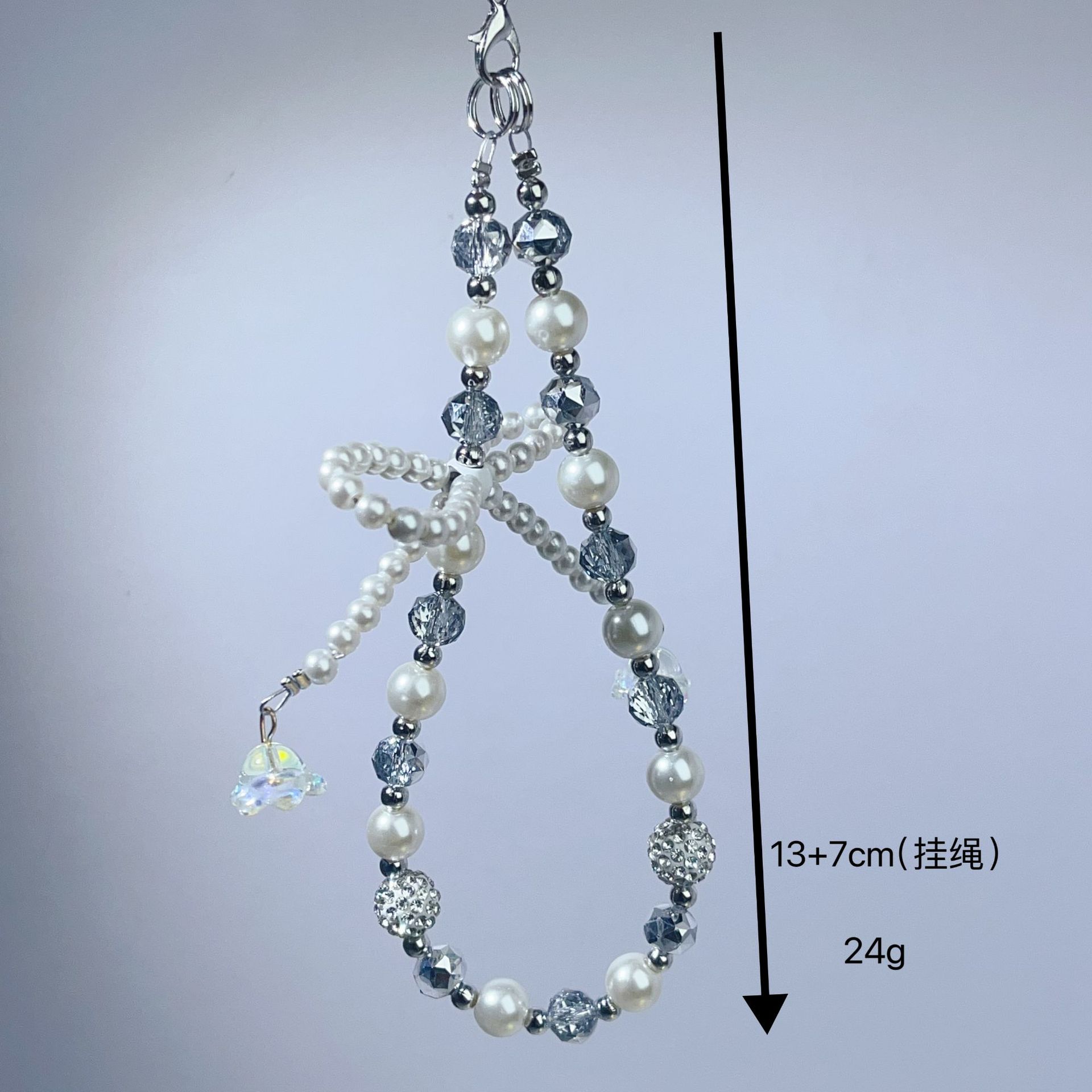 创意新款珍珠蝴蝶结手机链花球水晶手机壳挂绳包包钥匙扣串珠挂件 投诉