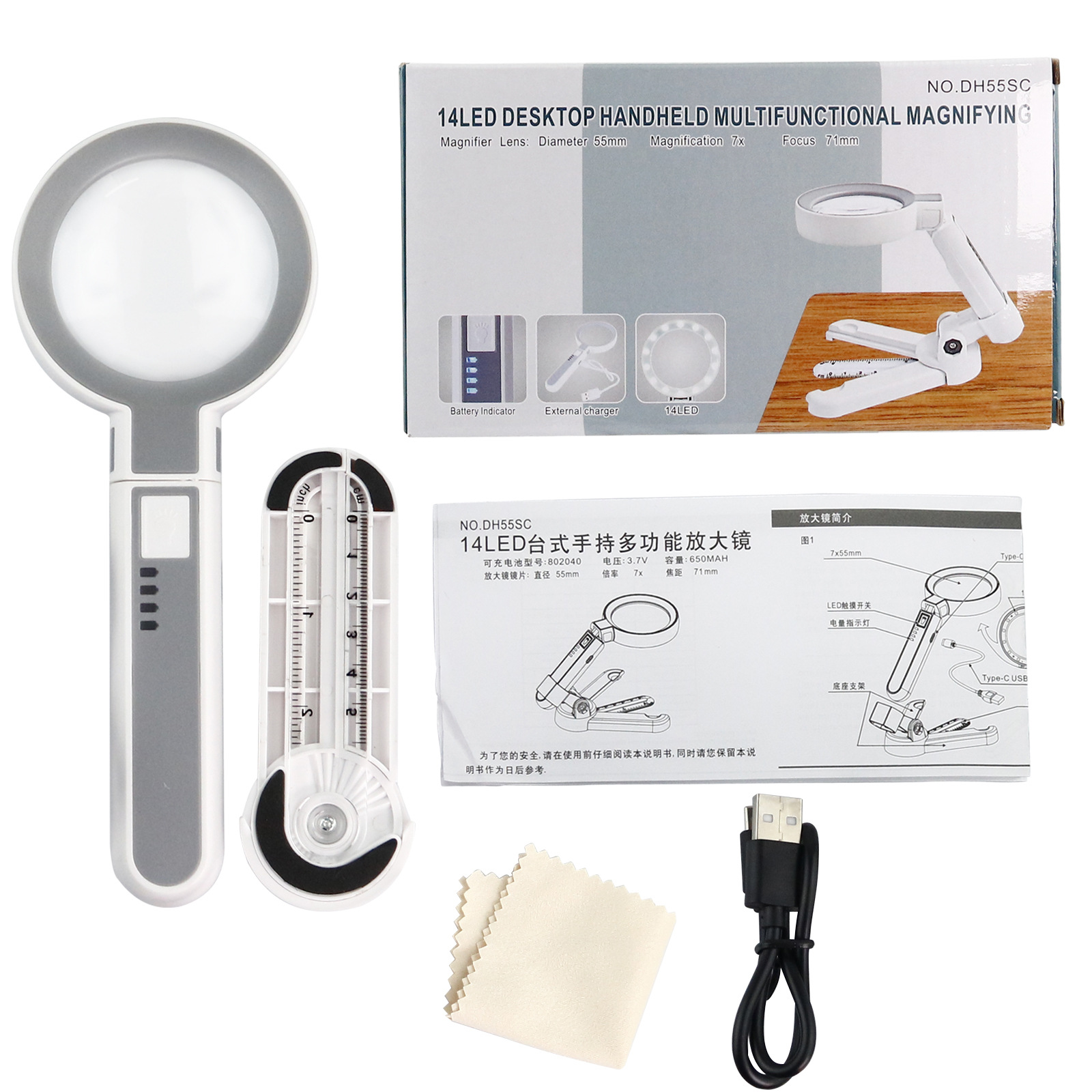 产品包装:彩盒+中英文说明书+擦镜布+USB充电线