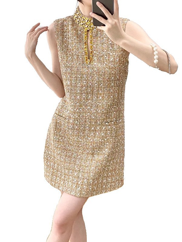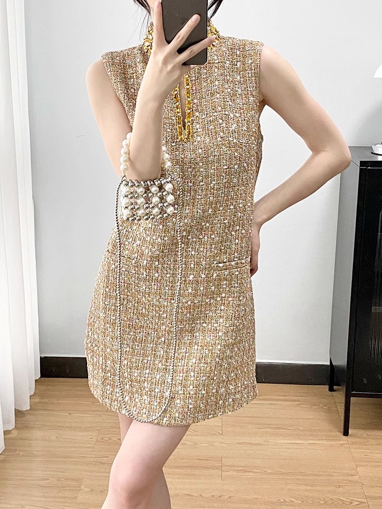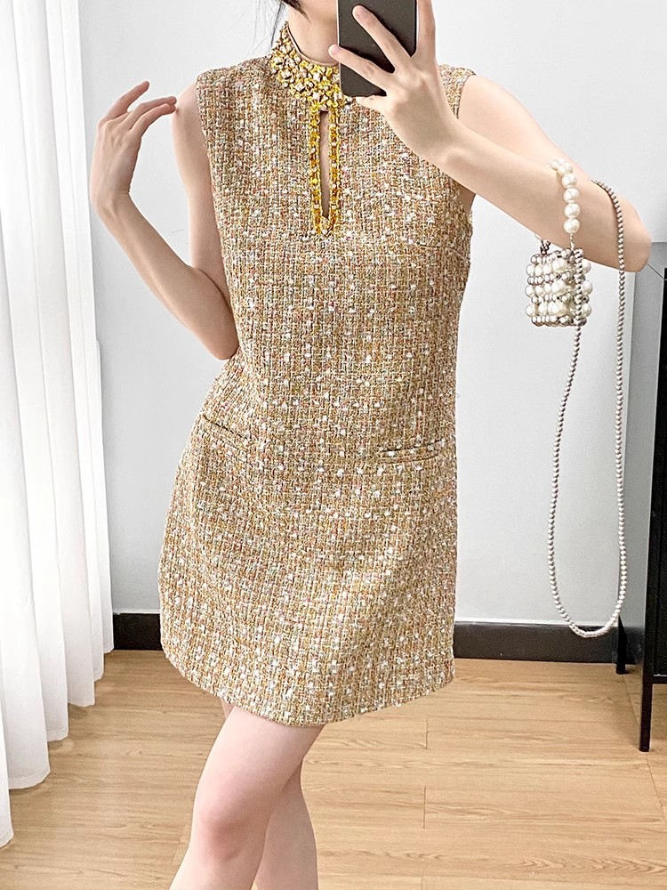 2025夏新款轻奢名媛气质重工亮片水钻串珠立领镂空花呢背心裙短裙 投诉