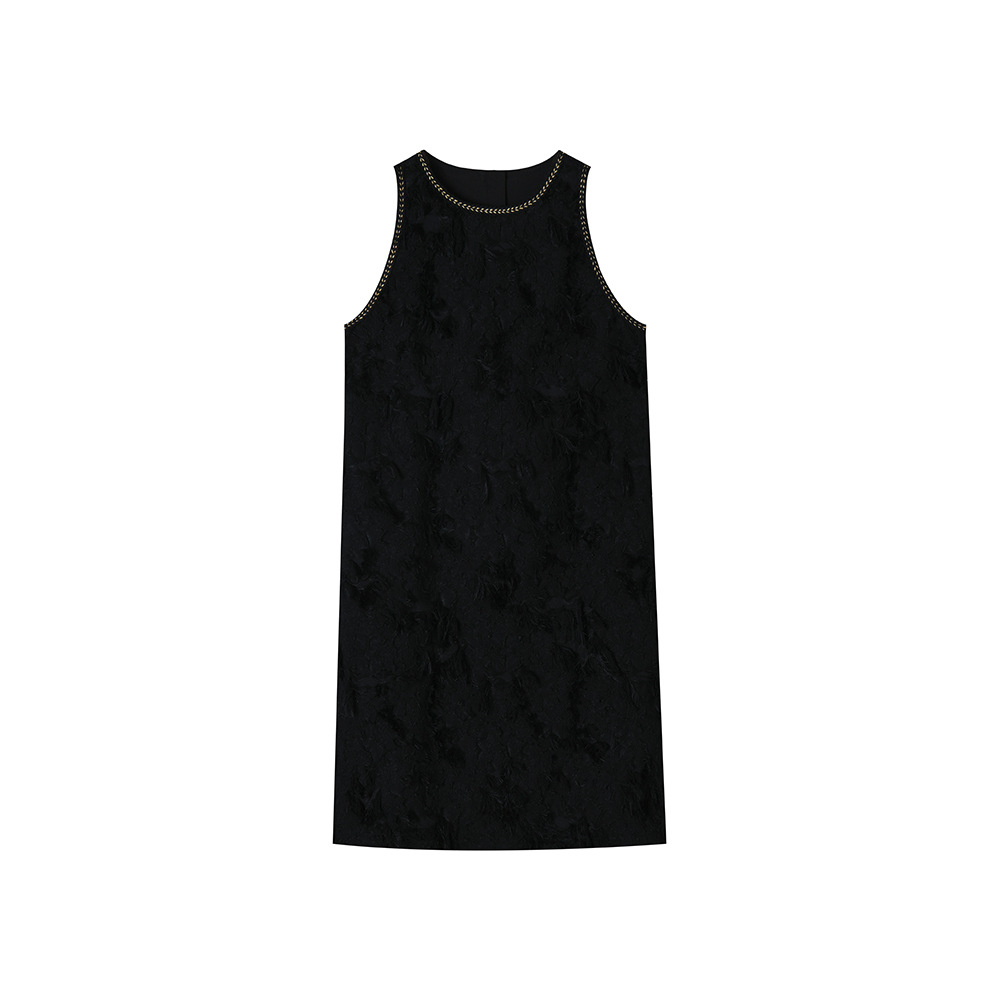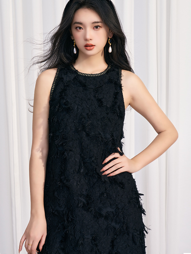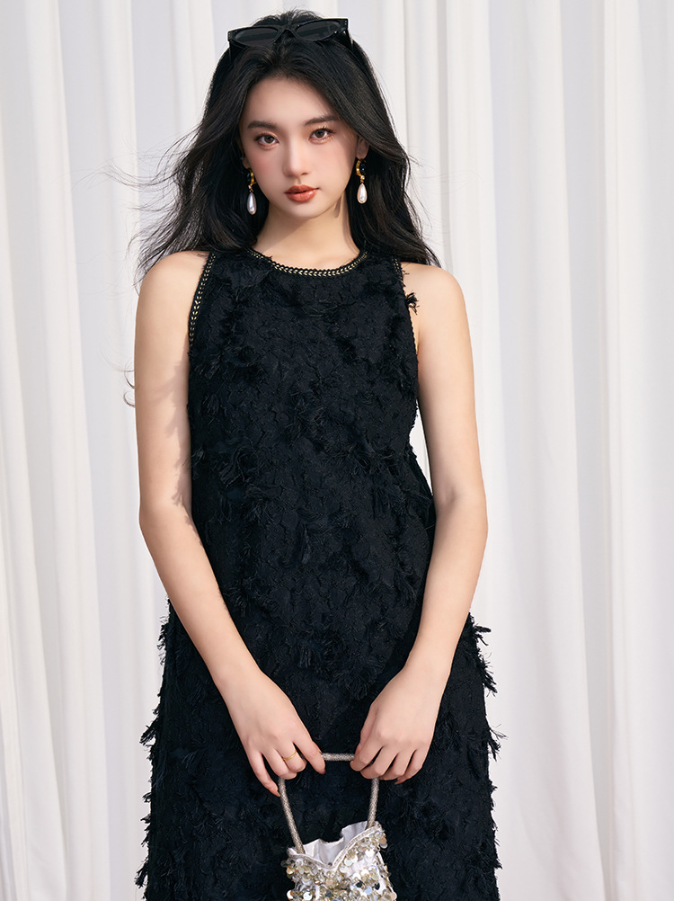 202524夏新法式复古名媛风高级感剪花无袖黑色小香A字连衣裙