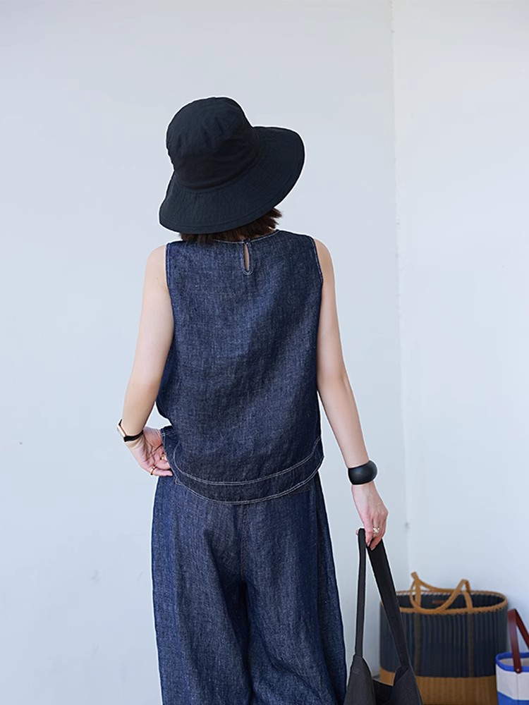 2025新款细支汉麻斜纹色织牛仔布清凉无袖小衫上衣显瘦清凉萝卜裤