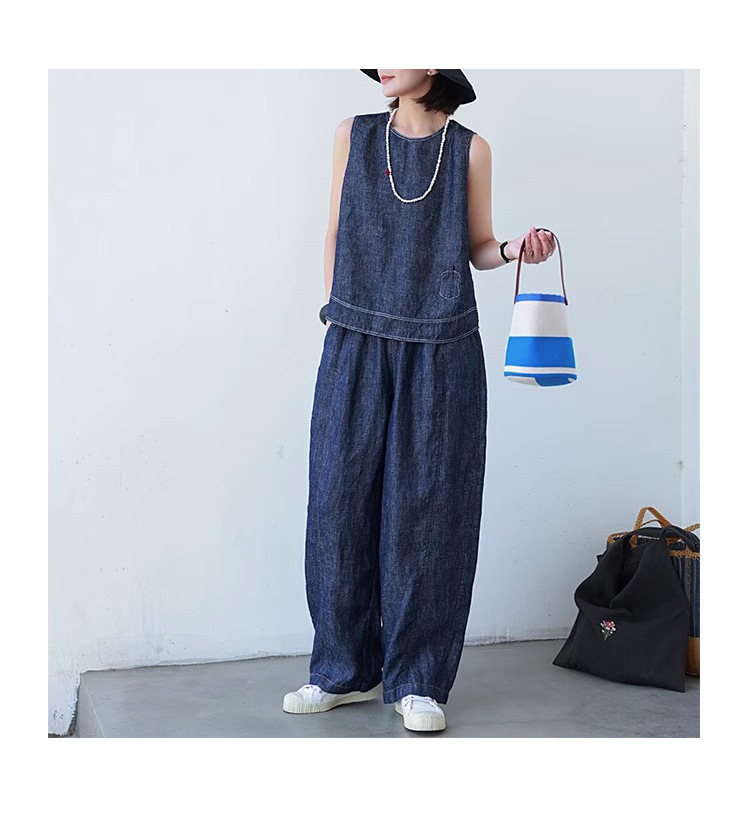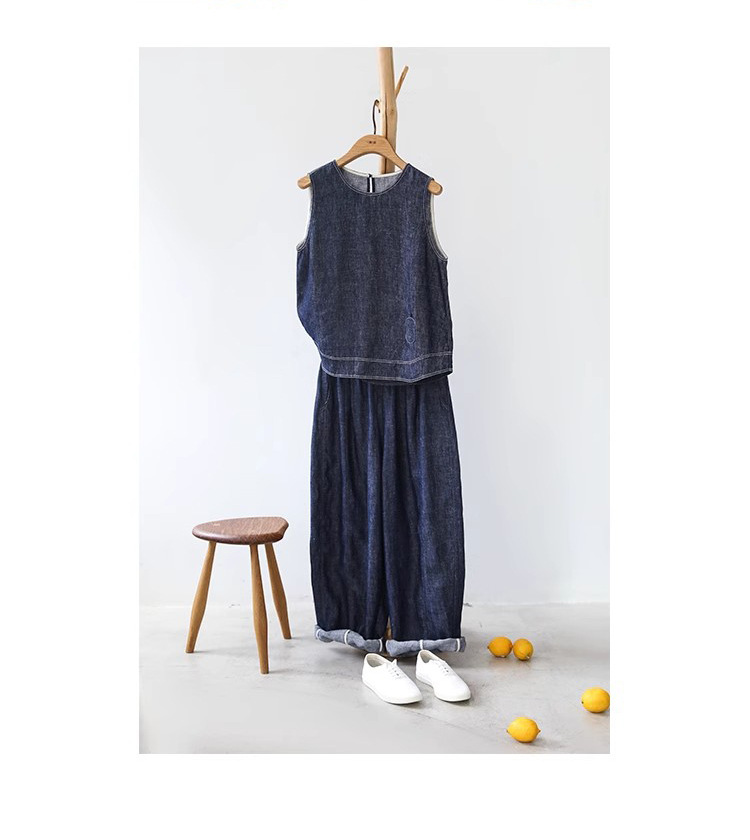 2025新款细支汉麻斜纹色织牛仔布清凉无袖小衫上衣显瘦清凉萝卜裤 投诉