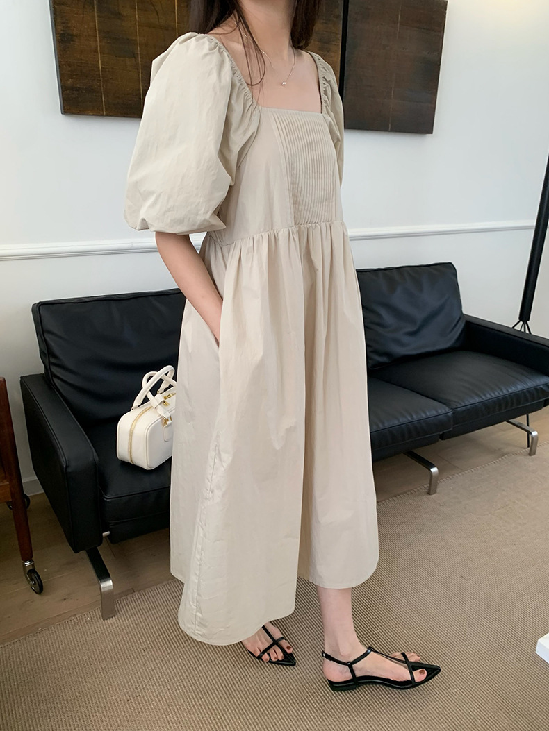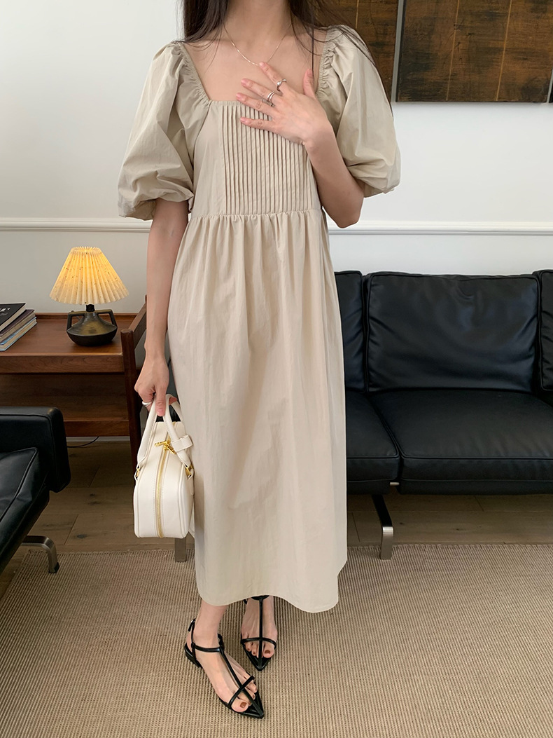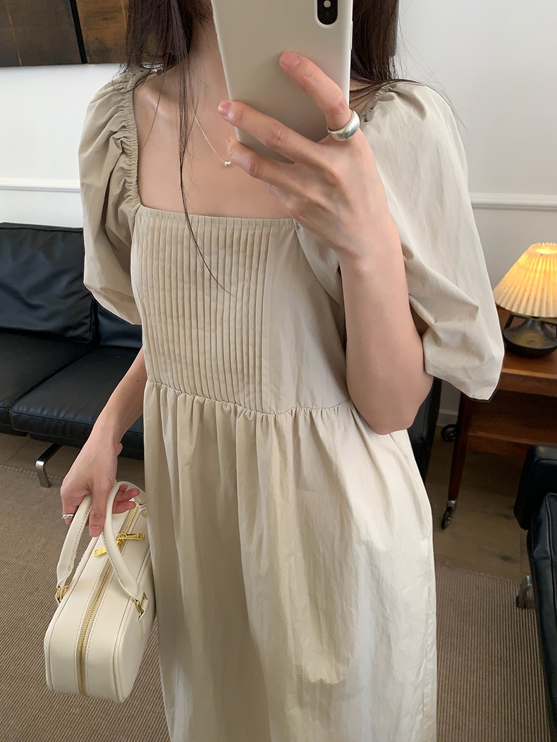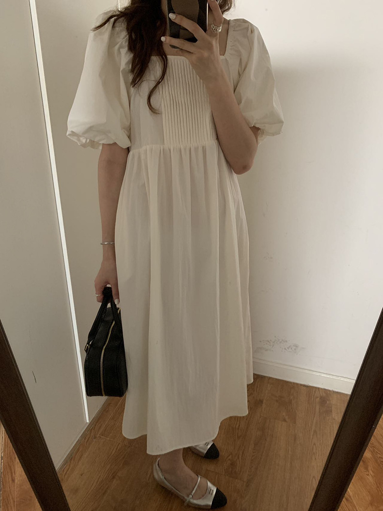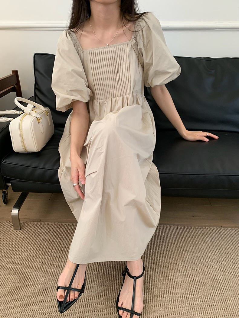 2025夏季新款韩版泡泡袖连衣裙宽松压褶A字长裙W0611