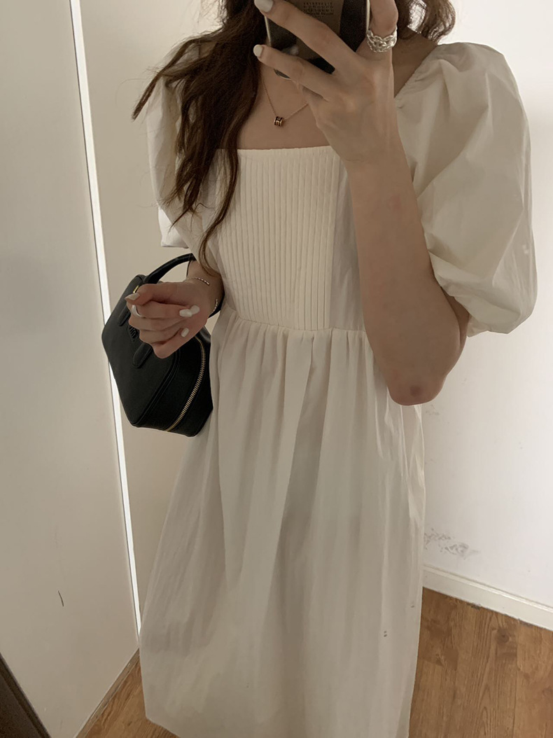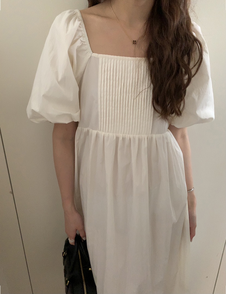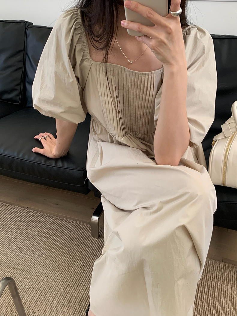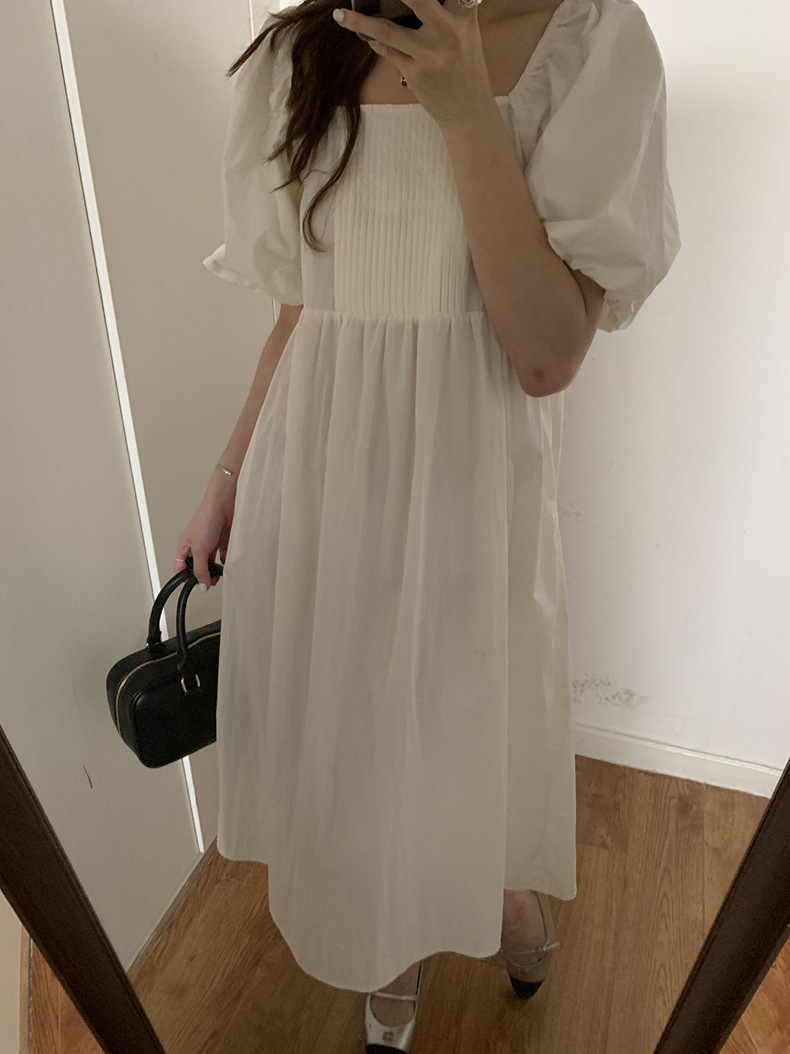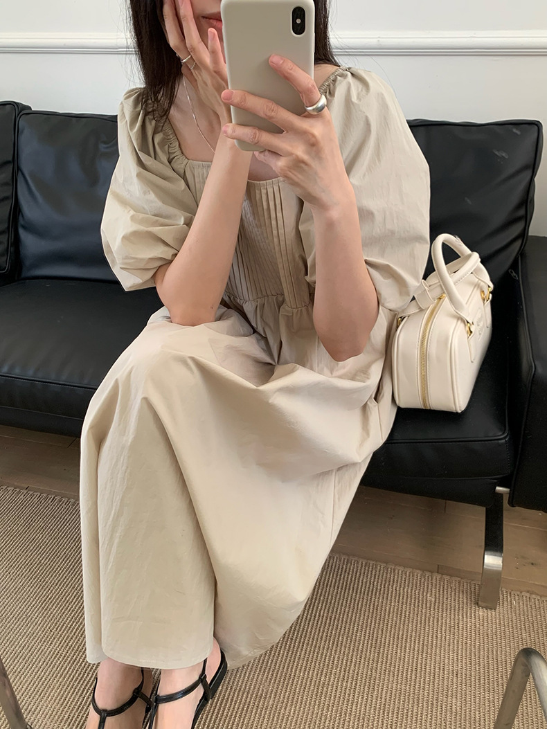 2025夏季新款韩版泡泡袖连衣裙宽松压褶A字长裙W0611
