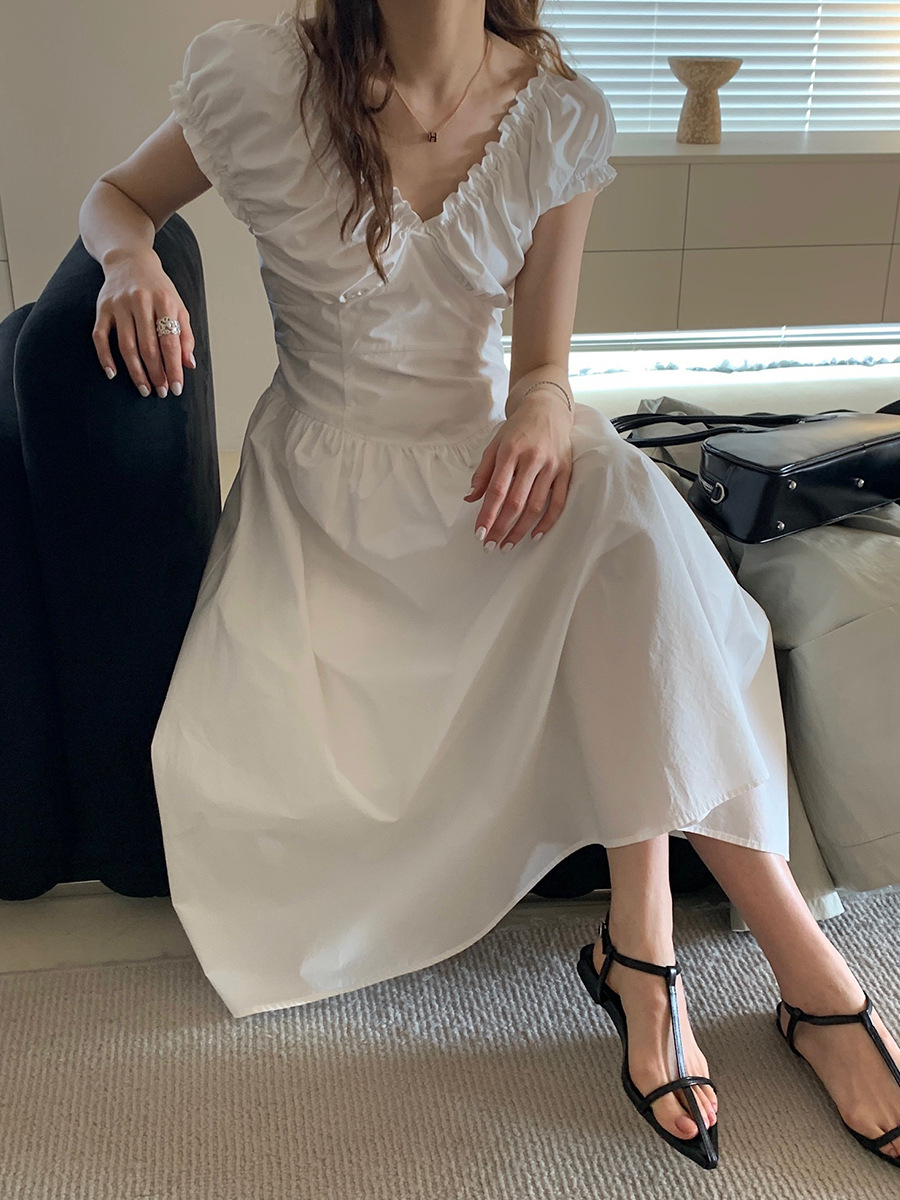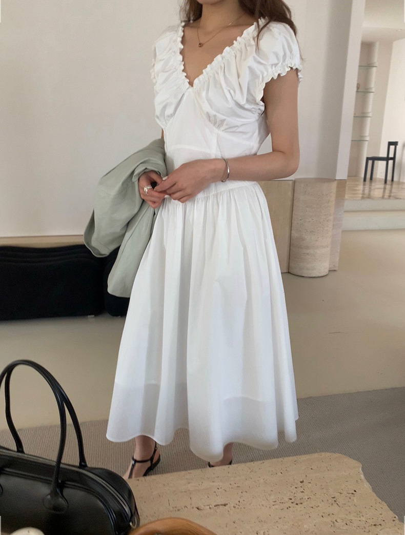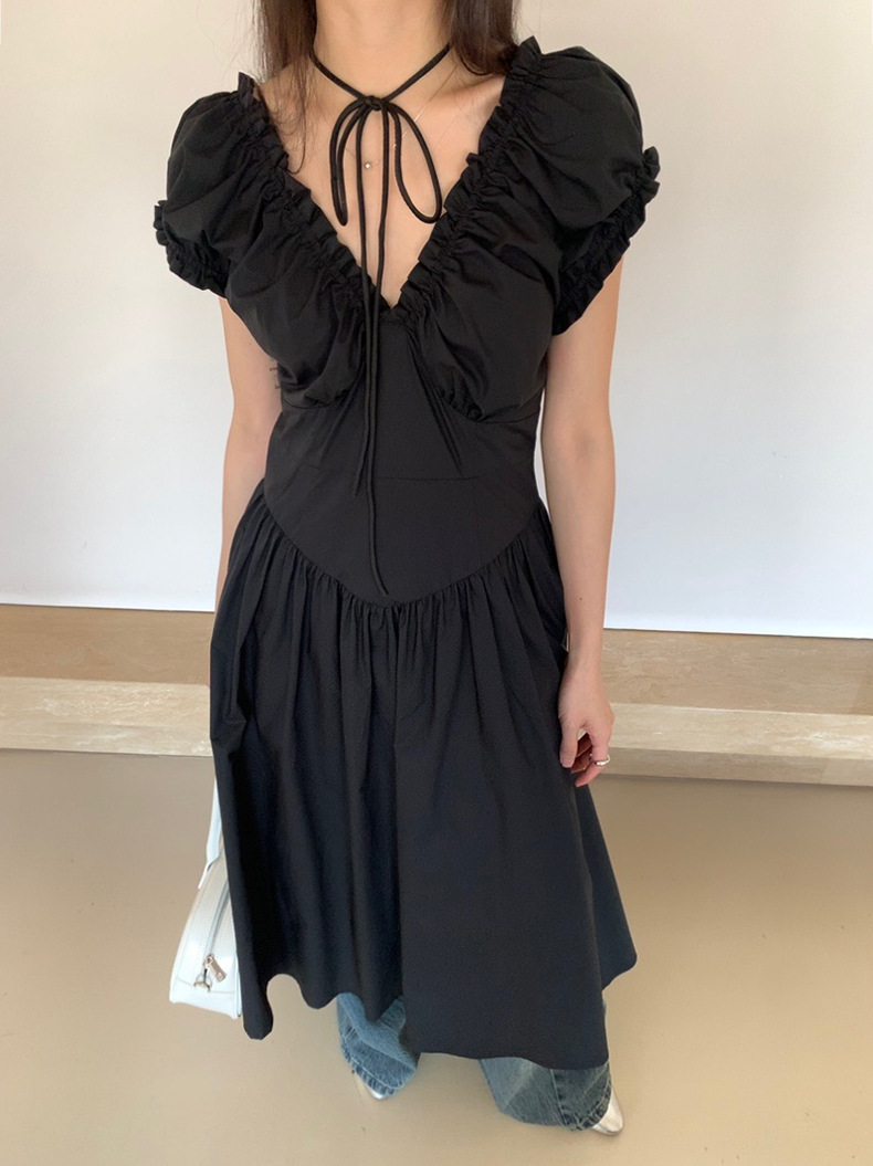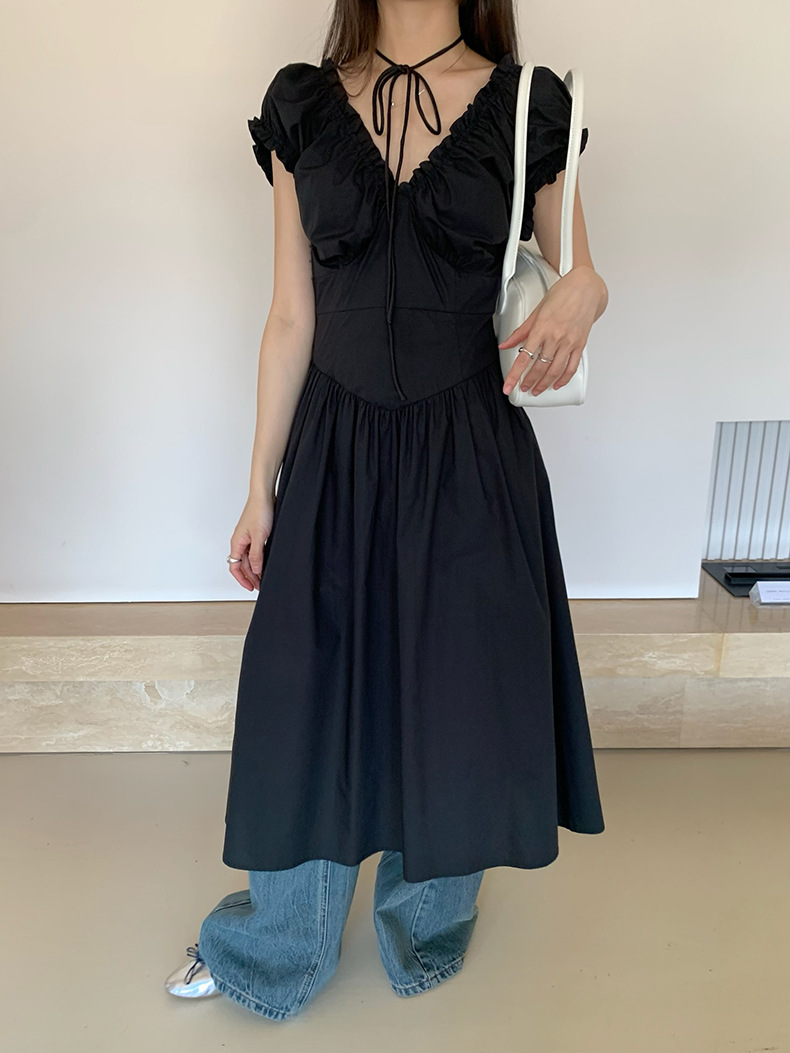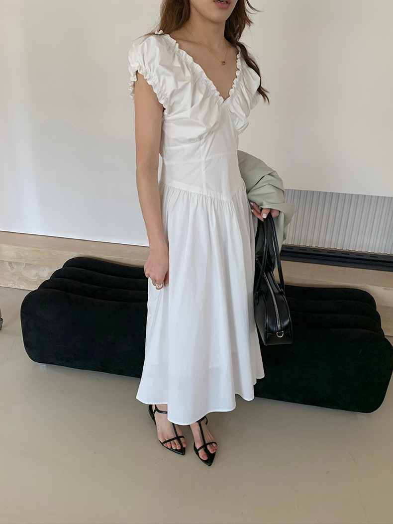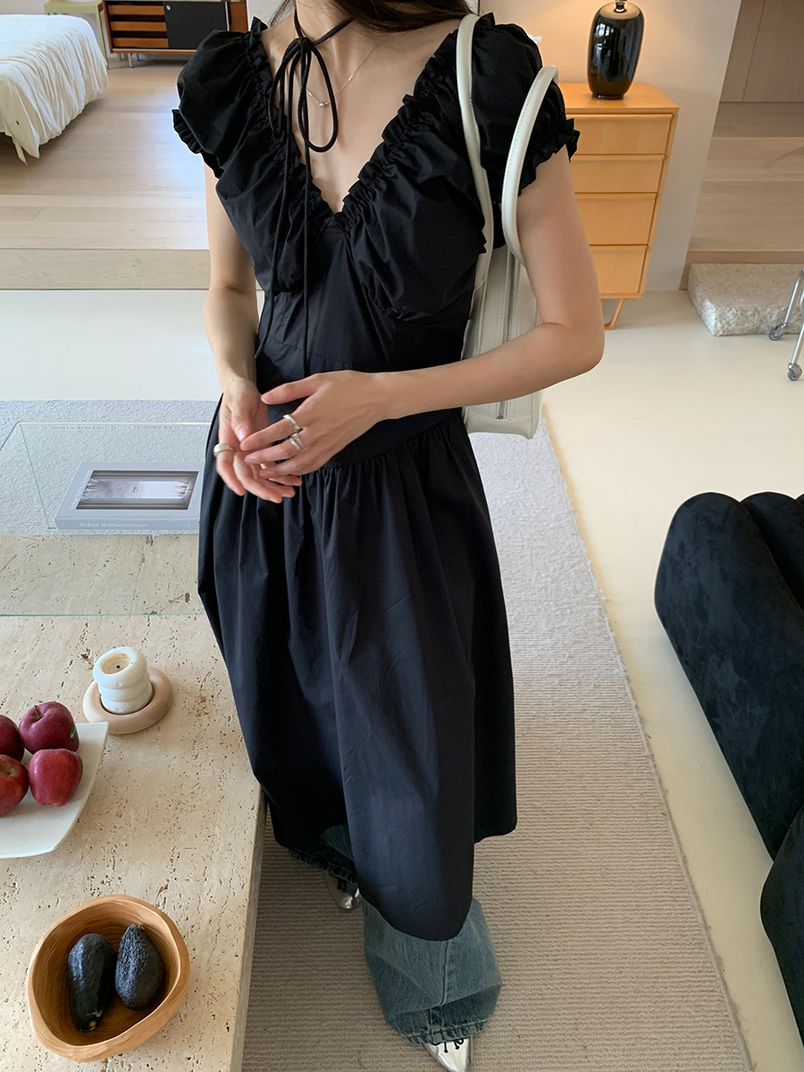 2025夏季新款法式木耳边连衣裙度假风V领长裙子W0569