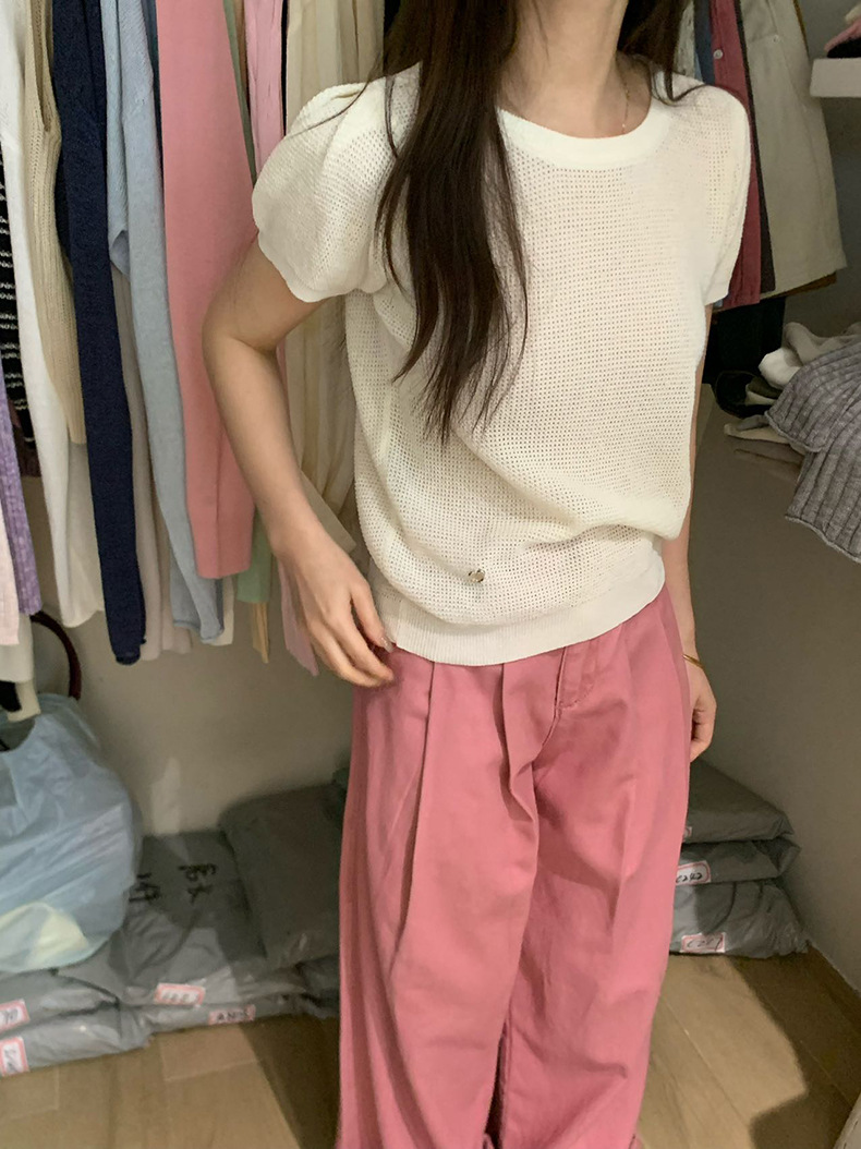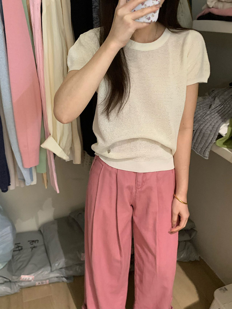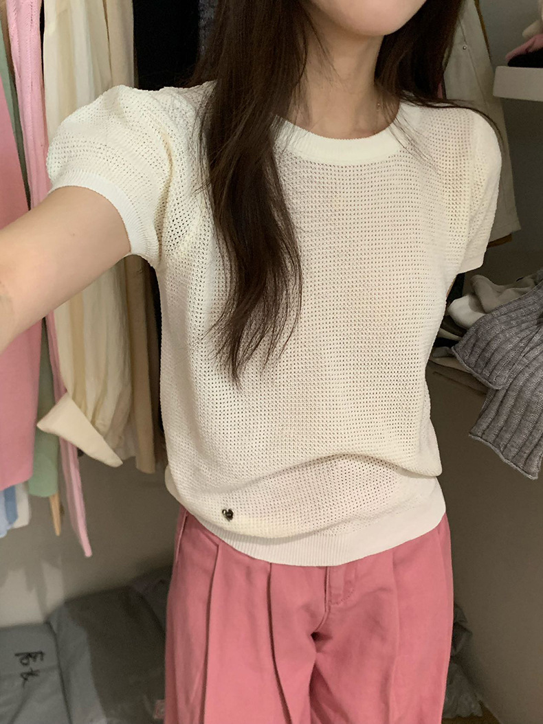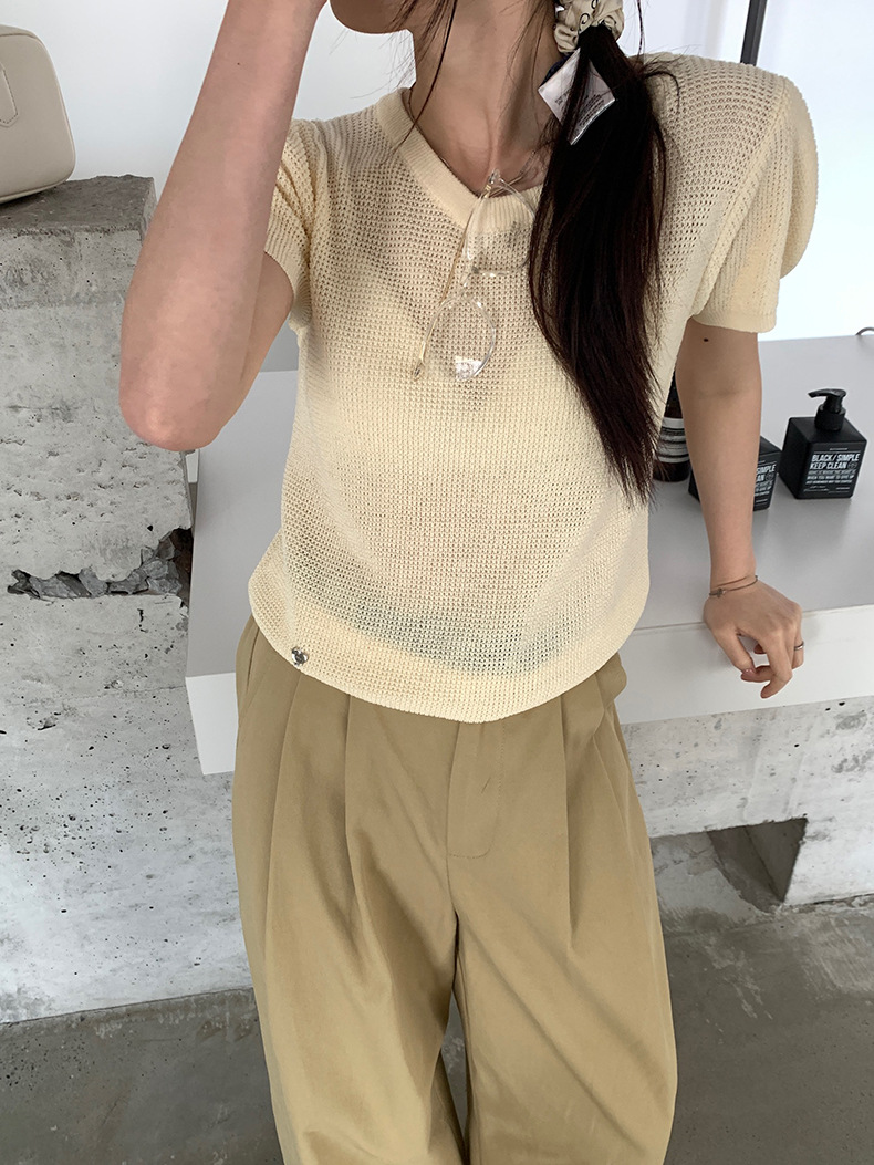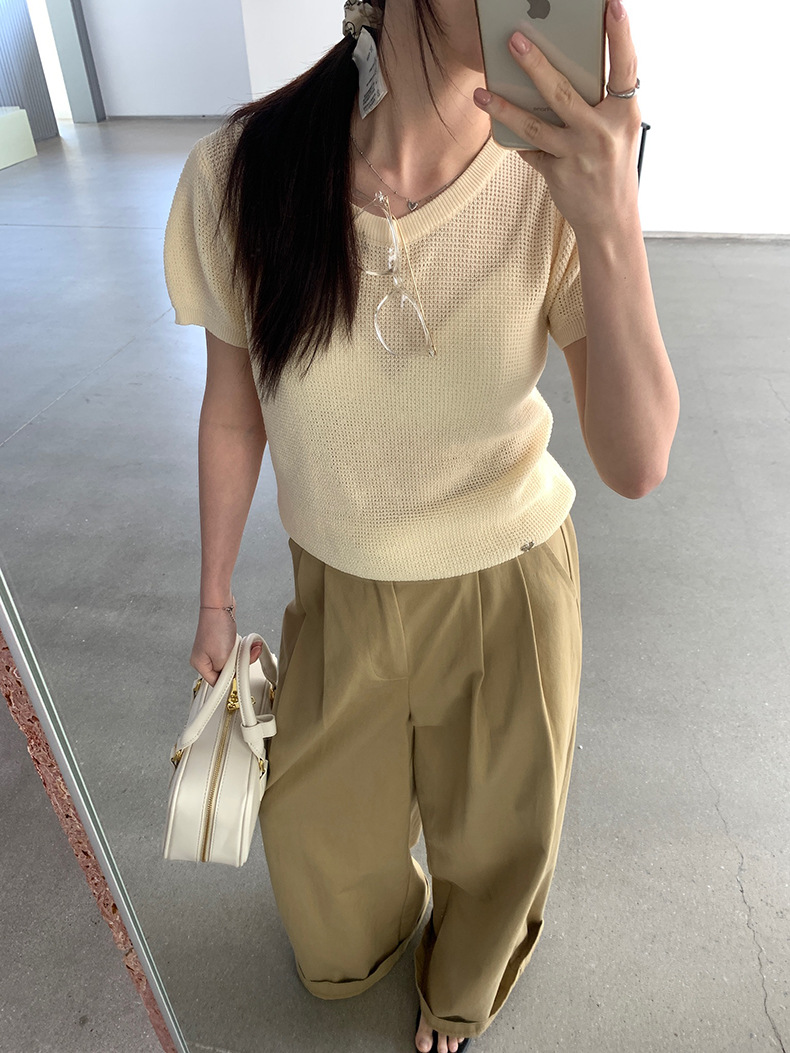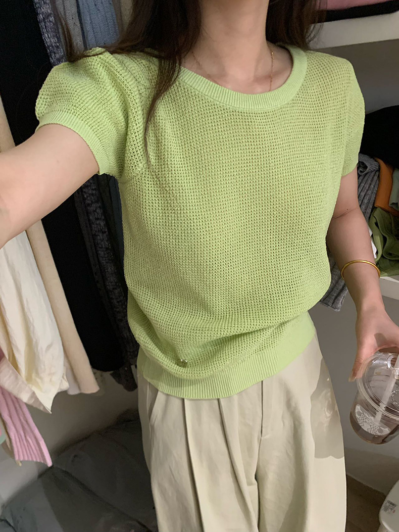 2025夏季新款华夫格短袖针织衫微透套头上衣女W0624