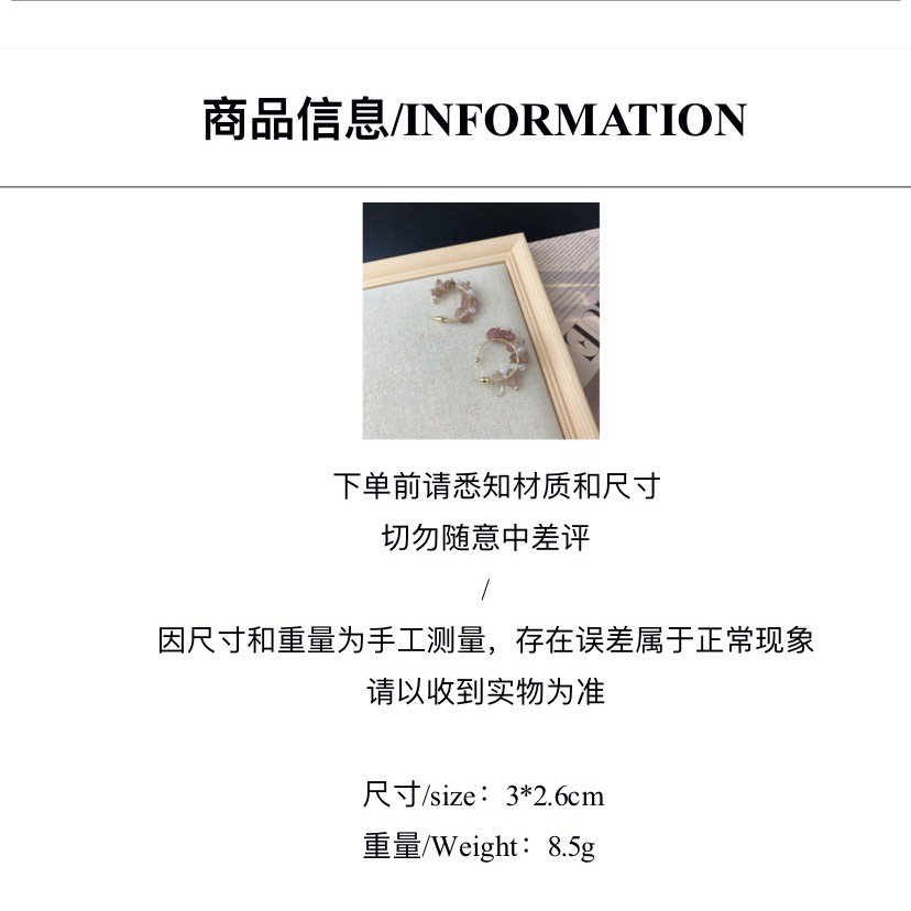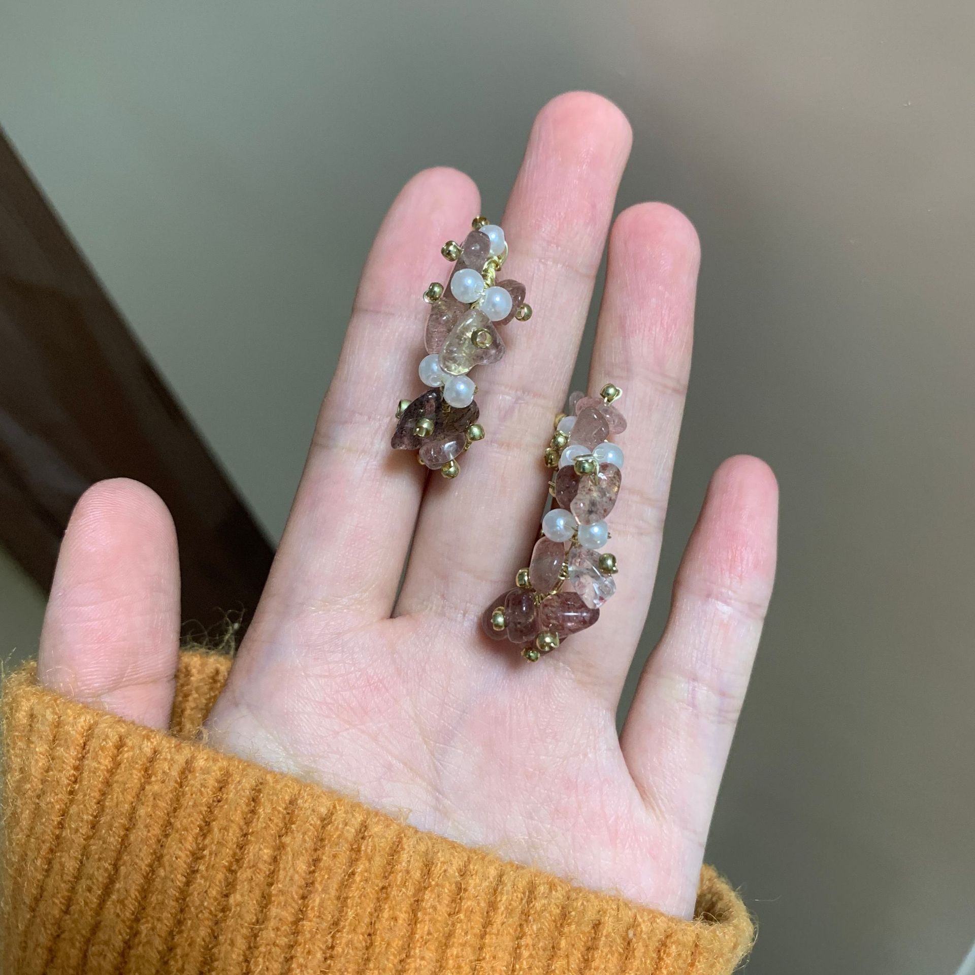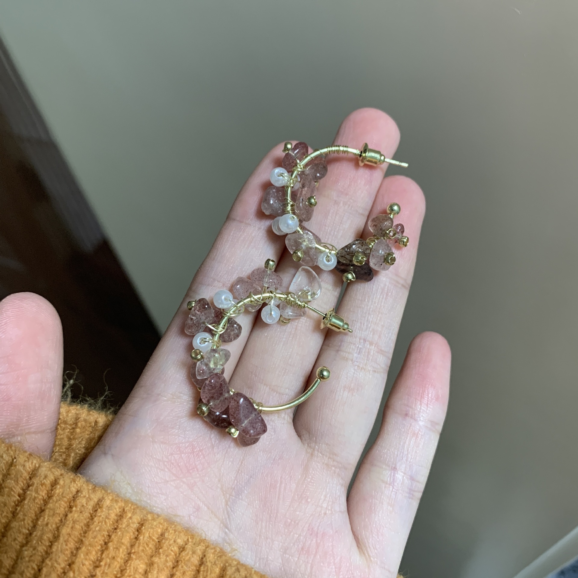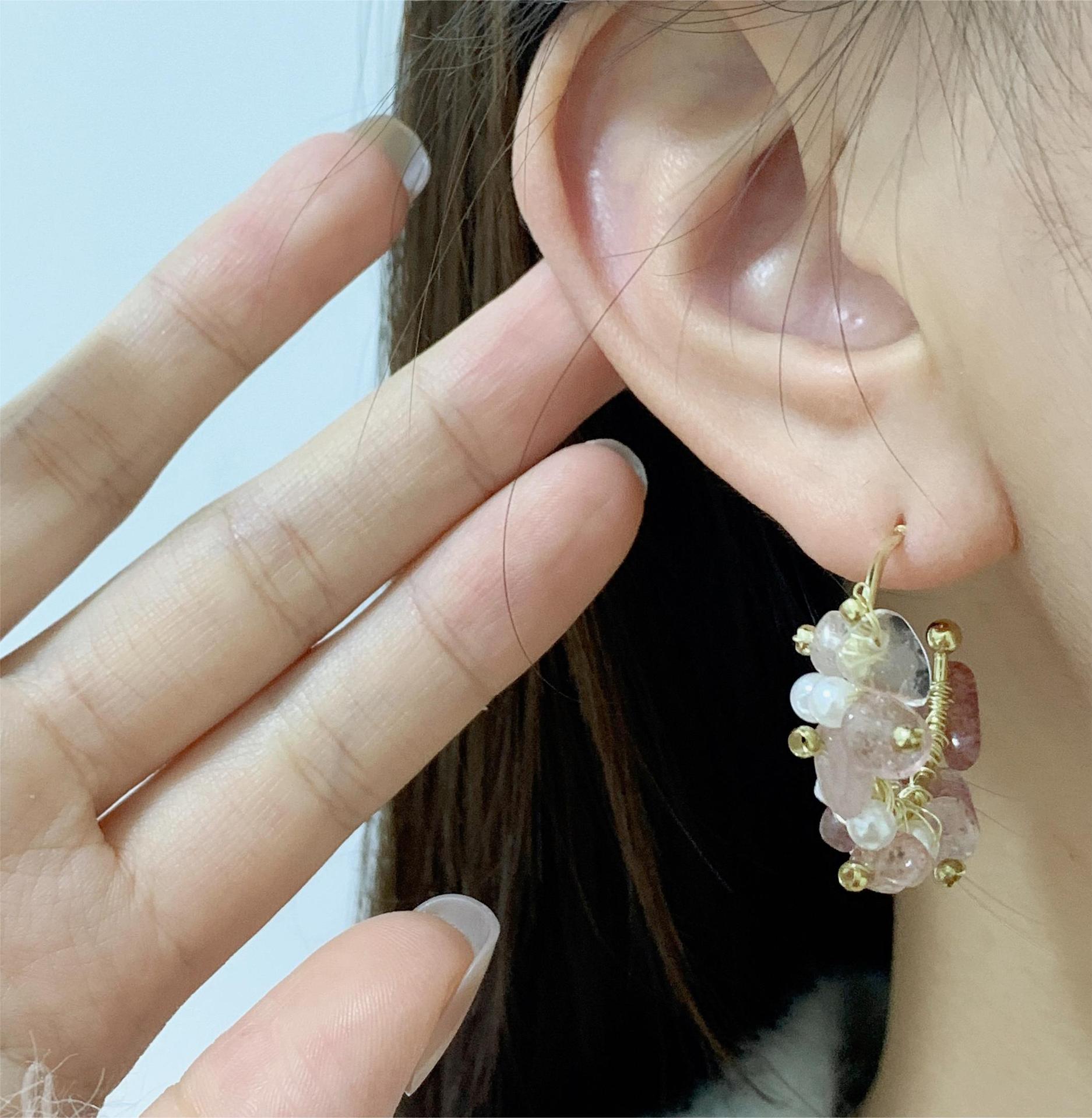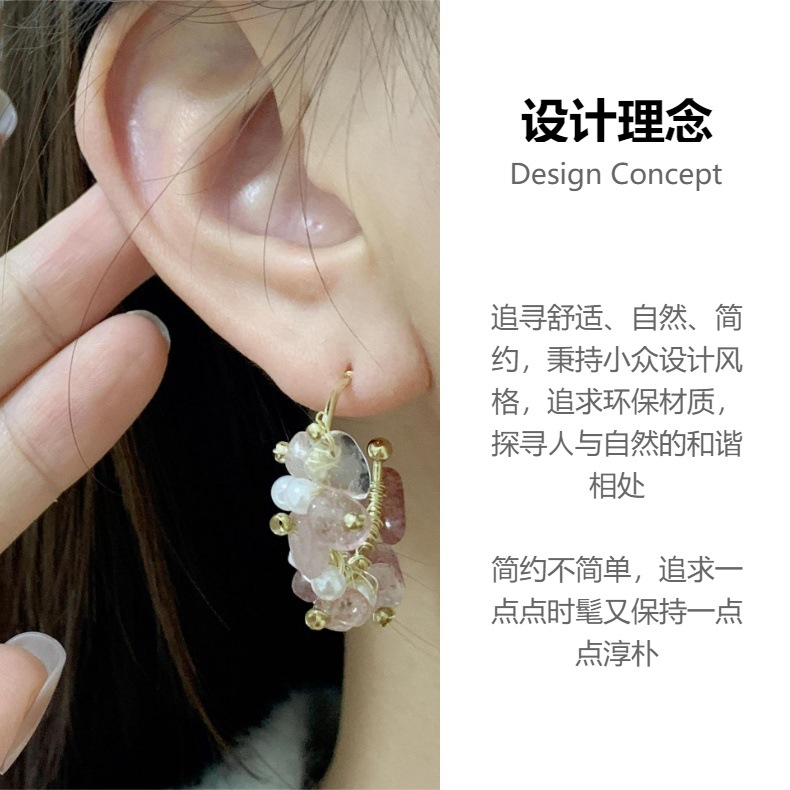甜美网红饰品轻奢纯手工缠绕天然石珍珠耳圈粉色碎石高级感耳饰品 English | 投诉