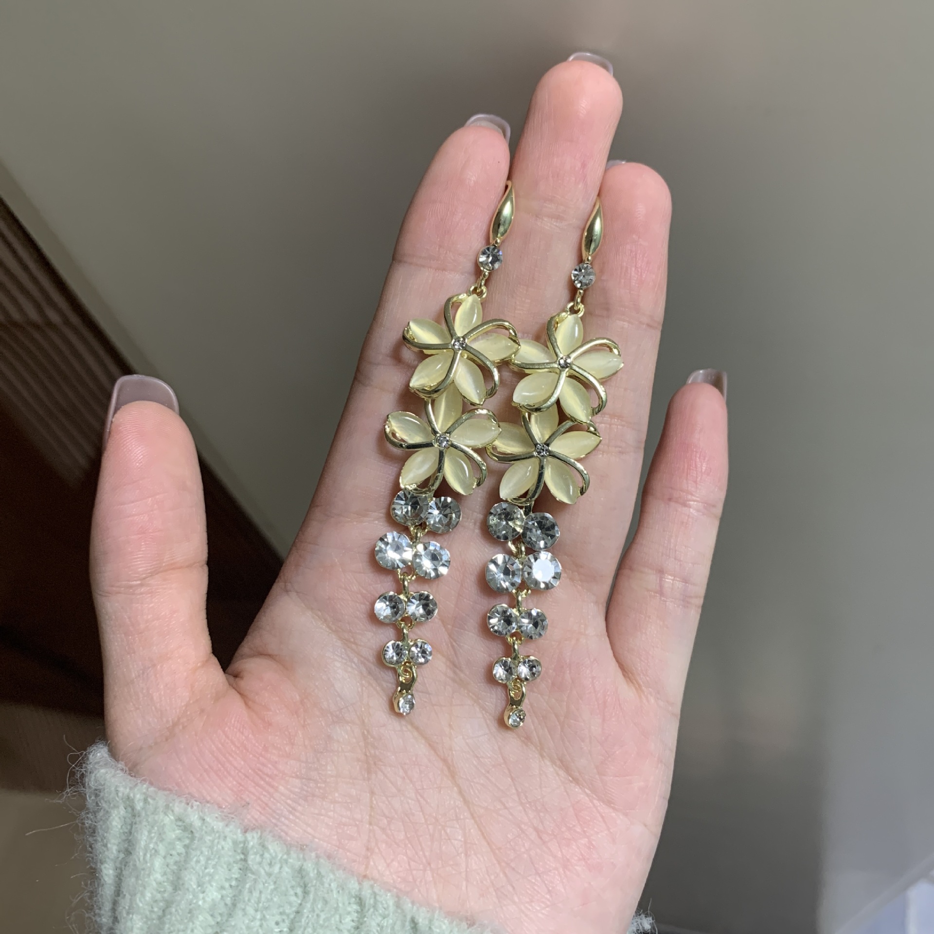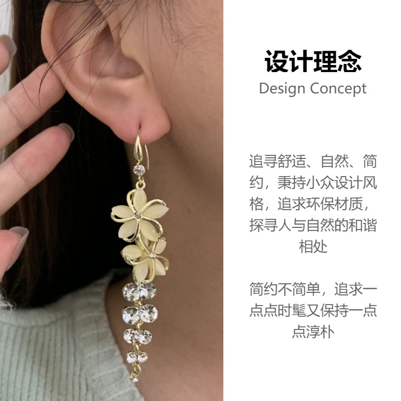韩国气质时尚高级感水晶流苏网红耳饰新款猫眼石五瓣花超仙耳钩女 English | 投诉