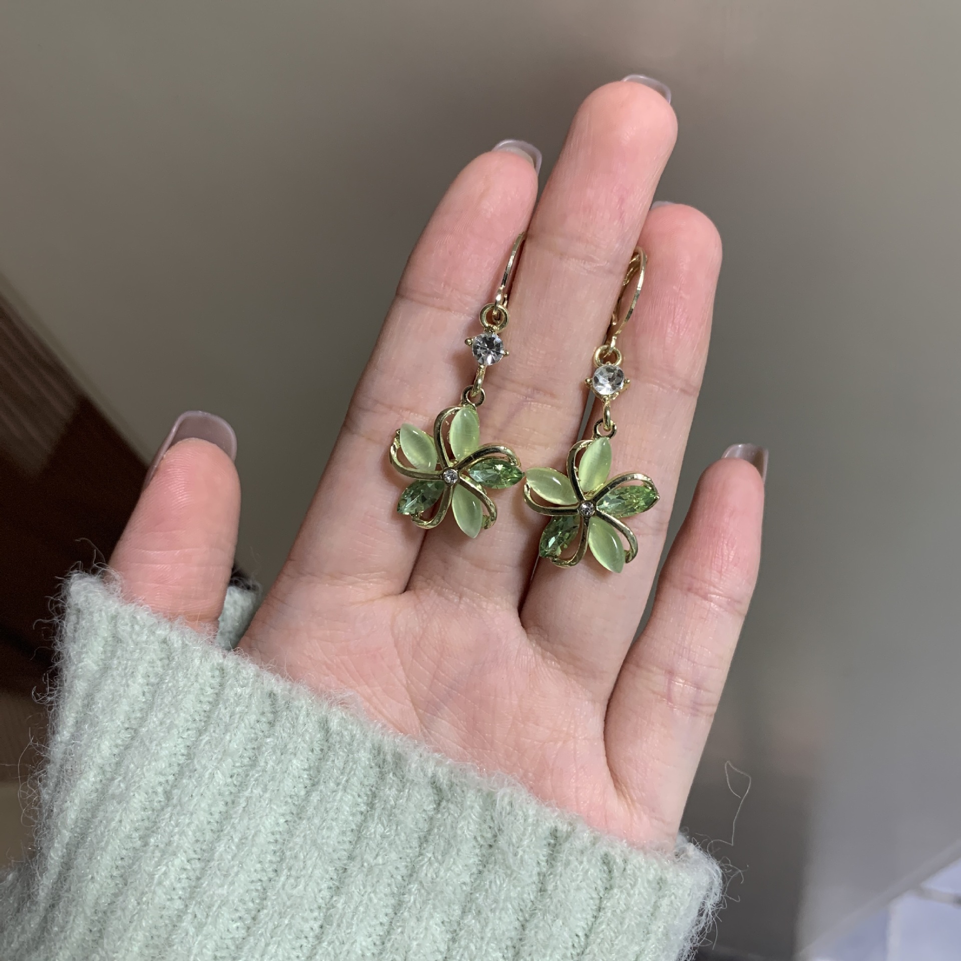 绿色春夏韩版小清新撞色猫眼花朵耳扣气质甜美时尚高级感百搭耳环 English | 投诉