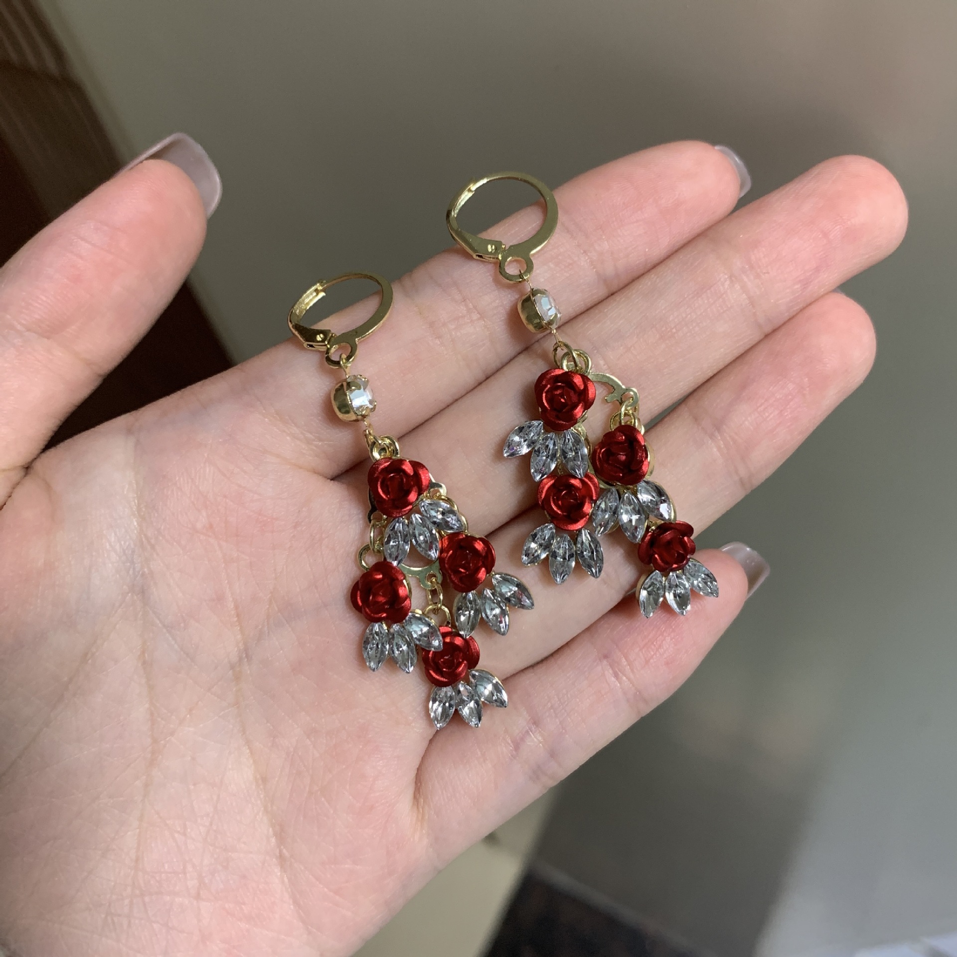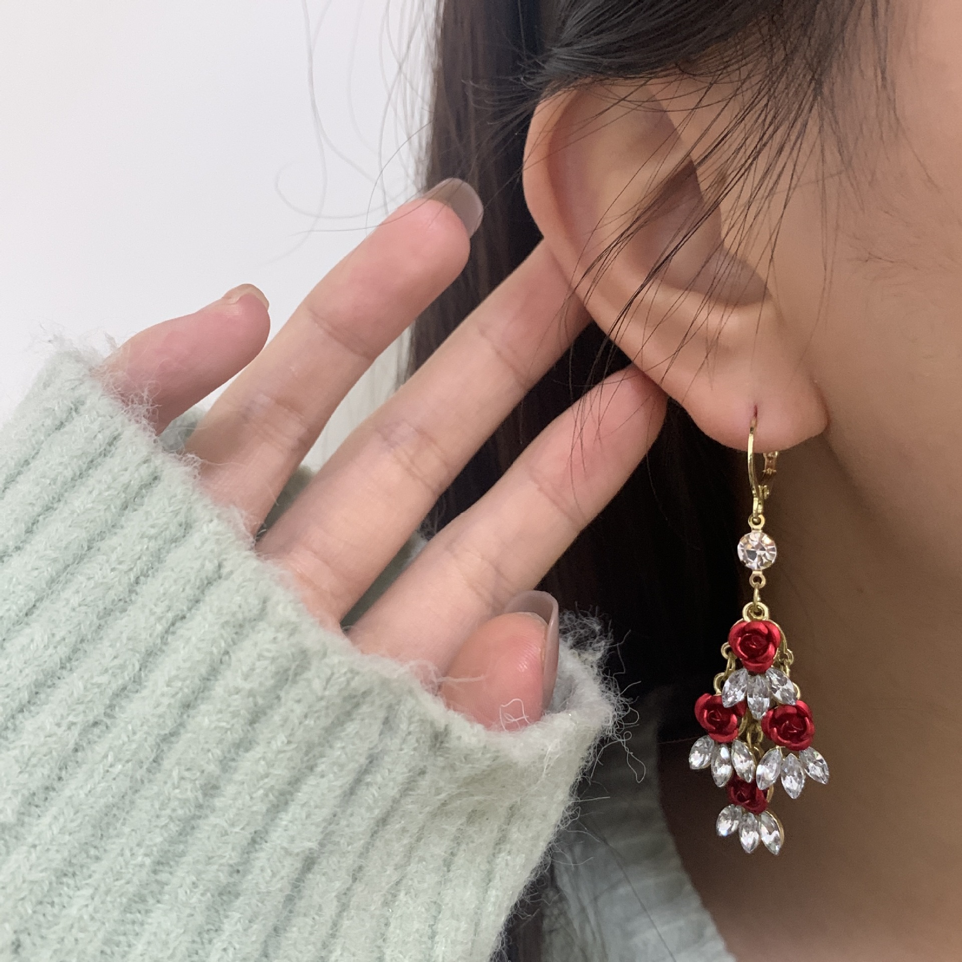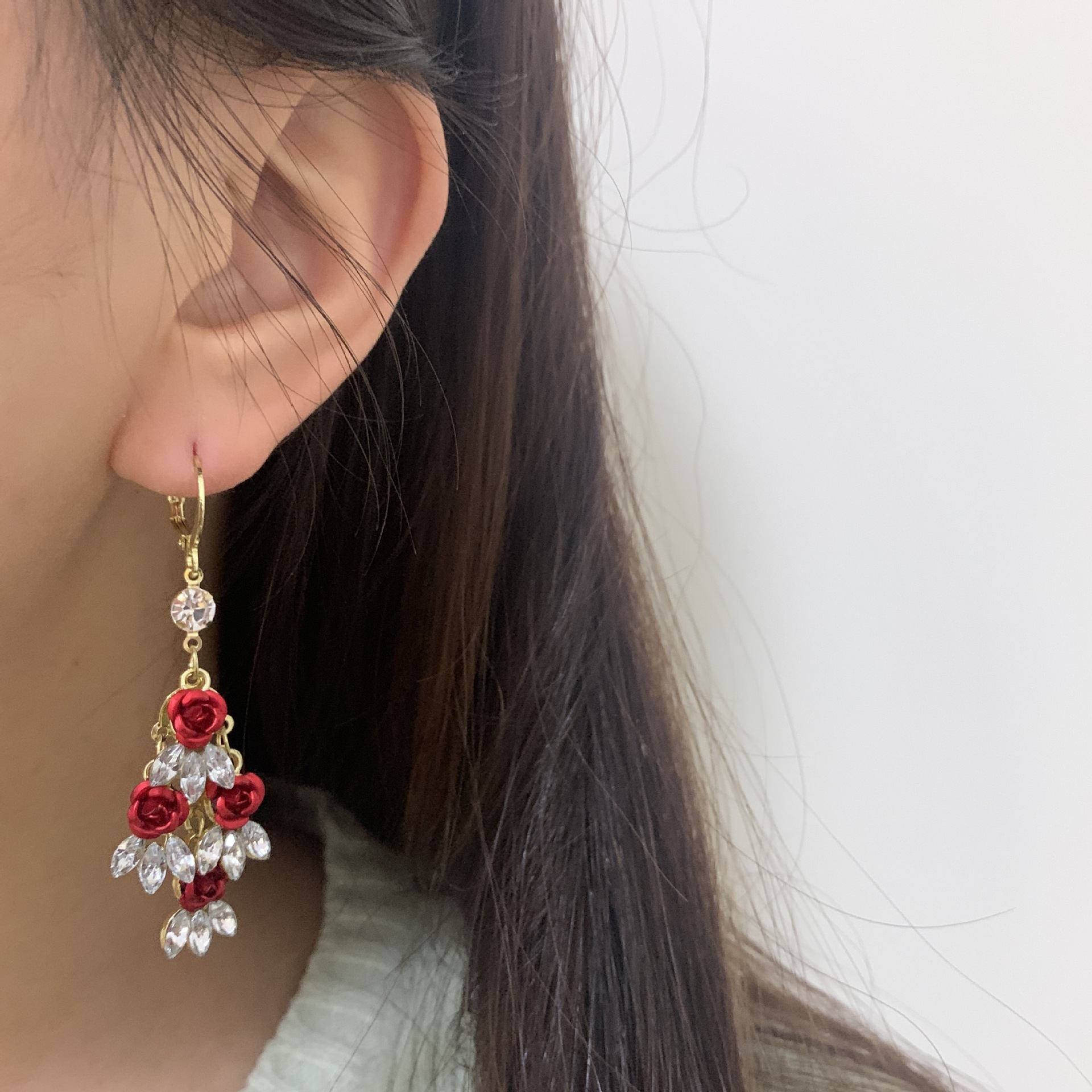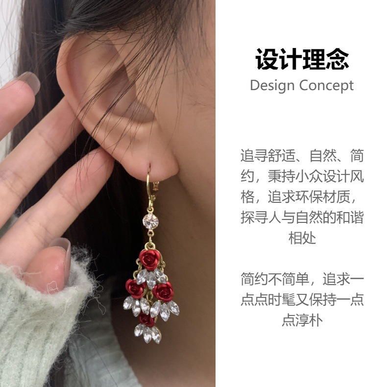 高级感红色玫瑰花锆石耳扣独特设计超仙浪耳环气质轻奢长款耳饰品 English | 投诉