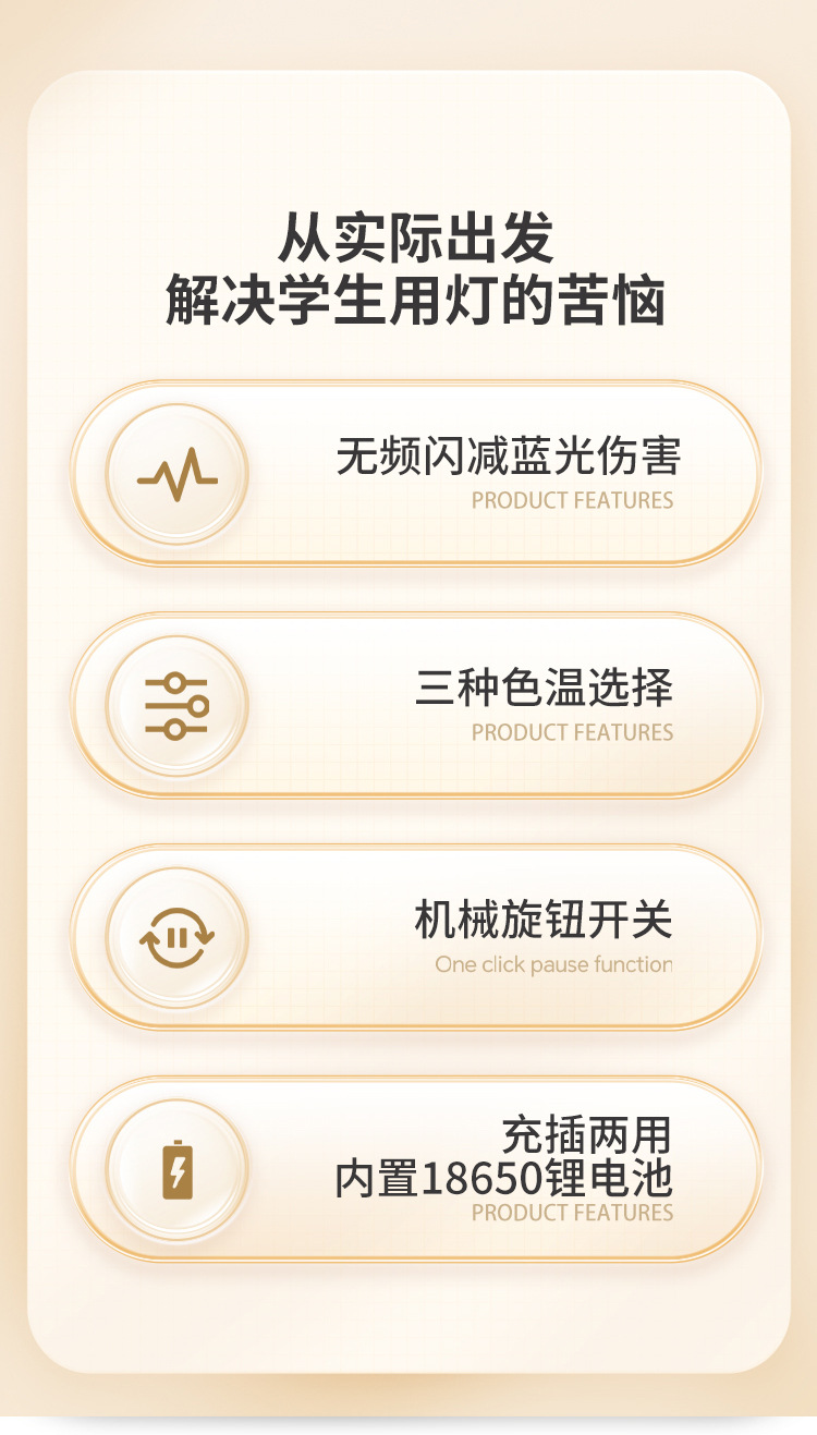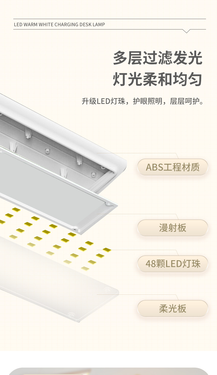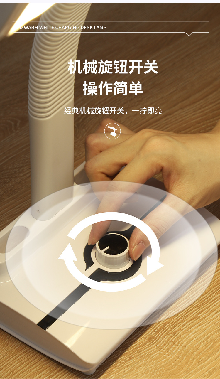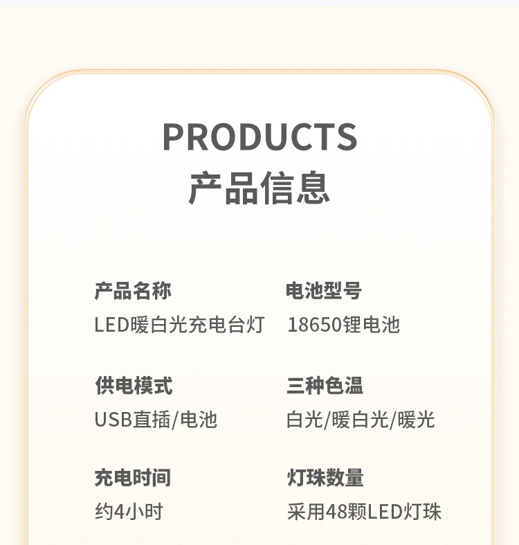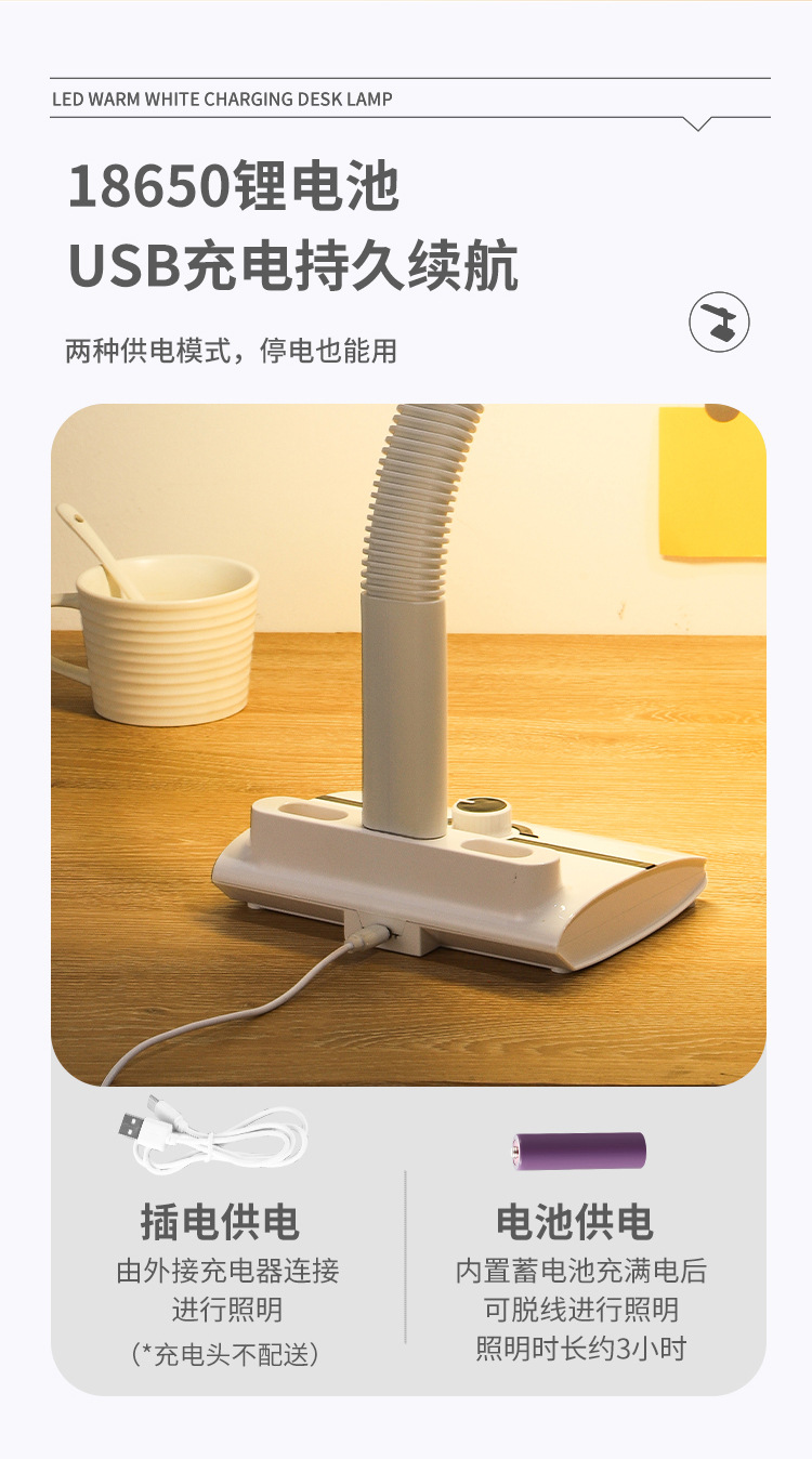 【产品备注】:24个白灯 24个暖黄的,配送1节3.7V 1500mAH 18650锂电池,配送1条0.8米TYPE-C USB线,机械旋钮调LED的色温,先白灯,再暖黄+白色,再暖黄灯,内置锂电池专用IC充电电路,带过充过放保护,电池充电时,相应指示灯会常亮,充饱充电指示灯会灭,充电安全可靠,可以边充边用,也可以不要电池直接插USB使用, 台灯最亮档能使用约3小时。