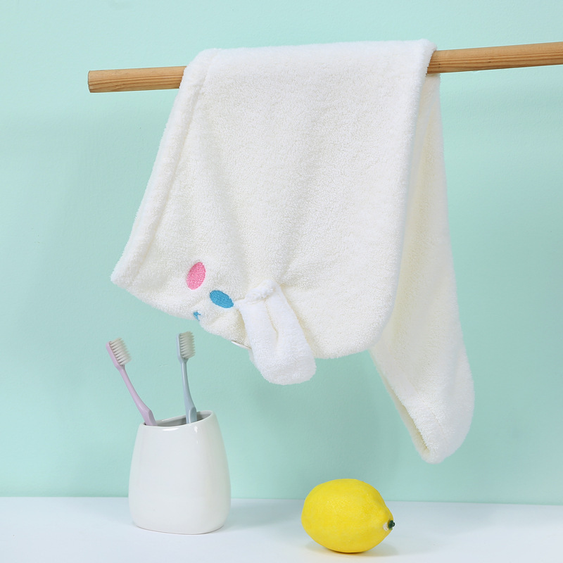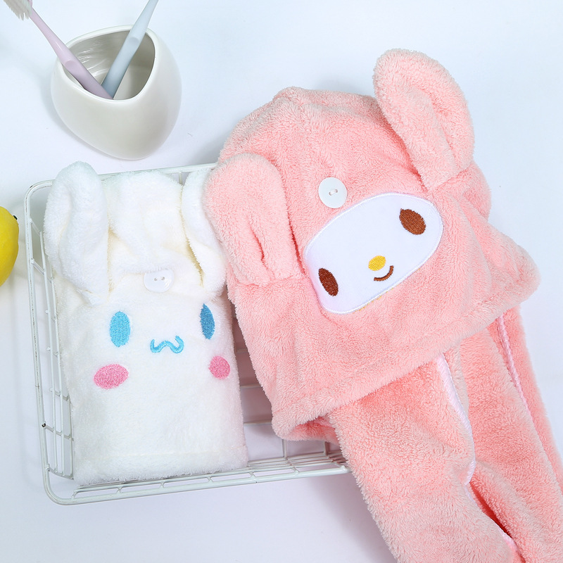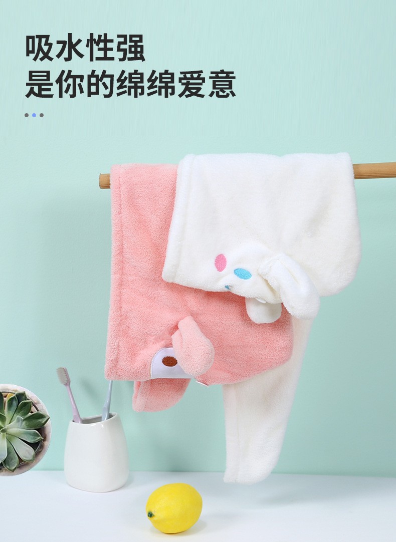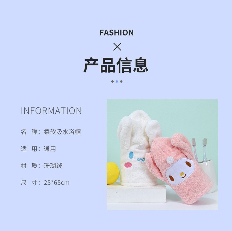 品牌: 恒度 材质: 珊瑚绒 货号: 长耳朵美乐蒂玉桂狗干发帽 加工定制: 是 颜色: 粉色美乐蒂,白色玉桂狗 规格(长*宽cm): 25*65cm 纱线规格: 150D 制作工艺: 绣花,包边 克重: 80-99g 重量: 0.75 kg/条